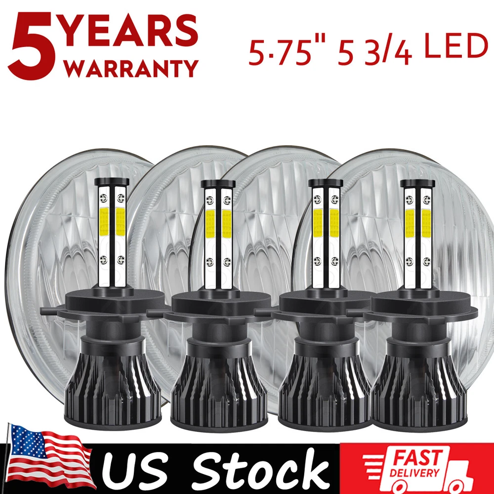 5-3/4"5.75 Round Stock Style H4 Conversion Headlights with Super Bright White LED Light Bulbs. Keep the Classic Look with Modern Light Brightness! Plug And Play! This listing is for a new set of 5 3/4" stock style glass lens - metal back headlight bulbs. This set includes (4) low/high beam headlights with high intensity LED light bulbs (no wiring or bucket modification needed). These have the original shaped prongs on the back so they will plug right into your original wiring harness plugs. These will fit any car or truck that has 4 round glass headlights. Will fit into stock buckets. Each bulb is 5 3/4 inches in diameter. These are glass and we will take extra care in packaging. Product Features: Dimension: 5.75 inch Housing Color:Black LED Type: White Material: Aluminum Housing, PMMA Lens Voltage: 10V-30V DC Color Temperature: 6000K Working Temperature: -40°C- 85°C Waterproof Protection: IP67 Interchange: H5009 / H5006 / H5506 / H5001 / 4001 Specification: 100% Brand New in the box with manufacturer packaging, never been installed before. LED LIGHT BULB Specifications and Features: Product Name: LED Headlight Bulbs Luminous flux: 10000LM Working voltage: DC9-32V IP rate: IP67 Wattage:55W Connector: H4 / 9003 (Low Beam and High Beam) Life Span: Above 50,000 Hours Color temperature: pure white 6000K Materia:Aviation aluminum profile Package Included: 4pcs 5.75" 5-3/4" headlight Housing 4pcs H4/9003 High & Low Beam LED Bulbs Note: 1. Please check the size of your bulbs on your vehicle before purchasing. 2. Please make sure the headlight housing has enough space for installation before purchasing.