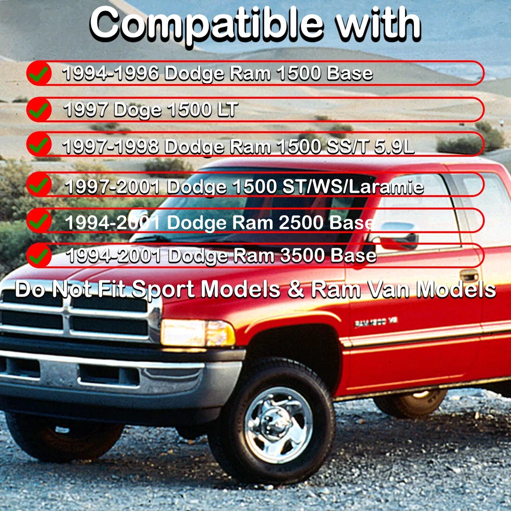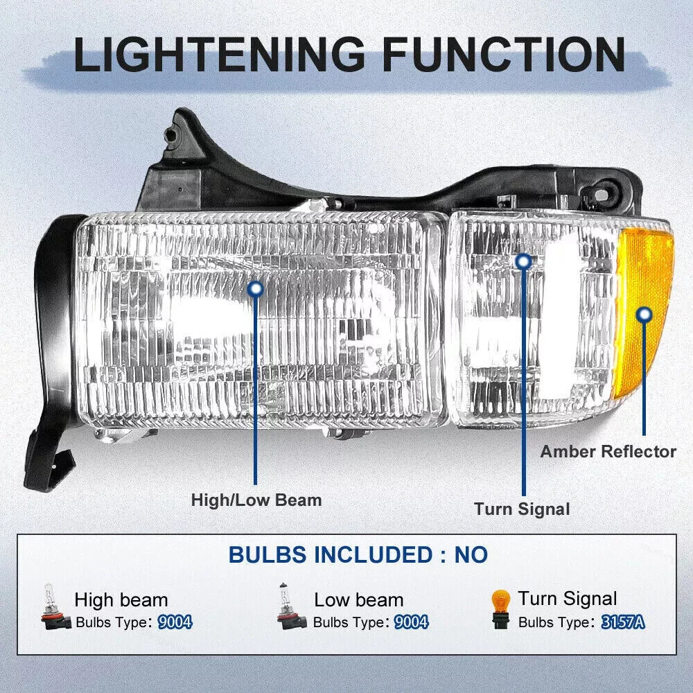 Fitment: 1994-1996 Dodge Ram 1500Base 1997 Dodge 1500LT 1997-1998 Dodge Ram 1500 SS/T 5.9L 1997-2001 Dodge 1500 ST/WS/Laramie 1994-2001 Dodge Ram 2500 Base 1994-2001 Dodge Ram 3500 Base Not Fit Sport Models & Ram Van Models Package Include: A Pair of Headlights Assembly(Bulbs are Included) On Jun 5, 2024 at 18:31:04 PDT, seller added the following information: On Jun 5, 2024 at 23:07:11 PDT, seller added the following information: On Jun 15, 2024 at 16:35:06 PDT, seller added the following information: On Dec 2, 2024 at 22:13:54 PST, seller added the following information: