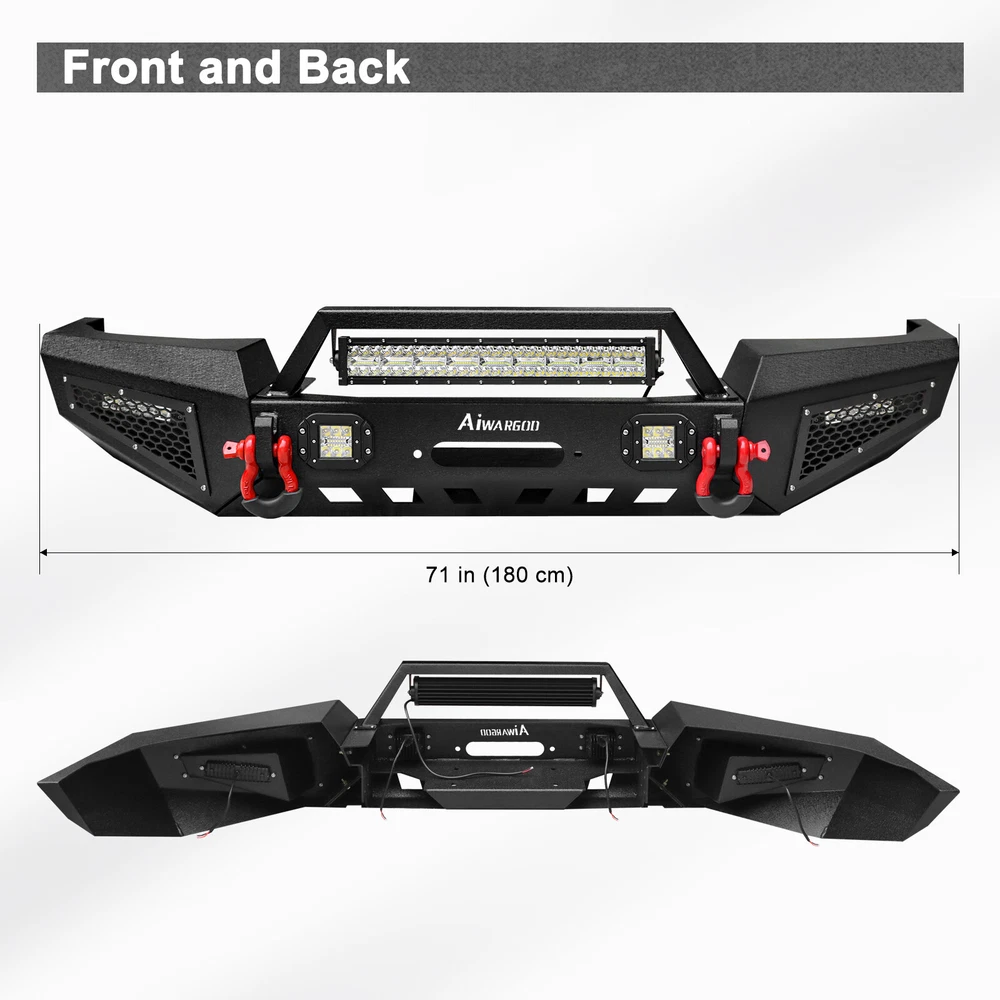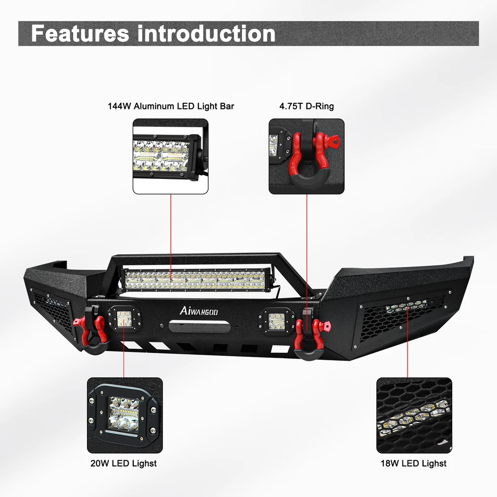Style:Perfect for Off-Roading ProtectionUPC:Does not applyPlacement on Vehicle:FrontBrand:AaiwaFinish:Powder CoatedPackage Included:Front Bumper & Led lights & D-ringsColor:BlackOE Spec or Performance/Custom:Performance/CustomFeatures:Mounting Hardware Included, Led Lights & D-rings IncludedMaterial:Stainless SteelBumper Cut-out:Towing Hitch Cut-outConstruction:Heavy Duty High Tensile Steelgtin13:Does not applyManufacturer Part Number:Does Not ApplyManufacturer Warranty:3 YearsFitment Type:Direct ReplacementFitment:for 1999-2004 Jeep Grand Cherokee WJType:Bumper Protector