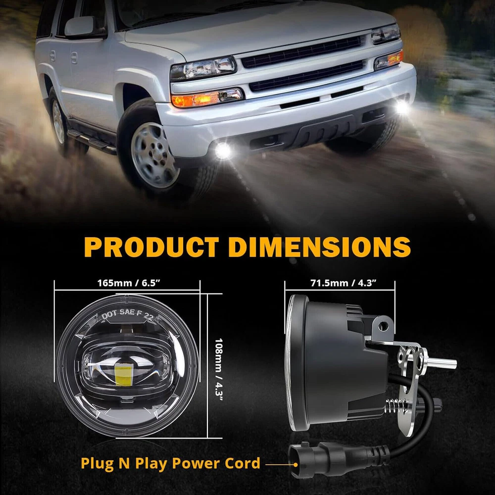 Wattage: 19 W Lumen: 1064lm Fitment Type: Direct Replacement Brand: Z-sumhiclite Fitment: For 2001-2006 Chevy Suburban Tahoe Z71 Lumens: 1064lm Light Color: Cold White Placement on Vehicle: Left, Right OE/OEM Part Number: Does not apply Features: DOT-Certified, SAE-Certified, Sealed Assembly, Projector Housing Power: 19W Depth: 118.9mm/ 4.68 inch Interchange Part Number: 16530218, GM2592121 Housing Material: Die-cast Aluminum Alloy Outer Lens Material: PC Bulb Shape Code: Does not apply Number of Bulbs: As pictures show gtin13: Does not apply Type: LED Fog Light Sold as a pair: Driver and passenger side Housing Color: Black Lens Color: Clear Certifications: DOT Lighting Technology: LED Manufacturer Part Number: Does not apply Color Temperature: 6500K Manufacturer Warranty: 1 Year Mounting Style: Plug and play Items Included: Bulbs Voltage: 12 V Diameter: 101mm/3.98 inch UPC: Does not apply