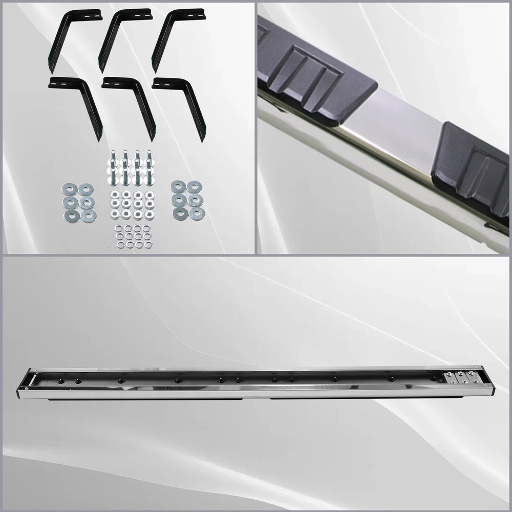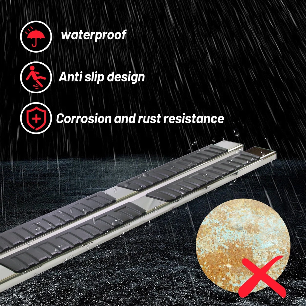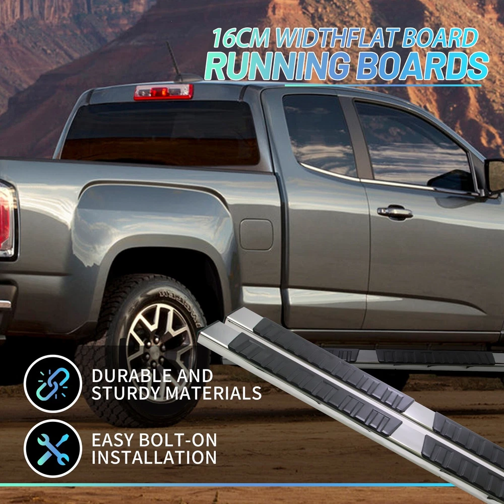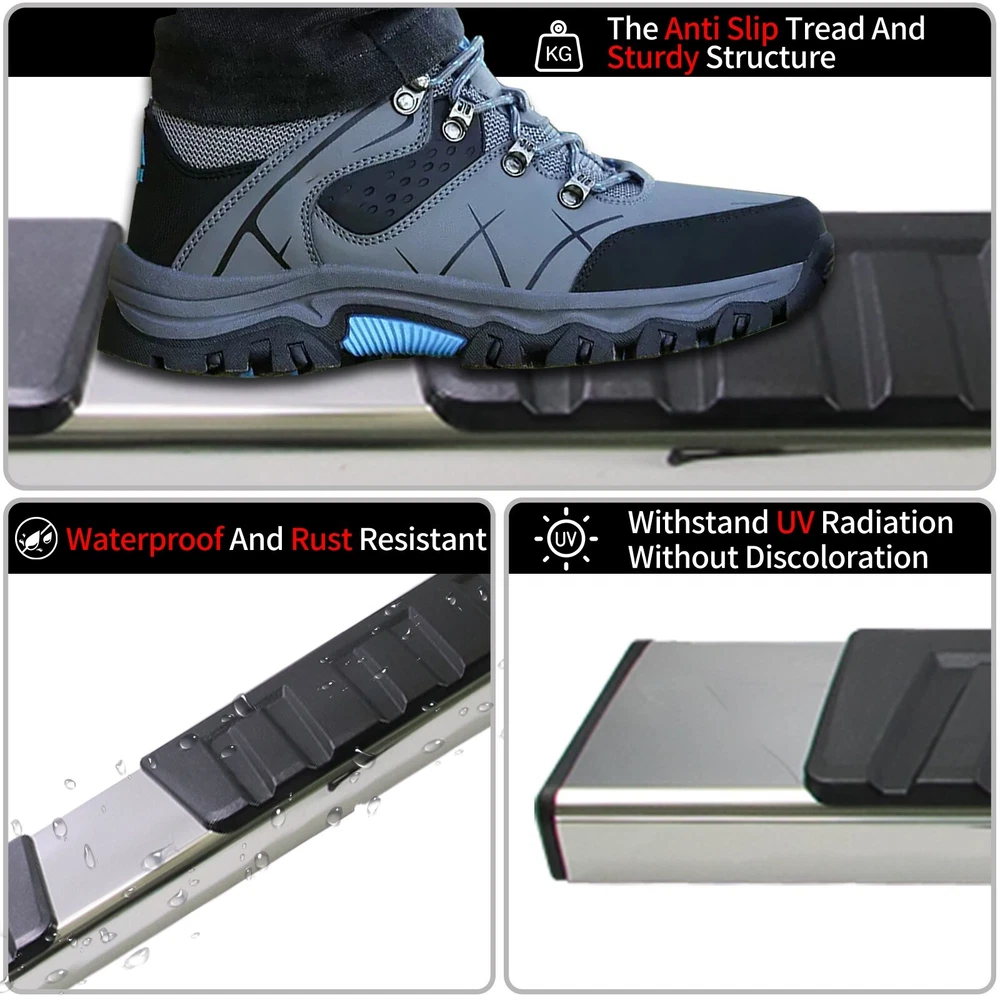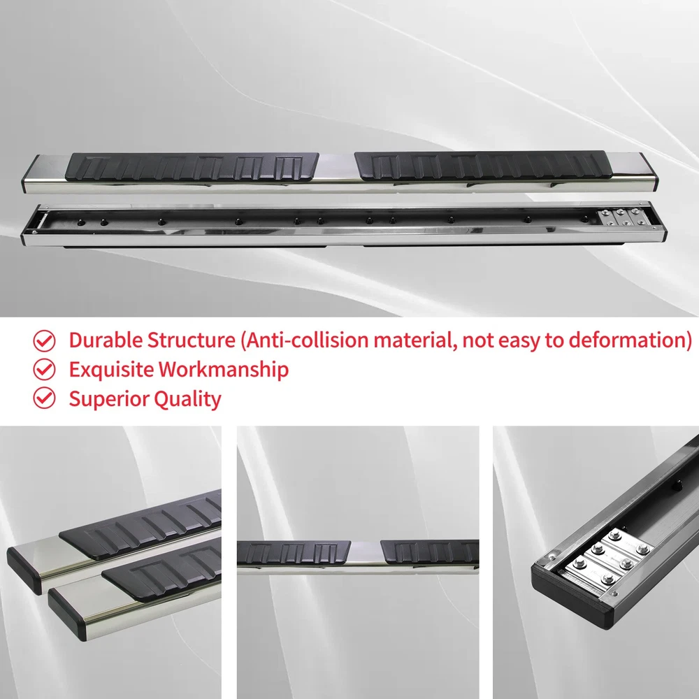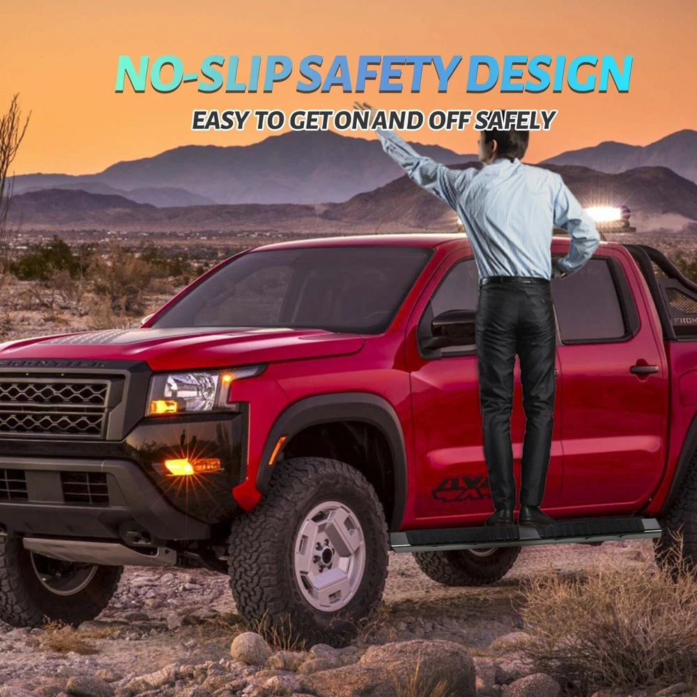 Specification Color: Silver Finish: polished Condition: New Package Weight(lbs): 6.39 Package Dimensions(LengthxWidthxHeight:inch): 83.85*8.19*8.97 Item Weight(lbs): 1.98 Item Size(LengthxWidthxHeight:inch): 83.06*7.41*8.19 Fitment Type: Direct Replacement Installation Instruction: Not Included Manufacturer Warranty: 1 Year Sealing End Cover: Yes Package Include: 1x Pair of Running Boards (Left + Right) 4 Brackets on Each Side Mounting Hardware Style: OE Style Only Fit: Crew Cab Placement on Vehicle: Left+Right Material: ABS, Stainless Steel Manufacturer Warranty: 1 Year Fitment 2005-2023 Nissan Frontier Features & Benefits 1. Made with durable, heavy-duty high light stainless steel and ABS plastic. Seamless joined ABS plastic tread with powder coated body surface to achieve great UV rays, rust, and slippery resistance. 2. Our running boards are made from the finest aluminum alloy, which is sturdy, durable, wear-resistant and rust-resistant. After repeated tests, they can resist the corrosion of salt spray, and withstand UV radiation without discoloration. 3. To a certain extent, they also help protect the paint on the side of the car from being scratched. At the same time, you can easily reach the top of your car when you need it, such as accessing the luggage rack or cleaning the rooftop. 4. Slider Design, Able to adjust position on vehicle forward & backwards for better customization. the whole closed end design make your running board inside clean. 5. Whatever finish you choose, the result is a smooth, finished look that complements your factory chrome and trim perfectly. 6. Running Boards & Side Steps make your life safe and simple for taking your coworkers to the job place, take your pets go out or carpooling the kids to school both. You have a very solid under foot feeling thanks to the Anti-slip tread surface and rugged construction. 7. Easy bolt-on installation: No cutting or drilling. On Nov 18, 2024 at 02:21:23 PST, seller added the following information: On Nov 22, 2024 at 01:59:10 PST, seller added the following information: