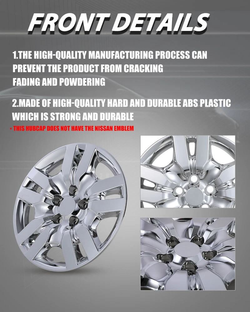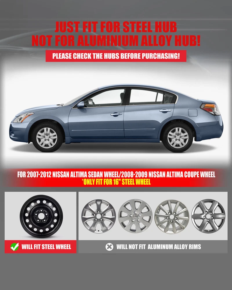 Home Payment Shipping Return Policy About Us Contact Us Feedback Title Other Car Refrigerator Front Bumper Rear Bumper Fender Flares Inner Fenders Side Steps Running Board A-Pillar Light Mount Brackets Headlights For Ford For Dodge For Chevrolet For Toyota For Mitsubishi Taillights For Chevrolet For Toyota For Ford For Jeep For Dodge For Honda For Nissan For Cadillac Fog Lights For Jeep For Dodge For Chrysler For Ford For Toyota For Chevrolet For Nissan For Lexus For GMC For Cadillac For BMW For Mercedes Benz LED Headlights For Ford For Dodge For Chevrolet For Toyota LED Taillights For Toyota For Chevrolet For Ford For Jeep For GMC For Honda For Cadillac LED Fog Lights For Toyota For Ford For Chevrolet For Mercedes Benz Jeep Headlights Tail Lights Fog Lights Refrigerator Bumper Fender Flares Inner Fenders A Pillar Light Mount Brackets Side Step More Chevrolet Headlights Tail Lights Fog Lights Refrigerator Bumper Ford Headlights Tail Lights Fog Lights Refrigerator Bumper Toyota Headlights Tail Lights Fog Lights Refrigerator Bumper Dodge Headlights Tail Lights Fog Lights Refrigerator Bumper GMC Headlights Tail Lights Fog Lights Refrigerator Bumper Wheel Covers Features ✴ PERFECT FIT: This wheel hub cap is specifically designed to perfectly fit for 16-inch wheels, ensuring a seamless match and enhanced aesthetics. It complements the overall design of the vehicle, elevating its visual appeal. ✴ HIGH-QUALITY MATERIAL: Constructed from high-quality materials, this wheel hub cap guarantees durability and longevity. It withstands various road conditions and environmental factors encountered during daily driving, maintaining its pristine condition. ✴ EASY INSTALLATION: Installing this wheel hub cap is a breeze and requires no specialized tools or modifications. It comes with a user-friendly system, allowing for a hassle-free installation process by following the provided instructions. ✴ PROTECTIVE FUNCTION: Besides its aesthetic appeal, this wheel hub cap serves as a protective barrier for the wheels. It prevents scratches and potential damage caused by stones, debris, or other objects, safeguarding the wheel's surface. ✴ AFTER-SALES SERVICE: If There Is a Loss of Product Parts, or Any Parts of The Problem, We Can Provide After-Sales Service, Please Contact Us on The Order Page. Wheel Covers Specification ✴ Type: Hub caps ✴ Number in Pack: 4 ✴ Color: Chrome ✴ Material: ABS ✴ Compatible Wheel Diameter: 16 in ✴ Finish: Glossy ✴ Installation Type: Bolt-On ✴ Model: For 2007-2012 Nissan Altima/2008-2009 Nissan Altima Coupe Wheel Covers Package ✴ 1 Set of 4 Hub caps and 4 retention rings Payment Delivery details Terms of sales About us Contact us Payment We accept PayPal, credit card , Apple Pay & Google Pay etc. Delivery details All items will be shipped within 1-3 business days after payment received, we will try our best to ship out as soon as we can, hope for your understanding. Please double confirm your address and contact information, which will help the delivery faster and more accurately. Note :buyers who purchase international products need to pay import tariffs!!! Terms of sales Professional installation is highly recommended. Any problem of the item please feel free to contact us first , please D o Not leave negative feedback before that, or simply return it within 60 Days in original condition. We will resolve it for you ASAP. About us Any questions please do not hesitate to contact us directly by eBay message . We will reply you within 24 hours asap, thanks for your understanding. Contact us Should you have any problem or require any further information please feel free to contact us . If you are satisfied with our product and service, please kindly leave us a positive feedback. On Feb 10, 2025 at 00:49:59 PST, seller added the following information: