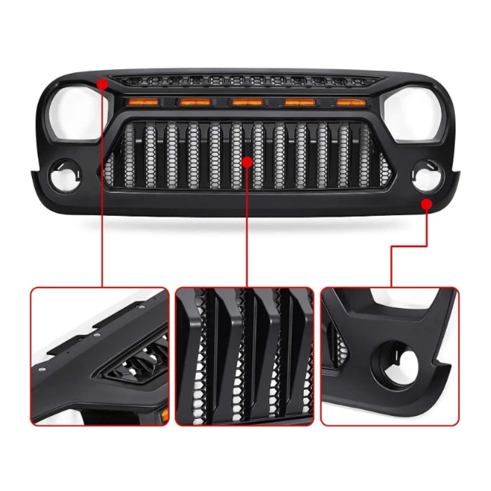 Product Features Comes with LED light to make your wrangle more cooler Replacement Grille fits for 2007-2017 JK High Quality Durable ABS Easy To Install, No Drilling Required Description Fitments : For Jeep Wrangler 2007- 2018 JK Features: Condition: 100% NEW Color: Black Material: High Quality ABS Installation: Designed to be a direct replacement for the original grille, this shark grille installs reusing the stock clips and mounting points. There is no cutting or modifications required for a clean, straight forward installation. Headlight Hole Cutouts The two holes for the headlights are not round, it is to highlight the angry style design. So it is not a quality problem if there is a gap between headlight and the grille. All is for shape desighn and style. Package includes: 1 x Matte Black Shark Grill 5 x Amber LED Lights 1 x Wiring Harness 1 x Installation manual 1 x Rubber Strip, and Clips