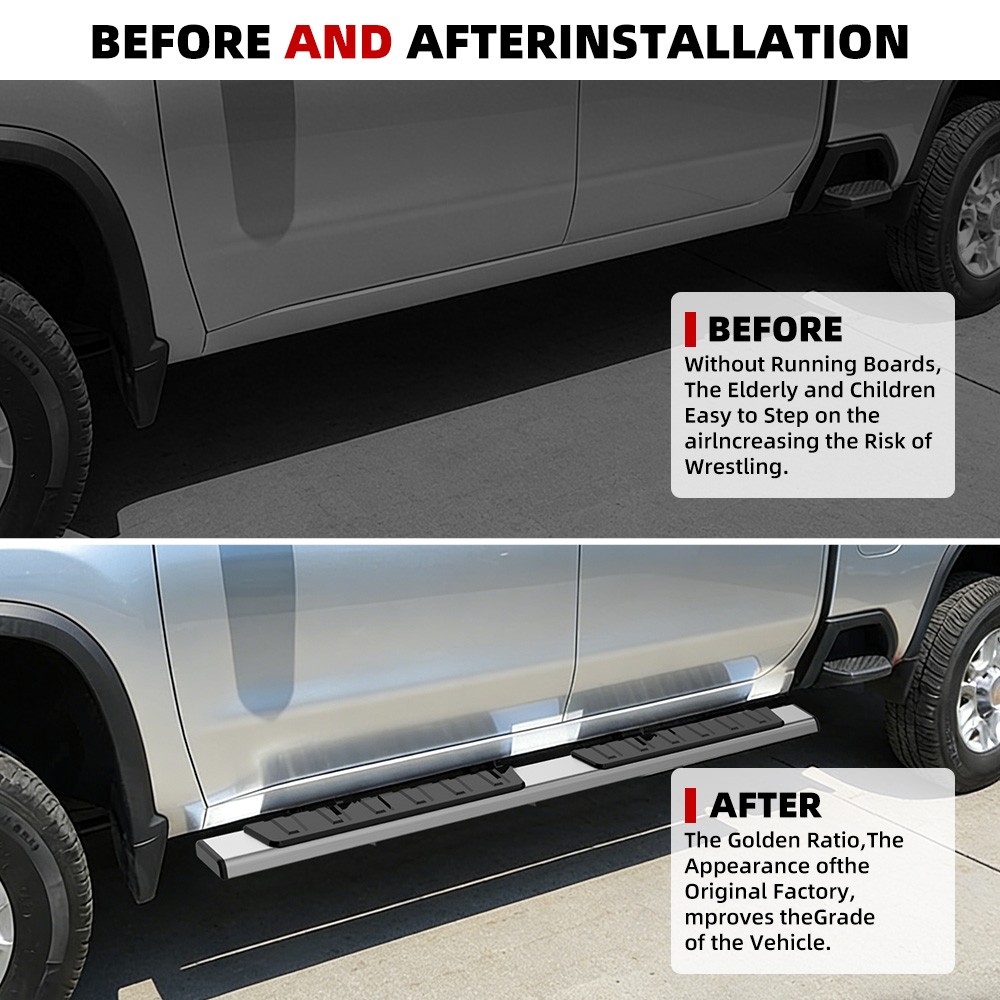 Product View Detail These running boards will elevate your vehicle's style and functionality to new heights. Combining a sleek aesthetic with rugged appeal, these innovative running boards are the perfect upgrade for your truck or SUV. Constructed with a high-quality aluminum alloy frame, these steps are built to withstand the harshest weather and the test of time. Their robust structure offers exceptional corrosion resistance. Oversized, molded anti-slip treads ensure a secure footing for effortless entry and exit. No drilling required! Mounting brackets snap directly into factory-provided holes for incredibly simple installation. Save valuable time and effort by avoiding drilling into your vehicle's body. Kit Includes: 2 Running Boards 2 Mounting Bracket Sets Installation hardware as shown Product Features: Durable rust-resistant stainless steel construction ABS plastic slip-resistant treads ABS plastic end caps Polished surface finish 550 lb weight capacity Simple drill-free installation—mounts directly to factory mounting points. Installation takes less than an hour on most vehicles. Includes vehicle-specific mounting brackets Important Notes: Compatible Models: 2009-2018 RAM 1500 2010-2022 RAM 2500/3500 Double Cab models 2019-2022 RAM 1500 Classic Double Cab models Please verify vehicle compatibility before purchase. If unsure, consult customer service. 100% Brand New Authentic Product Professional installation is strongly recommended Installation instructions not included Shipping Policy Payment Method Returns Policy Shipping Policy Payment Method Returns Policy Copyright © 2017 DataCaciques Home Payment Shipping About us Contact us Store Categories Store Categories Tractor Heavy Duty Attachment Automotive Tools &Supplies Livestock supplies Business & Industrial Other Product View Detail These running boards will elevate your vehicle's style and functionality to new heights. Combining a sleek aesthetic with rugged appeal, these innovative running boards are the perfect upgrade for your truck or SUV. Constructed with a high-quality aluminum alloy frame, these steps are built to withstand the harshest weather and the test of time. Their robust structure offers exceptional corrosion resistance. Oversized, molded anti-slip treads ensure a secure footing for effortless entry and exit. No drilling required! Mounting brackets snap directly into factory-provided holes for incredibly simple installation. Save valuable time and effort by avoiding drilling into your vehicle's body. Kit Includes: 2 Running Boards 2 Mounting Bracket Sets Installation hardware as shown Product Features: Durable rust-resistant stainless steel construction ABS plastic slip-resistant treads ABS plastic end caps Polished surface finish 550 lb weight capacity Simple drill-free installation—mounts directly to factory mounting points. Installation takes less than an hour on most vehicles. Includes vehicle-specific mounting brackets Important Notes: Compatible Models: 2009-2018 RAM 1500 2010-2022 RAM 2500/3500 Double Cab models 2019-2022 RAM 1500 Classic Double Cab models Please verify vehicle compatibility before purchase. If unsure, consult customer service. 100% Brand New Authentic Product Professional installation is strongly recommended Installation instructions not included Shipping Policy Payment Method Returns Policy ABOUT US Shipping Policy Ships within 24 hours of payment Delivered using FedEx Ground or FedEx Home Delivery Ships from a warehouse close by Delivered within 3-7 days Product... Payment Method We accept PayPal payment,PayPal Credit,Credit card or debit card and so on.Payment should be completed within 4 (Four) days of auction closing. Or unpaid dispute will be filed for closing auction.We will leave a positive feedback immediately after payment is received. We appreciate a positive feedback as much as you do. If for some reason there is any issue with the purchase, please contact us prior to leaving feedback, we will be glad to work together and provide a satisfying solution. Returns Policy Receive the product has problems or did not receive the product the first time to contact us to solve the problem for you they provide free returns do not need to seller to pay the shipping costs do not worry about the product in the transportation process problems ABOUT US Welcome to our eBay store. As a leading and emerging company in manufacturer and exporting business, we are specialized in Business and Industrial Products, Sporting Goods, Pet Products, Home and Garden products for more than 10 years. We believe that it is our vision and mission to provide innovative products with best service and competitive price to satisfy you. Our goal is to make sure that you can find exactly what you are looking for and make it easy for you to place your orders.