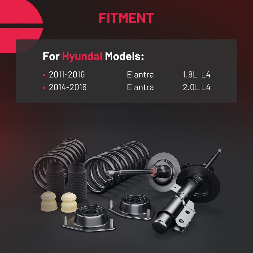 About this item VEHICLE FITMENT: Fit for 2011 2012 2013 2014 2015 2016 for Hyundai Elantra REFERENCE NUMBER: Replaces Complete Strut Assembly NO# 172708 / 554384 / 5671 KIT INCLUDES: 2x Front complete struts with coil springs + 2x Rear gas shocks absorbers (Driver and Passenger Side EASY INSTALLATION: Fully-assembled unit includes everything you need for strut replacement. No need for coil spring compressor and special tools PURCHASE NOTES: 1.Please check your vehicle YEAR.MAKE.MODEL with our description to avoid buying a wrong type for your vehicle; 2.Due to overwight or oversized,set of 4 struts will be packaged by TWO parcel sometimes For 2011-2016 Hyundai Elantra Front Complete Struts Rear Shocks Springs Assembly Front Struts & Coil Spring Assembly + Rear Shock Absorbers Kit Kit Includes: 1x Front Strut & Coil Spring Assembly - Driver Side - 172709 1x Front Strut & Coil Spring Assembly - Passenger Side - 172708 2x Rear Shock Absorbers - Driver & Passenger Side - 45671 Each Strut Assembly includes: Strut Coil Spring Boot Bumper Kit Spring Seat Isolator FITS MAKE MODEL YEAR RANGE SPECIFIC DETAILS HYUNDAI ELANTRA 2011 - 2013 GLS; Limited HYUNDAI ELANTRA 2014 - 2016 All Models Payment Delivery details Terms of sales About us Contact us Payment 1.We only accept PayPal. PayPal is the only online payment method we accept. Please make sure you have a valid/confirmed PayPal account prior bidding. 2.All Paypal Payments must be Confirmed. Payment must be made within 48hrs of the auction end time. Non-Paying bidders will be reported. 3.When you get your package,maybe you will pay some charges, it's taxes for local customs,not pay to us, and the fees are depends on the customs, all buyer are same. Delivery details 1.Items will be shipped within 2 business days after payment is received. 2.We ship to your eBay address. Please make sure your eBay address is correct. Buyer takes responsibility if eBay address is wrong. 3.Import duties, taxes and charges are not included in the item price or shipping charges. Please check with your country customs office for these additional charges. 4.We shipping using UPS or USPS from our nearest warehouse to you. Tracking numbers will be emailed upon shipment. Terms of sales 1.Please feel free to email us if you have any question. 2.We appreciate you contact us via eBay message when you are not satisfied rather than open case or leave negative feedback directly. We'll try our best to solve the issue. 3.Refund will be issued once we receive your returned items. Buyer is responsible for all return shipping charges. 4.Please contact us for return process before you return the item. 5.All items for exchange or refund must be returned in "as new" condition. About us We are the responsible seller ,always provide high-quality products and best service .If you have any questions, please contact us, and will try our best to help you. Please contact us by eBay Message, and we will reply you within 24 hours. Thank you very much! Contact us We are the professional auto parts manufacturer , and provide line lock, AN hose end fittings , fuel line , fuel filter , fuel regulator , exhaust cutout , exhaust tips , exhaust muffler and so on .The quality of the product to be secured. If you have any questions or any needs , please contact us , and will try our best to help you.