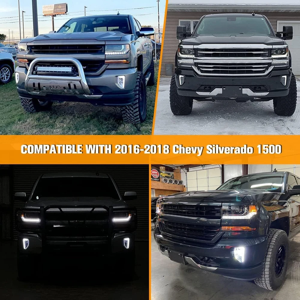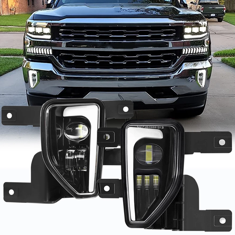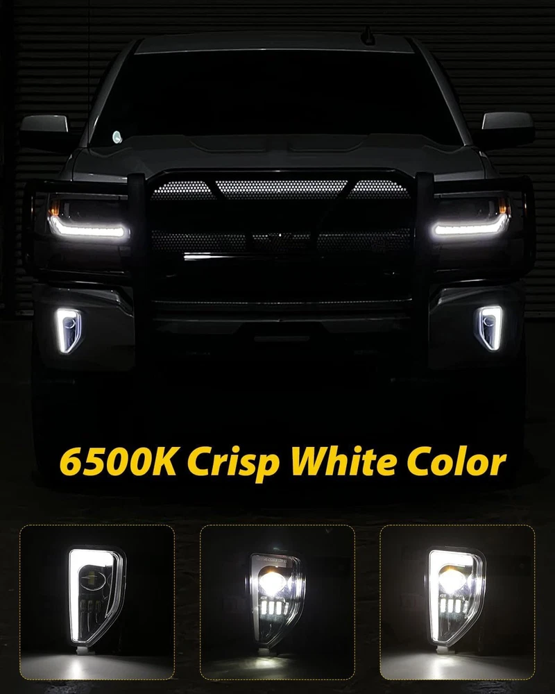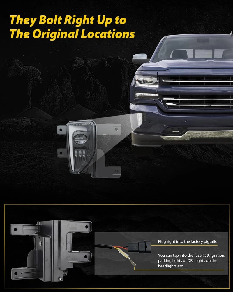DESCRIPTION Height: 184.2mm/ 7.25inch Width: 229.1mm/ 9.02inch Depth: 143.8mm/ 5.66inch Color Temperature: 6500K Halo Voltage: 12V DC Fog Lights Input Voltage:12V DC Theoretical Power:45W Lumen: 2000LM/each, 4000LM/set Outer Lens Material: PC Housing Material: Die-cast Aluminum Housing Color: Black Outer Lens Color: Clear Inner Bezel Color: Black Waterproof Rate: IP67 Certification: DOT, SAE FEATURES DOT Compliant Lamps-- These led fog lights are REAL DOT Approved , Certified DOT ID on the lens. Meets or Exceeds all Regulation in the U.S. & Canada. Legal on the road. Super Bright with DRL Functions-- High Intensity LED Chips to give out 6500K Cool white. Up to 4000lm a set of Fog Lights, effectively enhance the visibility on daytime or nighttime driving, Special 7-shape DRL features a new stylish look to your truck and extra illumination. Well-Made Construction-- IP67 Waterproof Rating Fog Lamps. Made with Non-fading Pure PC Lens and Sturdy Aluminum Alloy housing. High Resistant to Water, Impact, And Corrosion, Long Lasting. 100% OEM size-- 1:1 same size as stock lights. The LED fog lights are perfectly fit for the 2016-2018 Chevy Silverado 1500 truck.The fog lights kit features bolt-on installation that makes installation easier. With a DRL design. Looks better and brighter. Easy Installation-- Comes as a set with necessary connectors and everything you need to install. Less than 20 minutes install. Note: Please used the included adapter harness to plug right into the factory pigtails when installing the fog lights. The separate yellow wire is the positive"+" for the daytime running light. ) There is TWO way to CONNECT the DRL WIRES: 1. Run the yellow wire "+" of the DRL to the positive of the front position light, the DRL will be on with the position light. 2. Use a Circuit Fuse Tap(10A) and plug it into the fuse box. ----Run a wire to each light then joined them into one wire running to the fuse box. You could tap into that with a fuse tap . FITMENTS For 2016 2017 2018 Chevy Silverado 1500 Models Only Interchange Part Number:Replace for 84000613, 84000614, GM2592315,GM2593315 PACKAGE INCLUDES 1 Pair of LED Fog Lights for 2016-2018 Chevy Silverado Fog Lights CUSTOMER REVIEWS Payment Shipping Returns Contact us Feedback Payment Payment methods : Payment is expected within 7 days of auction close. Unpaid Items will be forfeited per eBay . Immediate payment needs to be processed for items with Add to Cart option so that any promotional discounts can be applied to your order immediately. International Buyers – Please Note: a) Import duties, taxes and charges are not included in the item price or shipping charges. These charges are the buyer's responsibility. b) Please check with your country’s customs office to determine what these additional costs will be prior to bidding /bu ying. Shipping 1.All items will be shipped to your eBay Address .Please update your latest address when you check out,and please make sure to provide us with correct,precise and detailed shipping address. 2.If your shipping address and the item location both are US, it will be shipped by USPS or UPS. All items will ship within 1-2 business days after the we receiving clear payment. 3.Service transit time is provided by the carrier. Transit times may be a little delayed during holiday season. 4.International order will be sent from China within 3 business day after the we receiving clear payment. ---For International Orders. Both are the same products and same warranty. Duties and taxes may apply. Please check with your country's custom and eBay policy for more information. 5.Where is my tracking number? Please log on your account, click "my eBay"-->"my summary", or open your email box and find the shipping notification email. Returns Our 30 days Satisfaction Guarantee assures our customers that they will receive all orders promptly and exactly as described. In addition, we offer FREE RETURNS for US buyers. It allows customers to return faulty and unused products for any reason within 30 days from the date of purchase. *Please contact us first before you sent a return request* The seller is responsible for all return shipping, including those due to customer errors or defective items. 1) If you receive an item that is incorrect, damaged, defective or not as described, please contact us for a partial/full refund or replacement. 2) If you want to return the item, please contact us within 30 days after receiving the package. 3) If you open a return request ,please select the reason for return: Doesn't fit/Changed my mind/Just didn't like it/Order by mistake. 4) We provide the 1 year of product warranty. If your product have quality problem within the warranty period, please contact us to provide repair or replacement services to you. Note: Return products must also be in its original condition: including box, packaging and all other accessories Contact us Our Working Time:(GMT+8)Monday to Friday,9:00-18:00. Have Question or Problem? Please contact us first! 1. We will reply you within 24 hours once we receive your email during business days. There will be some delay on response if you send message or E-Mail on weekend. 2. Describe your question clearly. We have a very professional and attentive customer support team. We will give you the best solution by our great communications. 3. We have always been trying to provide the best service and reliable product for every customer. However, sometimes may happen accident. Please contact us solve any issue before leaving a negative feedback. Feedback 1.We appreciate your business and strive to improve our customer service and our commitment to quality. 2.We will leave a positive feedback immediately after payment is received. We appreciate a positive feedback as much as you do. 3.If for some reason there is any issue with the purchase, please contact us prior to leaving feedback, and we will be glad to work with you to have it resolved.
