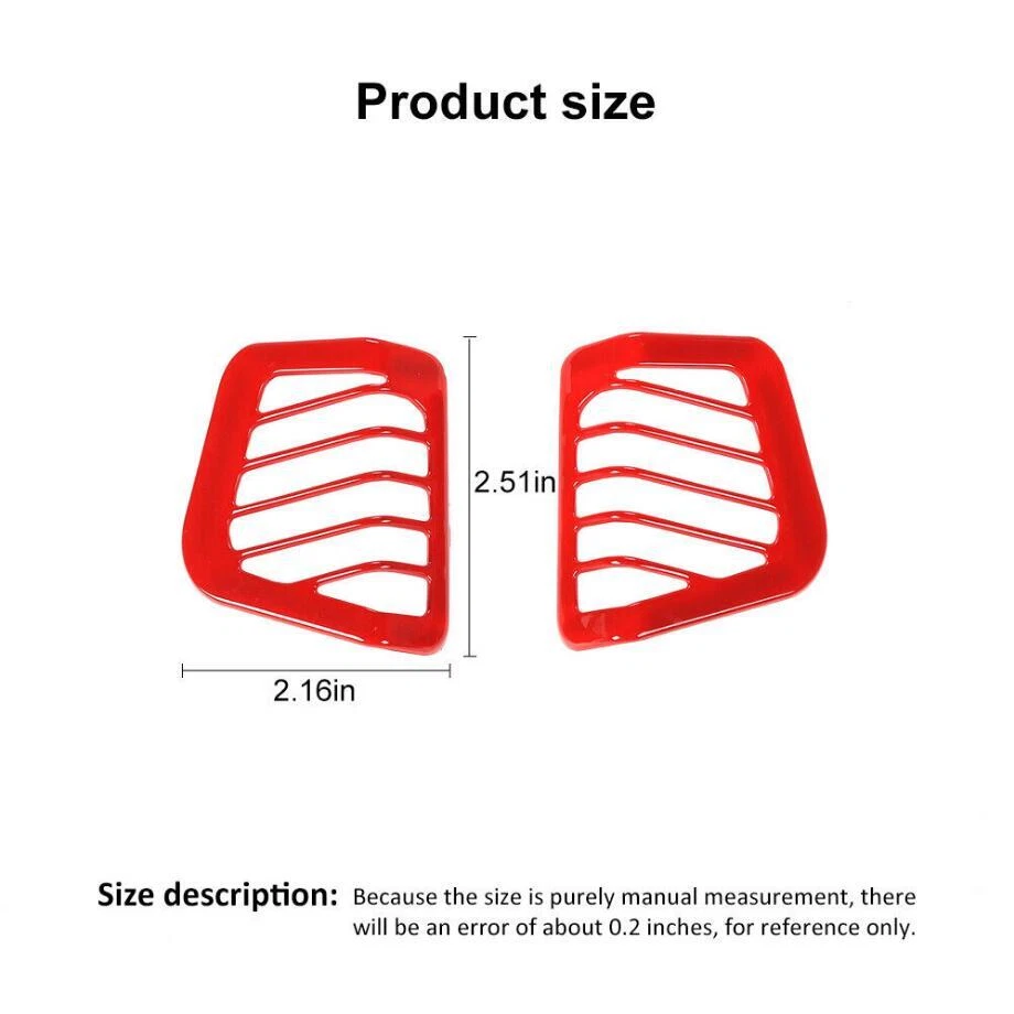 Fitment: Fit For Jeep Wrangler JL 2018-2023 Feature: Condition:100% Brand new Material: High Quality ABS Plastic Color: Red Package including:2PCS Made in a ISO9001 Factory,good quality and have been exported all over the world Easy installation.3M automotive adhesive tape is attached. INSTRUCTION MANUAL IS NOT INCLUDED For 2018-2023 Jeep Wrangler JL ABS Red Dashboard Side AC Air Vent Cover Trim 2P Fitment: Fit For Jeep Wrangler JL 2018-2023 Feature: Condition:100% Brand new Material: High Quality ABS Plastic Color: Red Package including:2PCS Made in a ISO9001 Factory,good quality and have been exported all over the world Easy installation.3M automotive adhesive tape is attached. INSTRUCTION MANUAL IS NOT INCLUDED Installation method: Step1: please clean the place with 50% alcohol to make sure no dust. Step2: remove the 3m glue in back; Step3 : heat the 3m glue by hot air gun;(A tip for putting on with supplied 3m tape is to warm the handles and the covers this makes the glue on the tape more sticky and they will stay on for ever!) Step 4: install the products in the right place ,Don't wash your car within 48hours. Customer Service If you cannot find the answers to your questions in this listing, please contact us , we will reply u ASAP,we will try our best to pleasure to serve u ! we hope have more happy and longtime shopping experience with u ! Shipping We will ship your order within 120 hours after receiving your verified payment (Excluding Weekends and Public Holidays) ! If u need delivery now , pls inform us , we will delivery it ASAP! shipping Shipping and handing Payment Refunds and returns About us shipping Country Approx / Delivery time United States : 8-25 working days United Kingdom / Australia / Canada : 20-35 working days Brazil / South America : may take up to 5-8 weeks due to strict Custom Inspection Italy / France / Spain / Germany/Eastern Europe : may take up to 6-8 weeks due to strict Custom Inspection Shipping and handing Item will be shipped within 24 -48 hours after full payment is received. · We ship worldwide with flat rate China Post , and other standard international shipping. this international order may take a longer time to arrive, Normally the shippment to worldwide is used to take 8 to 25 business days, exclude Weekend. Payment We accept PayPal only. Payment must be received in 7 business days of auction closing. Any special request cannot be accepted after 24 hours of payment, because most of orders will be processed instantly and same day dispatched. Refunds and returns Please contact us before leaving Netural or Negative feedback if you are not satisfied our service or products. Good communication is helpful for both of us to resolve any problems and issues. We are promising to try our best to provide the best service and 100% satisfaction for valuable buyer like you · All of the items are new. If it is not in new conditions, refund is offered. Otherwise, replacement can be offered for defective product. We will exchange or give the seller credit to buyer. · Please email us for all returns, and exchange shipping and handling charges are non-refundable. · Customers are responsible for return shippment fee except for wrong shipment or defective products. About us If you have any questions, please feel free to email our service specialists 24 Hours a Day, 7 Days a Week, and we will reply you ASAP. If no response within 24 Hours, please check the spam of mail box or kindly re-send it to us. We greatly appreciate your POSITIVE feedback. Please do NOT leave negative or neutral feedback without any contact. If you haven't received item in 30 days, please contact us and we will arrange refund. Advantage Will Never fade or rust Country/Region of Manufacture China Items Automotive > Exterior Accessories Approve Made in an ISO 9001 facility to ensure good quality Color Red Manufacturer Part Number Does Not Apply Placement on Vehicle Interior, Front, Left, Right Brand Unbranded Fitment Type Paste covering decorations Manufacturer Warranty 1 Year External Testing Certification ISO9001(ISO9001) Compatible with For Jeep Wrangler JL 2018-2023 Material High quality ABS plastic Features Beautiful & Scratch Resistant Finish Painted Type Hood Package include 2PIECES/SET