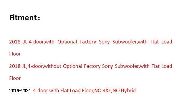 Number of Pieces: 1 Color: Black Brand: Unbranded Notice: Not for 4XE,Not for Hybrid #: 401171 For Car Years: for 2019-2024 4-door with Flat Load Floor Fitment Type: Direct Replacement Country/Region of Manufacture: China Material: TPO Fitment: for 2018 JL 4-door with Flat Load Floor Modified Item: No Feature2: Easy to clean and waterproof Feature1: Liners raised and strengthened lip for protects carpet floor Feature3: Custom design perfectly matched JL Body Style Type: Cargo Liner Placement on Vehicle: Cargo/Trunk
