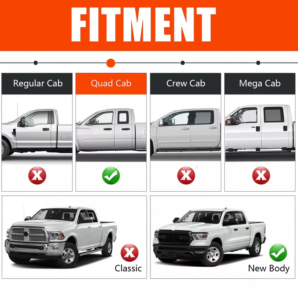 For 2019-2025 Ram 1500 Quad/Extended Cab Running Boards Drop Side Step Nerf Bars Fitment: For 2019-2025 Dodge Ram 1500 Quad Cab ( NOT for 2019-2025 Ram 1500 Classic Quad Cab) Features: Performant design merge extra-long drop steps with a rugged texture finish to achieve a distinct off-road look. These step bars help protect your truck rocker panels from debris and reduce collision impact to the doors. Fine textured powder coating offers exceptional rust and corrosion resistance so you can drive in any weather and on any road. Easy bolt-on installation & No drilling or cutting Required. High strength mounting bracket; each side can holds up to 500 lbs. Specification: Color: Black Material: Durable Carbon Steel Finish:Textured Black Powder-Coated Position : Left and Right Package included: Driver side & Passenger side steps bars Mounting brackets and hardware About us WANGXIAUTO specializes in providing premium automotive exterior accessories, including spoilers, wings, taillights, and pedals. With rigorous quality control and a focus on material integrity and durability, we ensure every product meets high standards of craftsmanship and compatibility. Customer-centric at our core, we offer expert purchasing support and reliable after-sales service to help every car owner achieve a safe and satisfying vehicle upgrade. Delivery details We ship all orders to the United States via FedEx Ground or Home Delivery. Please provide a physical street address for delivery, as FedEx cannot deliver to PO Boxes. Typical delivery time is 1-6 business days. For sales tax, eBay collects and remits applicable state sales tax for all U.S. orders in accordance with local regulations. For more details, please refer to eBay's help article "Taxes and import charges". Return details We offer a straightforward 90-day return policy from the date of purchase. Should you need to initiate a return or refund, please contact our customer service team within 5 business days of receiving the item. To help us assist you promptly, kindly provide a detailed description of the issue along with supporting photographs for verification. If the item is returned in its original, unused condition, you will receive a full refund with no restocking fees. Should your item arrive incorrect, damaged, or not as described, please contact us immediately. Our team is committed to working with you to promptly resolve any issues and ensure your complete satisfaction. Before completing your order, we strongly recommend confirming all item specifications to ensure compatibility with your vehicle. Our customer service team is available to assist with any product selection questions. Feedback If you're satisfied with your purchase, we'd be grateful if you could take a moment to leave us positive feedback - your support is very important to us! Please contact us before leaving neutral (3-star) or negative (1-2 star) feedback.We'll actively work to address the problem and strive to ensure your satisfaction. Contact us Our working hours are: US Eastern Standard Time | Sunday to Thursday | 21:00 pm to 7:00 am Orders and emails will be processed for you during this time, any questions you can leave a message to us, if we do not have the first time to give you an answer, we hope you can understand, we will be the first time to deal with your problems first when we are at work.