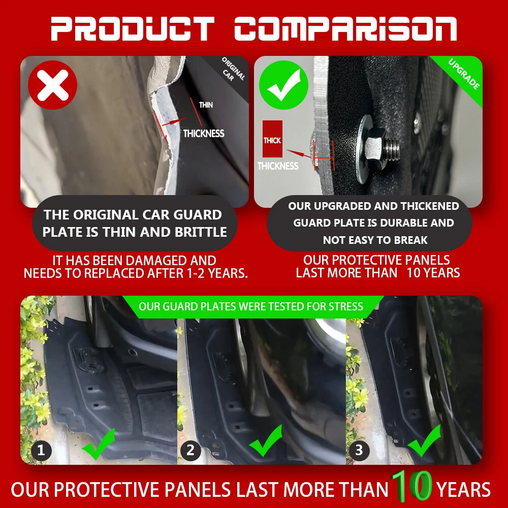 Product View Detail 1)Package Included: 1 X Engine Splash Shield ,Screw.Installation instructions 2)Material:Plastic steel Plastic steel is a kind of PVC profiles, due to its physical properties such as rigidity, flexibility, corrosion resistance, anti-aging performance, is usually used as copper, zinc, aluminum the best substitution.And is especially suitable for automobile chassis protect. 3)Better Than Original: The thickness is three times that of the original one. The original plate problem is that too thin ,broken down, easily falling off, and the hardness is not enough. To solve these problems,The new engine splash shield professionally designed . The steel beam design is to increase its hardness. 4)Wider Protection Range:it is Not 1:1 to the original Engine guard.Wider Size It is an upgrade to the original Engine guard.The new Engine guard covers a wider range. Provide wider and more robust protection. It will be larger, harder and more durable. 5)3-YEAR WARRANTY:Quality assurance We offer a 3-year quality warranty. it does not include damage caused by Human factors or External object impact. 6)EASY TO INSTALL :We provide installation instructions. Remove the original engine splash shield, Find the new screw hole ,Secure the new engine splash shield with screws. Suggest professional installation, under normal circumstances, do not need to drill holes.the car model changes, may need to drill holes. you can proactively contact us any question. We will reply within 24 hours(Excluding holidays ). Shipping Policy Payment Method Returns Policy Shipping Policy Please provide the correct address and phone number 1) We only ship to the confirmed address provided by eBay. Before you pay, please make sure your address in eBay matches the address you would like us to ship to. we must have your correct telephone number and address for express delivery to your door. Fast Shipping 2) For domestic shipments in the United States, we usually ship through FedEx, UPS, and USPS. Usually your goods will arrive within 1-7 working days. If you encounter a delay in the arrival of the goods, please contact us. 3) We ship to worldwide via international post airmail, FedEx,UPS,DHL The items will arrive to you about 5-15 days. I mport duties,taxes are not included in the item price or shipping charges, the buyers will be responsible for the taxes if necessary. Payment Method Returns Policy Copyright © 2017 DataCaciques Home Payment Shipping About us Contact us Product View Detail 1)Package Included: 1 X Engine Splash Shield ,Screw.Installation instructions 2)Material:Plastic steel Plastic steel is a kind of PVC profiles, due to its physical properties such as rigidity, flexibility, corrosion resistance, anti-aging performance, is usually used as copper, zinc, aluminum the best substitution.And is especially suitable for automobile chassis protect. 3)Better Than Original: The thickness is three times that of the original one. The original plate problem is that too thin ,broken down, easily falling off, and the hardness is not enough. To solve these problems,The new engine splash shield professionally designed . The steel beam design is to increase its hardness. 4)Wider Protection Range:it is Not 1:1 to the original Engine guard.Wider Size It is an upgrade to the original Engine guard.The new Engine guard covers a wider range. Provide wider and more robust protection. It will be larger, harder and more durable. 5)3-YEAR WARRANTY:Quality assurance We offer a 3-year quality warranty. it does not include damage caused by Human factors or External object impact. 6)EASY TO INSTALL :We provide installation instructions. Remove the original engine splash shield, Find the new screw hole ,Secure the new engine splash shield with screws. Suggest professional installation, under normal circumstances, do not need to drill holes.the car model changes, may need to drill holes. you can proactively contact us any question. We will reply within 24 hours(Excluding holidays ). Shipping Policy Payment Method Returns Policy Shipping Policy Please provide the correct address and phone number 1) We only ship to the confirmed address provided by eBay. Before you pay, please make sure your address in eBay matches the address you would like us to ship to. we must have your correct telephone number and address for express delivery to your door. Fast Shipping 2) For domestic shipments in the United States, we usually ship through FedEx, UPS, and USPS. Usually your goods will arrive within 1-7 working days. If you encounter a delay in the arrival of the goods, please contact us. 3) We ship to worldwide via international post airmail, FedEx,UPS,DHL The items will arrive to you about 5-15 days. I mport duties,taxes are not included in the item price or shipping charges, the buyers will be responsible for the taxes if necessary. Payment Method When you make a payment,please make sure the following information is included: . Name: . Full and Correct Address: . Post code: . Phone number: please make sure your address in ebay matches the address you would like us to ship to. Returns Policy 30 day free return. Please ensure that the product, accessories, and outer packaging are intact On Sep 2, 2024 at 22:46:09 PDT, seller added the following information: