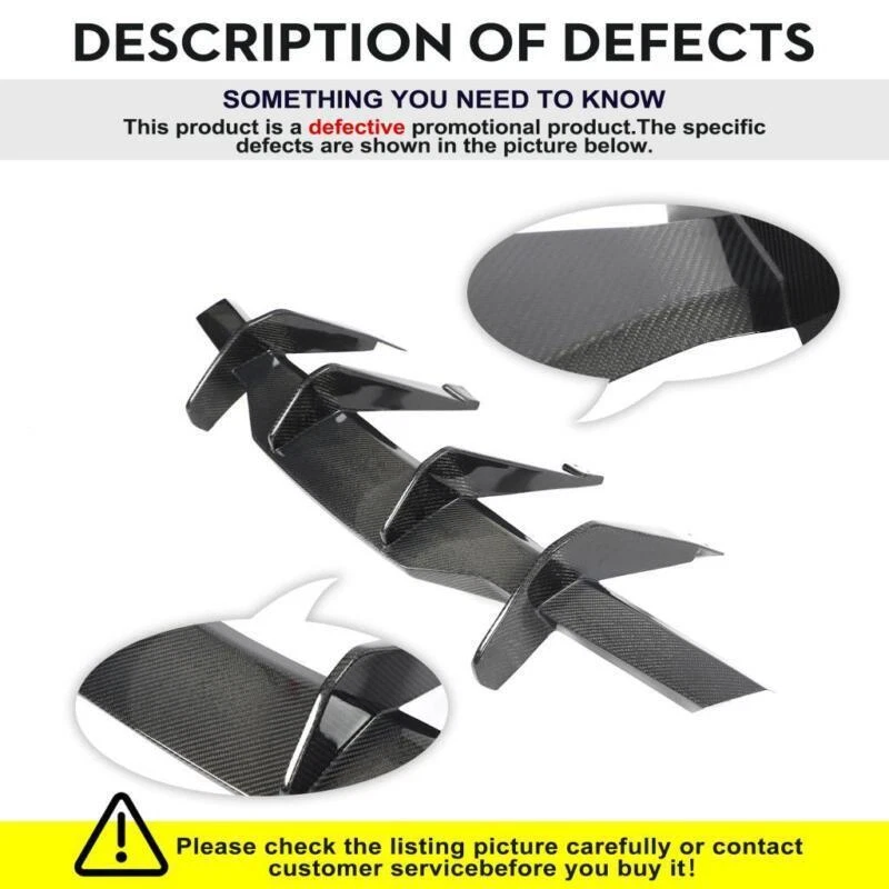 NOTE:This is a defective item clearance sale, the defects are mainly messy lines, please check the detail picture carefully before buying, no returns accepted. Fitment: Fit For Chevrolet Corvette C8 Stingray 2020-2022 Specifications: Product Name: Rear Bumper Lip Material: Carbon Fiber Features: • Made of High Quality Lightweight Carbon Fiber. • Improve the aerodynamic characteristics by enhancing the transition between the high-speed airflow below the vehicle and the free airflow in the surrounding atmosphere. • Provide space for the airflow under the vehicle to decelerate and expand, thereby providing pressure recovery by providing a degree of "wake fill" or more accurately. • Does not cause excessive airflow separation and resistance and keep driving safety. NOTE:This is a defective item clearance sale, the defects are mainly messy lines, please check the detail picture carefully before buying, no returns accepted. Fitment: Fit For Chevrolet Corvette C8 Stingray 2020-2022 Specifications: Product Name: Rear Bumper Lip Material: Carbon Fiber Features: • Made of High Quality Lightweight Carbon Fiber. • Improve the aerodynamic characteristics by enhancing the transition between the high-speed airflow below the vehicle and the free airflow in the surrounding atmosphere. • Provide space for the airflow under the vehicle to decelerate and expand, thereby providing pressure recovery by providing a degree of "wake fill" or more accurately. • Does not cause excessive airflow separation and resistance and keep driving safety. • Sport style rear diffuser, perfect for decoration, increase both road safety and racing style. Package included: • Car Rear Lip Bumper Body Kits • Mounting Accessories Delivery details Payment and TAX Return Policy Warranty Contact us Delivery details NOTE: The shipping fee is only for the mainland of each country, it does not include the overseas territories, such as Virgin Islands (U.S.) , Puerto Rico, Hawaii , French Reunion Island, etc. But on ebay, when buyers from Puerto Rico and overseas territories , the shipping fee is equal to United States, it is NOT correct,. please contact us for correct shipping fee, or we will cancel the order. Sorry for the inconvenience, and thanks for your cooperation. 2. If you want to upgrade the shipping, please contact us before making payment, we will revise the shipping fee. 3. We will ship according to your Ebay address. Please make sure it is correct and include phone number for delivery. If you want to know the exact shipping time , please contact us . Payment and TAX 1.We accept Multiple Payment Methods Available: Credit Card, Debit Card, Gift Card, Apple Pay, Goggle Pay, PayPal and PayPal Cred. 2.Please leave note for your special request (e.g. Colors or Size) in ebay note when you pay the order. 3.Your must complete the payment within 7 days or Ebay will automatically open unpaid item case For US Buyer:The invoice value of each item is less than 800USD ,so you no need to pay any tariff . NON-US Buyer Note: Most countries are tax free based on our invoices, if tax is required, which will be buyer's responsibility. Return Policy 1.Customer satisfaction is our top goal. We believe our items are so outstanding. All products are quality checked. They are new and in good condition when shipped to our customers. We are convinced you will be happy with your Purchase. 2.If product is defective or damage upon arrival, or wrong product shipped, please contact us immediately. Returns accepted within 30 days of delivery date and item must be in original new condition, not worn or altered in any way with attached tags & wrap. Otherwise deal is final. Return shipping must be paid by buyer. Please always contact us to resolve any problems, we will do our best to satisfy you. Thanks very much. Warranty 30 Days Money Back It is our goal to provide 100% satisfaction and peace of mind to our customers. If you are not satisfied with the products for any reason within 30 days of receiving the item. (Items must be not opened in their original package. Any mark of installation, mounting, cutting, scratch or using will not be allowed.) Please be free to contact us first if you have any problems.thanks. Contact us 1.We are trying our best to explain all details of the products here! If you have any question, please feel free to contact us by Ebay message, and We will get back to you within 24-48 hours. 2.Customer satisfaction is our NO.1 priority. If you are not happy with the item that you purchase, please contact us first. We will try our best to solve the problem with you.Please leave us a positive feedback if you receive the item.Please do not leave negative or neutral feedback without any contact.If you haven't received item in 30 days, please contact us and we will arrange refund.We appreciate your business.Happy Bidding & Have a nice day! 3.Working hours: From 8 a.m. to 6 p.m. from Monday to Friday. From 8 a.m. to 12 a.m. on Saturday morning Holiday/Rest time: Saturday afternoon and Sunday eBay Cross Border Trade powered by ChannelEffect