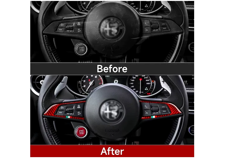 DEAR CUSTOMER, IF YOU NEED CONTACT US FIRST! NO RETURNS! THANK YOU! 2PCS Car Steering Wheel Cover Sticker Decal Carbon Fiber Trim Compatible with Alfa Romeo Giulia Stelvio 2017 2018 2019 Interior Accessories Models: 2016-2019 Alfa Romeo Giulia Stelvio Material:carbon fiber Number of pieces:2 pcs Mounting type self-adhesive