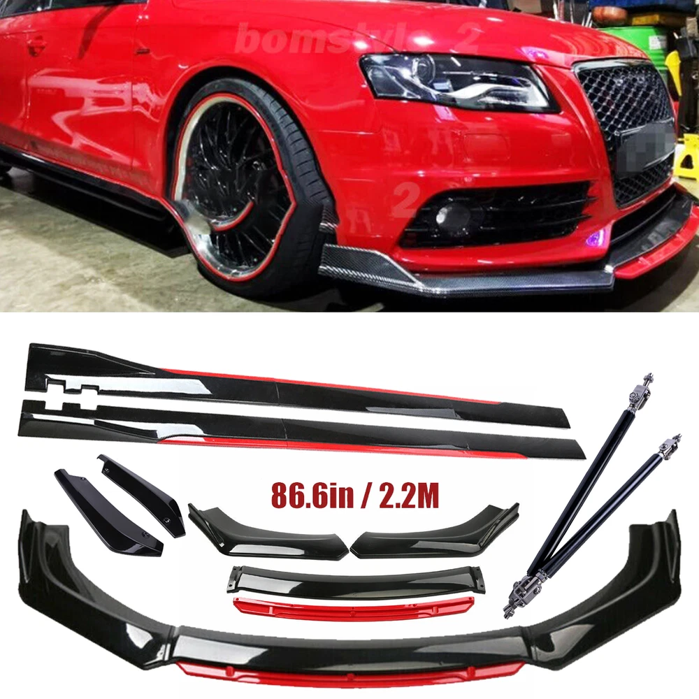 ackage 1. Front Bumper Lip Spoiler Splitter(5pcs) This front bumper lip splitter is fit for most models with front bumper size around 1750mm~1950mm. Feature: -Direct Fit. -Easy install and durable use. -Great quality and great Fitment. -Correct Connector No cutting or splicing. -Strict quality control standards to Build and test. -It'll give you a sporty look without making it too aggressive. -Light in weight and enduring, different optical line comes from different points of view. *Instruction Not Included, Professional Installation Is Highly Recommended.* Specification: -Type:Front Lip Chin Bumper Body Kit -Material:ABS -Color: Glossy Black +Red (as pictures show) -Placement on Vehicle:Front;;Lower -Fitment Type:Performance/Custom This front bumper lip body kit is suitable for most small cars and simple. And the flanks on both sides can be adjusted to make it more suitable for the width of the front of your car. Package 2. 2 x 86.6" Side Skirt Extension ( 6pcs ) Specification: Condition: 100% Brand New and High Quality Type: Car Body Side Skirts Material: Made of high quality PP plastic, Durable Color: Glossy Black +Red (as pictures show) Side Skirt Length: 86.6in / 2.2M Position: Side Skirt Extension Features: Universal modified side skirt for car sedan. While the side skirts don't affect the front ground clearance too much, it enhances the side extension of the in a very pure and exciting way. A Perfect Aftermarket Replacement. Professional Installation Is Highly Recommended. Package Included 3 Rear Lip Specification: Condition: 100% Brand New and High Quality Type: Car Body Rear Lip Material: Made of high quality PP plastic, Durable Color: Glossy Black (as pictures show) Surface Finish: Glossy Black Style Rear Lip Size:48cm/19“ Placement on Vehicle: Left, Right Package Included 4 2pcs Splitter Rods Material: premium quality aluminum alloy The length can be adjustable from 8" to 11" Fitment: Universal Note: Require drilling holes into the bumper lip diffuser to attach safely to the vehicle. Package Includes: 4 pcs /set Front Lip Chin Bumper Body Kits 2 x Side Skirts 2 x Rear Lip 2 X Splitter Strut Rods 1 x Screws kit Note: Installation instruction is not included, professional installation is recommended. Please allow 1-3CM differs due to manual measurement.