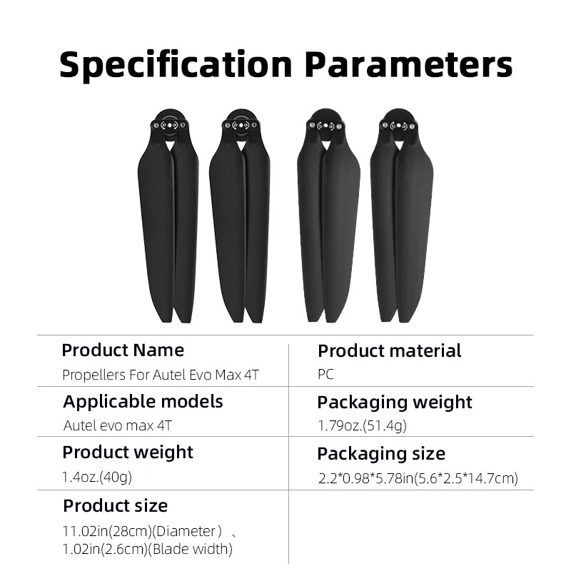 Product Description If you have any questions, please contact customer service first, do not open disputes easily, thank you! Feature: 1.High toughness materials with high aerodynamic efficiency, 2.High quality PC,durable and long-lasting, 3.Low power consumption and strong endurance, 4.Quick disassembly and assembly,saving time and effort. Attention: When replacing paddles, use paddles from the same packaging and do not mix them with paddles from other packaging. It is recommended that you purchase two pairs at the same time for replacement. Specification: Material: PC Applicable models: for Autel evo max 4T Color: Black Net weight: 1.4oz.(40g) Package weight: 1.79oz.(51.4g) Product size:11.02in(28cm)(Diameter)、1.02in(2.6cm)(Blade width) Package size: 2.2*0.98*5.78in(5.6*2.5*14.7cm) Packaging includes: 2 Pair*Propeller Note: 1. The delivery does not include Drone; 2.Transition: 1cm=10mm=0.39inch, 3.Since the size and weight are manually measured, due to different measurement methods, there may be a certain error between the weight and size of the product, but this error does not affect the normal use of the product, please confirm that you know and accept the error before purchasing,, 4.Due to the difference between different monitors, the picture may not reflect the actual color of the item,please make sure you do not mind before ordering, Thank you! About Us We accept all payments authorized by eBay. powered by