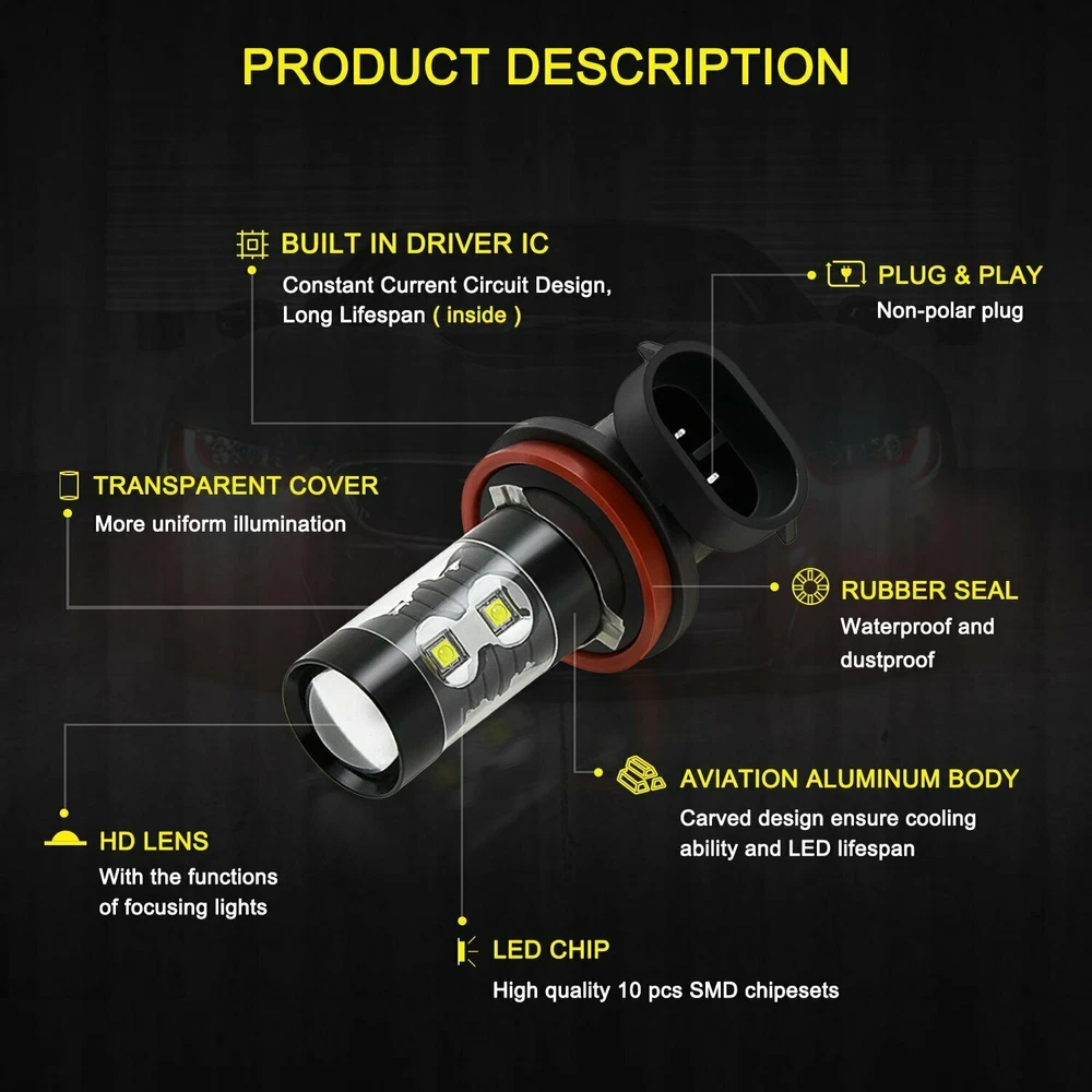 Description: -Use high-power chip -Brand new, high quality, easy to install -New LED technology reduces power consumption from 40% to 80%. -With the metal casing, it makes the bulb work in low heat. -High thermal conductivity, aluminum alloy and exquisite beauty -For replacement letter headlamps and fog lamps, etc. Features: -Number of chips: 10 -Color: white Socket type: H11/H8/H16 Voltage: 12V-24V Color temperature: 6000K Life: 50000 hours Material: aluminum alloy Life span: 50,000hrs Package Include: 2 x H11/H8/H16 Car LED Fog Light Bulb