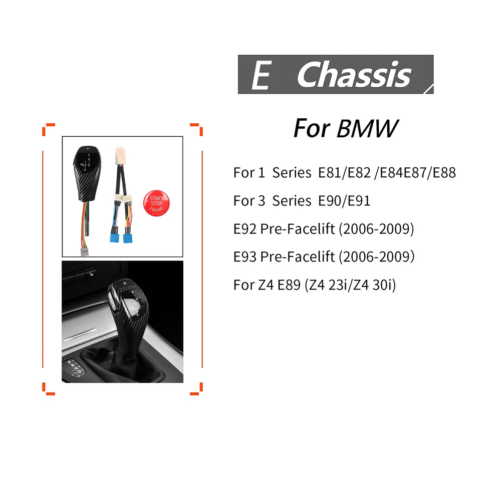 Product Description Specifications : Color : As the picture shown Material : High Quality ABS+PC Placement on Vehicle : Center Installation : Direct Replacement Package Including : 1 x Cable 1 x Carbon Fiber Look LED Gear Shift Knob 1 x Engine Start Stop Button Cover * With Install instructions & Install accessories Fitment : For BMW E Chassis For BMW 1 Series E81/E82/E84/E87/E88 For BMW E90 E91 3 Series Sedan/Wagon 06.2006-2012 For BMW E92 E93 Pre-facelift 06.2006-2009 For BMW Z4 E89 (Z4 23i/Z4 30i) Feature : - Easy install and durable use. - Perfect match for the original car. - Decorate your car charming luxury vivid. - 100% brand new and high quality guaranteed. - According to the original factory specifications. - Strict quality control standards to Build and test. Note : - Instruction Not Included, Professional Installation Is Recommended. - Please compare the pictures to make sure it fits before purchase,If you have questions, please contact us. * Check our other listing at our store and save us as your favorite sellers. * Please leave us positive feedback if you are satisfied with our product and service, if not please contact us,we will solve your problem asap, many thanks. Important Notice : all of our products are required to be installed in professional Modification car shop , NOT every car shop can make it ! Our products are modified car parts , NOT original products ,Small install gap is Allowed ! Please contact us first and DON'T leave bad feedback / DON'T open dispute ,thanks . Shipping 1.We ship to your eBay address. Please make sure your address is correct before you paying . 2.Items will be shipped within handling time when we received payment. 3.Delivery time depends on destination and other factors; 4.International buyers please note: a.Import duties, taxes and charges are not included in the item price or shipping charges. These charges are buyer’s responsibility. We will try our best to reduce the risk of the custom duties. b.Please check with your country's customs office to determine what these additional costs will be prior to buying. Returns Customer satisfaction is our first priority. 60-days return is available after delivery . Contact Us Your feedback is very important to us. If you can't leave us a "5-Star" rating and a positive feedback, please contact us without hesitation before leaving feedback. We are eager to work with our customers. We believe in communication. Give us a call or send us an email, we will make things right for our buyers. powered by