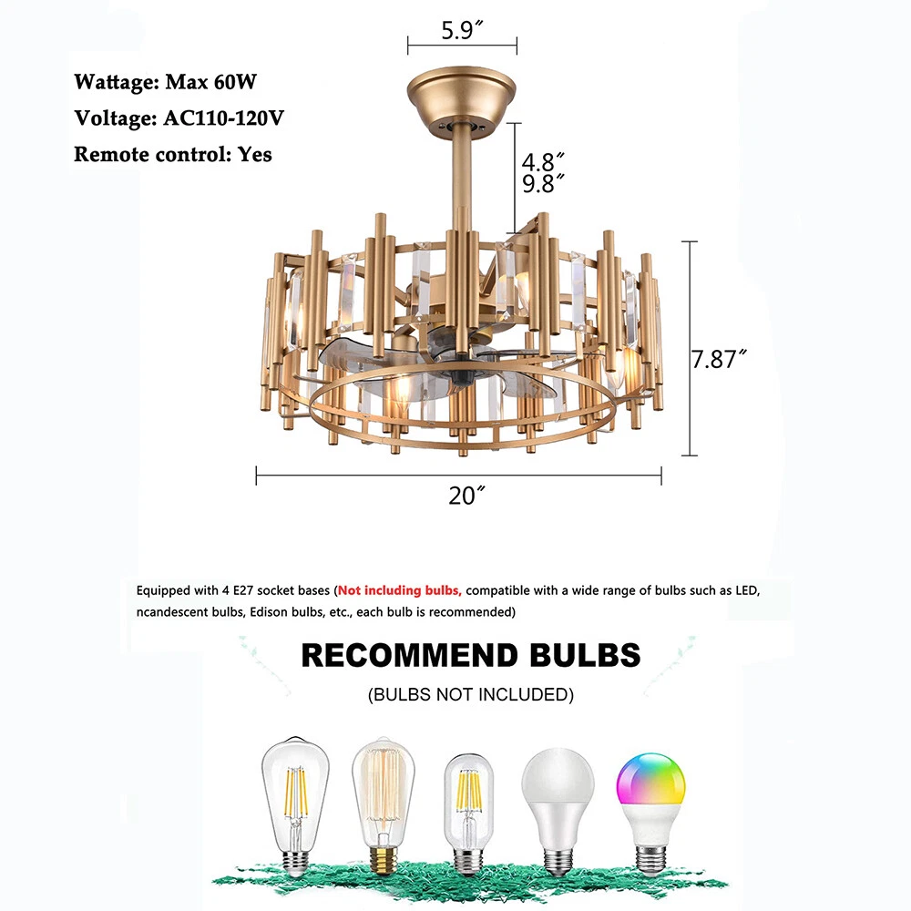 For Bedroom 3 Speed Caged Ceiling Fan with Light 20 Inch Modern Luxury Bladeless 20" Bladeless Ceiling Fan Light Dimmable Led 3 Speed Chandelier Remote Control Dimensions Fixture Height: 7.87" (20 Cm) Fixture Width: 20" (50cm) Bulb Information Bulb Requirements: Use (4) E27bulbs, Maximum 60watts, Options Include Incandescent, Fluorescent, Led, Halogen, Etc. (Bulbs Are Not Included) Wattage: Max 60w Voltage: Ac110-120v Remote Control: Yes Material and Colour Material: Retro Metal Colour: Gold 🔹Easy to Install Surface Mounted. Products Include English Manuals, Remote Control and Installation Instructions, with the Provided Bracket, Providing Easier Installation and Detailed Installation Instructions. 🔹Applicable Scenarios The Chandelier Is Suitable for Home and Commercial Spaces,Such As Living Room, Dining Room, Kitchen Island, Bedroom, Foyer, Farmhouse , bar, Restaurant, Gallery, Exhibition Room, Hotel, Coffee Shop, Office Package Included 1*Fan Light (Bulbs Not Included) 2*down Rods (12cm & 25cm) 1*Accessories Package 1*User Manual Description: ⭐Light & Fan This Ceiling Fan with Is Designed for Who Need Marvelous Update for Your House. Suit for Ceiling from 7.5-11.5 Feet , and Room from 10-25like Children Room, Bedroom, Kitchen Island or Dinning Room, Easy to Install: Hard Wire. Perfect Design to Illuminate Your Space, Whether It Is a Kitchen Island, Dining Room, Bedroom, Foyer or Any Other Place. ⭐3 Gear Wind The Enclosed Ceiling Fan Speed Vary from Soft to Cool, Match Daily Needs; Abs Fan Blades, Durable, Lightweight and Easy to Clean ⭐Remote Control Smart Ceiling Fan Include a Remote for You to Control the Fan Anywhere in the House(Max Distance of 20 Meters). One 12v 23a Alkaline Batteries Is Needed and Included ⭐Timing Function Smart Timing Set to Automatically Power off Light and Fan Afte You Fall Asleep ⭐Mute Motor Indoor/Outdoor Ceiling Fan Is Equipped with a Whisper Wind Motor Which Makes No Noise, Stay Away from Any Noise Interference While Providing a Quiet and Comfortable Environment Suggestion 1️⃣for a Safe and Secure Installation, Please Ensure That the Electrical Box to Which This Fixture Will Be Mounted Is Properly Attached to a Structural Member of the Building. 2️⃣all Wires Are Connected. When Unpacking, Be Careful Not to Pull with Wires As a Bad Connection May Result. 3️⃣do Not Connect Electricity Until Your Fixture Is Fully Assembled. Payment Delivery details Terms of sales About us Contact us Payment We accept ebay payment 。 Fees such as import duties, taxes are not included in the item price or shipping costs. These charges are the buyer's responsibility. Delivery details Shipping: 2-9 working days to: USA Terms of sales We maintain high standards of excellence and strive for hundred percent customer satisfaction. Feedback is very important to us. We hope that you contact us immediately before you give neutral or negative feedback, so that we can address your concerns. It is impossible to address issues if we do not know about them! About us Your satis faction is our ultimate goal. We work hard to earn your trust and future business. Our certified technicians have tested each item before shipping. The unit comes with 1 year limited warranty on all manufacturing defects. a) If you receive a defective item, you may return it or ask for a discount. Please contact us within 14 days after you receive the package. b) What you returned must be intact and in its original packaging as re? u. Customer is responsible for shipping costs of the returned item. c) We will cover the cost of shipping back t with the shipping rate indicated in the registration page. We will send you a new unit or refund the full payment you paid. Thank you. Contact us Business Hour Business Hour: Monday To Friday: 8:30 AM to 5:00 PM (Beijing China time) Due to time zones, our reply to your questions may not be immediately. But within above working time, we will reply your email within 24 hours. If it's non-workdays, please kindly be patient and wait till Monday. Please contact us with ebay message. Please feel free to contact us if you have any questions. Monday To Friday: 8:30 AM to 5:00 PM (Beijing China time) Due to time zones, our reply to your questions may not be immediately. But within above working time, we will reply your email within 24 hours. If it's non-workdays, please kindly be patient and wait till Monday. Please contact us with ebay message. Please feel free to contact us if you have any questions. On Jan 5, 2026 at 23:03:18 PST, seller added the following information: