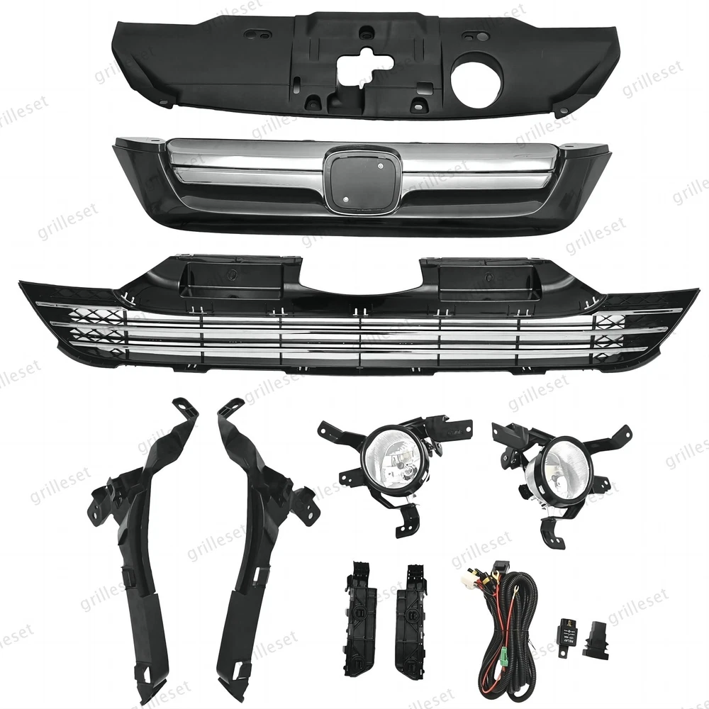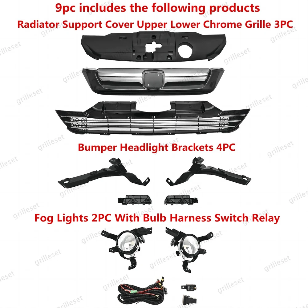 Fit for : 1 Set (9 PCS) Includes:(See more pictures for details) 1 Pc front radiator support cover 1 Pc front upper black grille with chrome trim 1 Pc front lower black grille with 3 strips chrome trim 2 Pcs front headlight brackets 2 Pcs front bumper brackets 2 Pcs fog lights assembly with bulb Item OE number : 71128-SWA-003ZA;71121-SWA-003;71123-SWA-000;71190-SXS-A00;71140-SXS-A00;71198-SWA-003;71193-SWA-003;08V31-SWA-1M002;08V31-SWA-1M001 Installation : Perfect fit direct replacement, no modifications required. Installation manual not provided; we recommend professional installation. Item's-Features : Superior quality kit 100% brand new Made from high-quality materials Excellent replacement part, no modifications needed Other parts fit for