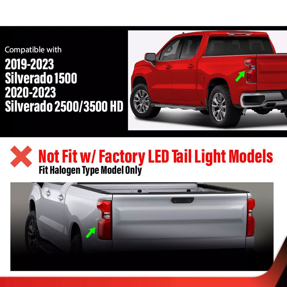 For Chevrolet Silverado 1500 2019-2025 Halogen Taillight Left Driver Side Welcome to show photos! If our auto accessories make your car look new, please leave us full stars positive feedback. Fitment For Chevrolet Silverado 2019-2023 [2-Door Regular Cab | 4-Door Extra Cab | 4-Door Crew Cab] For 2019-2023 Silverado 1500 w/ OEM Incandescent Tail Light Model For 2020-2023 Silverado 2500 HD SRW w/ OEM Incandescent Tail Light Model For 2020-2023 Silverado 3500 HD SRW w/ OEM Incandescent Tail Light Model For 2022-2022 Silverado 1500 LTD w/ OEM Incandescent Tail Light Model Compatible w/ New Body Style Models Only Compatible w/ Factory Incandescent Tail Light Models Only Not Compatible Silverado 1500 LD Models Not Compatible w/ Factory LED Tail Light Models Not Compatible Dual Rear Wheel Models Specification Condition : 100% Brand New Lens Color : Red Clear Housing Color : Red Fitment Type : Direct Replacement Placement on Vehicle : Rear, Left Lighting Technology: Halogen Material: Polycarbonate Lens Feature 100% Brand New,never been used or installed. High Quality and Durable Decorate your car charming luxury vivid. Easy installation, Direct replacement. Wiring Harness & Switch for Easy Installation Fitment Type: Direct Replacement Brings a Different Appearance to Vehicle that's Great for Show Use or to Replace Old and Worn Tail lights Enhance Visibility During Night Time, Heavy Rain, Snow, or Dense Fog Installation Hardware Is Not Included. Professional installation is highly recommended. Package include d 1 × Left Side Tail Light Note No installation instruction included, professional installation is highly recommended!!! Any damage during installation will not be refunded. Please check the size measurement chart carefully before making payment. Please allow 0.5-1 inch difference due to manual measurement.(1 inch=2.54cm) The color of the actual items may slightly different from the listing images due to different computer screen, thanks for your understanding. 1.Based on eBay new policy, we only accept PayPal Payment . 2.All major credit cards are accepted through secure payment processor PayPal. 3.If you don't have a PayPal account,you still can check out by using your debit / credit card directly.You have the option to register a PayPal account after the checkout. Learn more about PayPal. 4.Payment must be received within 7 days of auction closing. According to eBay guidelines, all unpaid purchases case will be opened automatically. 5.If you have bought multiple items from me, you can send me one payment for all the items instead of paying for them individually. When you click the Pay Now button, eBay will automatically determine if there are other items you have won or purchased from me and will combine them for your review. 6.If you need to specify the color or other information for the items you purchased, please contact us directly with item # and your eBay ID. Handing Time 3 Business Days. Orders are shipped usually in 1 to 2 business day ,but we do reserve the right to take up to 3 business days for processing before shipping out. Please note UPS ground / Standard does not deliver on Saturday, Sunday, or holidays. USPS does not deliver on Sundays and national holidays. We do not ship on Sunday and holidays. USPS USPS_First Class USPS_Priority Mail USPS_Standard Shipping UPS UPS_SurePost UPS_Ground FedEx FedEx_Ground Flat Rate Freight Flat Rate Freight ( For oversize package) The Compatibility just for referrence, when we recieves the order from you ,we will contact yout to check the fitmemt. Attention: Please check your ebay address before you pay the order. Once the address wrong, we won't help to revise the address, please request cancel the order and correct the address for new order. Retail and wholesale products: Car Grille , Car front bumper lip , Car rear bumper diffuser lip , Car side skirts , Car rear spoiler wing, Car mirror cover cap shell, Car fog lamp grille , Car front hood cover, Car OE replacement parts, etc. FREE Shipping to Business or Residential Address in United States (NOT including Alaska/Hawaii/Puerto Rico) Fitment For Chevrolet Silverado 2019-2023 [2-Door Regular Cab | 4-Door Extra Cab | 4-Door Crew Cab] For 2019-2023 Silverado 1500 w/ OEM Incandescent Tail Light Model For 2020-2023 Silverado 2500 HD SRW w/ OEM Incandescent Tail Light Model For 2020-2023 Silverado 3500 HD SRW w/ OEM Incandescent Tail Light Model For 2022-2022 Silverado 1500 LTD w/ OEM Incandescent Tail Light Model Compatible w/ New Body Style Models Only Compatible w/ Factory Incandescent Tail Light Models Only Not Compatible Silverado 1500 LD Models Not Compatible w/ Factory LED Tail Light Models Not Compatible Dual Rear Wheel Models Specification Condition : 100% Brand New Lens Color : Red Clear Housing Color : Red Fitment Type : Direct Replacement Placement on Vehicle : Rear, Left Lighting Technology: Halogen Material: Polycarbonate Lens Feature 100% Brand New,never been used or installed. High Quality and Durable Decorate your car charming luxury vivid. Easy installation, Direct replacement. Wiring Harness & Switch for Easy Installation Fitment Type: Direct Replacement Brings a Different Appearance to Vehicle that's Great for Show Use or to Replace Old and Worn Tail lights Enhance Visibility During Night Time, Heavy Rain, Snow, or Dense Fog Installation Hardware Is Not Included. Professional installation is highly recommended. Package include d 1 × Left Side Tail Light Note No installation instruction included, professional installation is highly recommended!!! Any damage during installation will not be refunded. Please check the size measurement chart carefully before making payment. Please allow 0.5-1 inch difference due to manual measurement.(1 inch=2.54cm) The color of the actual items may slightly different from the listing images due to different computer screen, thanks for your understanding. PAYMENT 1.Based on eBay new policy, we only accept PayPal Payment . 2.All major credit c