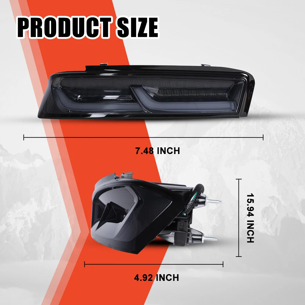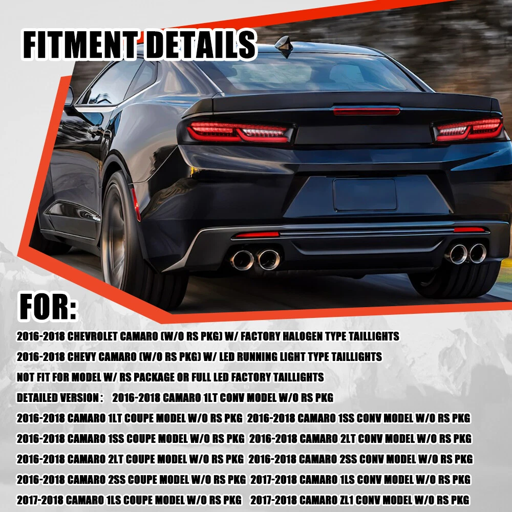 Head Lights Tail Lights Fog Lights Turn Signal Bumper Fender Flare Inner Fender Hubcaps Refrigerator Other Items for sale Head Lights Tail Lights Fog Lights Turn Signal Bumper Fender Flare Inner Fender Liners Portable Refrigerator For Chevy Camaro 2016 2017 20018 Rear Pair LED Sequential Tail lights Smoke Lens Features: 100% brand new,high-quality. Made of high quality OEM grade ABS plastic and polycarbonate lens to keep moisture and dust out of the tail lights housing. Features a sealed beam housing and fully waterproof design for improved visibility at night, during heavy rain, snow or dense fog. Triple protection head light lens design: UV filter coating design, waterproof coating design, impact resistant coating design. The tail lights have factory bolt-on installations, you can install the lights quickly and easily without rewiring or modification, you just need to plug and play. Free shipping,Free return,1 year warranty. Specification: Color Finish: Black Housing/Smoke Lens Material: PMMA(OEM Grade) Lamp Housing Material: PC&ABS Light Source: Full LED Bulbs Type: Turn Signal: LED Included Brake Light: LED Included Running Light: LED Included Back-Up Light: LED Included Function:Turning Light /Running Light /Brake Light /Reverse Light Replaces Original (OE) Part #: w/ Halogen: L: 84136778; R: 84136779 w/ LED Running: L: 84136775; R: 84136776 Partslink Number: L: GM2800288; R: GM2801288 Fitment: 2016-2018 Camaro 1LT Conv model w/o RS Pkg 2016-2018 Camaro 1LT Coupe model w/o RS Pkg 2016-2018 Camaro 1SS Conv model w/o RS Pkg 2016-2018 Camaro 1SS Coupe model w/o RS Pkg 2016-2018 Camaro 2LT Conv model w/o RS Pkg 2016-2018 Camaro 2LT Coupe model w/o RS Pkg 2016-2018 Camaro 2SS Conv model w/o RS Pkg 2016-2018 Camaro 2SS Coupe model w/o RS Pkg 2017-2018 Camaro 1LS Conv model w/o RS Pkg 2017-2018 Camaro 1LS Coupe model w/o RS Pkg 2017-2018 Camaro ZL1 Conv model w/o RS Pkg Not fit for model w/ RS Package or Full LED factory taillights Package Includes: 1 Pair of LED Tail Lights (Driver Side + Passenger Side) Payment Shipping Return About us Contact us Payment Appreciated for the prompt payment, Contact us if bid by mistake, system open unpaid item automatically. Payment must be complete within 3 days from the date you purchase or after the end of auction. Items unpaid within 3 days of the auction end will be forfeited. We reserve the right of cancel the order and re-selling the items. Shipping All shipment will ship by UPS or USPS . All items will be ship within 1 working days , and we will ship out all orders as soon as possible after payment verified, please allow up to 1-4 business days for delivery. CANADA & International customers please note: your government might charge a duty tax (brokerage fees). We do not responsible for any custom duty or import tax. Why Choose the US Stock? 1. Us Local Shipping, No Extra Customs Cost to the US. 2. Fast Delivery: 1-4 Working days Delivery. 3. Best After-Sales Service!!! Return The buyer is responsible for all return shipping including a result of customer error or defective item. 1) If you received an incorrect, damaged, defective, or item not as described, contact us for full refund or replacement on our cost. 2) If you want to return the item, please contact us within 60 days after package received. Return products must also be in its original condition: including box, packaging and all other accessories. About us We are the best auto parts, we have been pursuing excellence, continuous exploration as the slogan, let customer satisfaction is our purpose! We adhere to the United States local delivery, one year warranty! Welcome! Contact us How Should You Contact us? Please Read The Item Description And See if The item Fits Your Vehicle Exactly. If You Found Any questions, Feel Free to email us by "Ask a question" Our Office Hours Are Monday - Friday 8:00am - 5:00pm PST / 11:00am - 8:000pm ET, We Do Not Answer Any E-Mails On Weekend, And We Will Reply All E-Mails In The Order It Was Receive. All E-Mail Take Us Around 24 Hours To Respond To Any E-Mail. We Are Close During The Weekends And We Do Not Answer Any E-Mails During That Time.