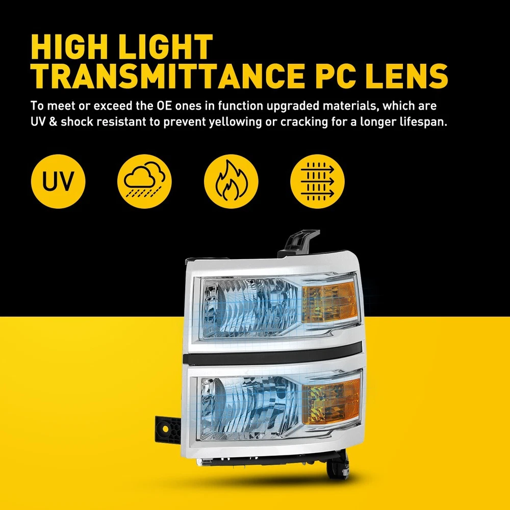 Fit for: 2014-2015 Chevy Silverado 1500 Models Only (Fit 2014 New Body Style Models Only; Does NOT Fit HD Models) Specifications: OE number: 20933724, 20933725, 20933722, 20933723, 23172782, 23172783 GM2502389, GM2503389, GM2502395, GM2503395, GM2502410 Material: ABS+PC (ABS Plastic Housing/Polycarbonate lens) Appearance color: 1.Housing Color: Chrome 2.Lens Color: Clear 3.Reflector Color: Amber Note: Projector × (Not include) DRL × ( Not Include) Bulb × (Not include) For Chevy Silverado 1500 2014-15 Chrome & Amber Headlights Assemblies US Fit for: 2014-2015 Chevy Silverado 1500 Models Only (Fit 2014 New Body Style Models Only; Does NOT Fit HD Models) Specifications: OE number: 20933724, 20933725, 20933722, 20933723, 23172782, 23172783 GM2502389, GM2503389, GM2502395, GM2503395, GM2502410 Material: ABS+PC (ABS Plastic Housing/Polycarbonate lens) Appearance color: 1.Housing Color: Chrome 2.Lens Color: Clear 3.Reflector Color: Amber Note: Projector × (Not include) DRL × ( Not Include) Bulb × (Not include) Features: *Easy to install: Direct replacement, drilling and cutting are not required. *Superior quality: Made of ABS and PC materials with toughness and heat resistance functions to ensure its long service life and durability. *Angle adjustment: Equipped with a headlamp Angle adjustment knob, you can adjust the best Angle of view through the knob. Suggestion: 1.Please confirm the OE number before purchasing!!! 2.Professional installation is required!!! Package Included: Headlights *2 (Left+Right) Item Specifics OE Spec or Performance/Custom OE Spec High Beam Bulb Type HB3 Bulb (No included) Bulbs Included No Manufacturer Part Number DDZC-SILVERADO-14-15C-CA Low Beam Bulb Type H11(Bulbs are Not Included) Package included Driver & Passenger Headlights Placement on Vehicle Front, Left, Right Turn Signal Bulb Type 7443 Bulb (No Included) Brand AUXITO Bulb Shape Code H11/HB3 (Bulbs are not included) Type Headlight Assembly Interchange Part Number 20933724 20933725 20933722 20933723 23172782 23172783 2014 2015 Headlight Style Aftermarket OE/OEM Part Number GM2502389 GM2503389 GM2502395 GM2503395 GM2502410 Manufacturer Warranty 1 Year Housing Color Chrome Features Reflector Housing, Sealed Assembly, DOT-Certified Lens Color Clear Lighting Technology Halogen Payment Returns DESCRIPTION PAYMENT SHIPPING RETURN POLICY CONTACT US Shop Category Store Home LED Headlight ◈ H4 ◈ H13 LED Reverse Light ◈ T15/921/W16W LED License Plate Light LED Side Marker Light Car Parts & Accessories Tail Light assemblies Other Hot Item Picture New List Item For 2015-2020 Chevy Tahoe Suburban [OE Style] LED DRL Headlights Headlamps LH USD 139.99 4PC Smoked Lens LED Front Side Lamp Marker White For 2003-09 Dodge Ram 2500 3500 USD 15.99 Smoked Lens White LED Bumper Rear Side Marker Lights For 1993-2002 Chevy Camaro USD 22.29 Pair Halogen Headlight Set For 2011-2015 Chevrolet Chevy Cruze 4-Door Sedan EOV USD 113.99 For 2016-2018 Honda HRV HR-V Chrome Housing Headlights Assembly Left&Right Pair USD 145.99 Help & Info Payment Policy Shipping Policy Return Policy FAQ About Us For Chevy Silverado 1500 2014-15 Chrome & Amber Headlights Assemblies US Fit for: 2014-2015 Chevy Silverado 1500 Models Only (Fit 2014 New Body Style Models Only; Does NOT Fit HD Models) Specifications: OE number: 20933724, 20933725, 20933722, 20933723, 23172782, 23172783 GM2502389, GM2503389, GM2502395, GM2503395, GM2502410 Material: ABS+PC (ABS Plastic Housing/Polycarbonate lens) Appearance color: 1.Housing Color: Chrome 2.Lens Color: Clear 3.Reflector Color: Amber Note: Projector × (Not include) DRL × ( Not Include) Bulb × (Not include) Features: *Easy to install: Direct replacement, drilling and cutting are not required. *Superior quality: Made of ABS and PC materials with toughness and heat resistance functions to ensure its long service life and durability. *Angle adjustment: Equipped with a headlamp Angle adjustment knob, you can adjust the best Angle of view through the knob. Suggestion: 1.Please confirm the OE number before purchasing!!! 2.Professional installation is required!!! Package Included: Headlights *2 (Left+Right) Payment Returns All rights reserved. On Dec 17, 2024 at 13:24:08 PST, seller added the following information:
