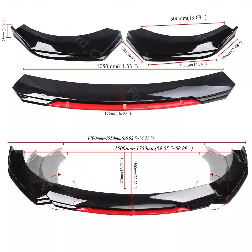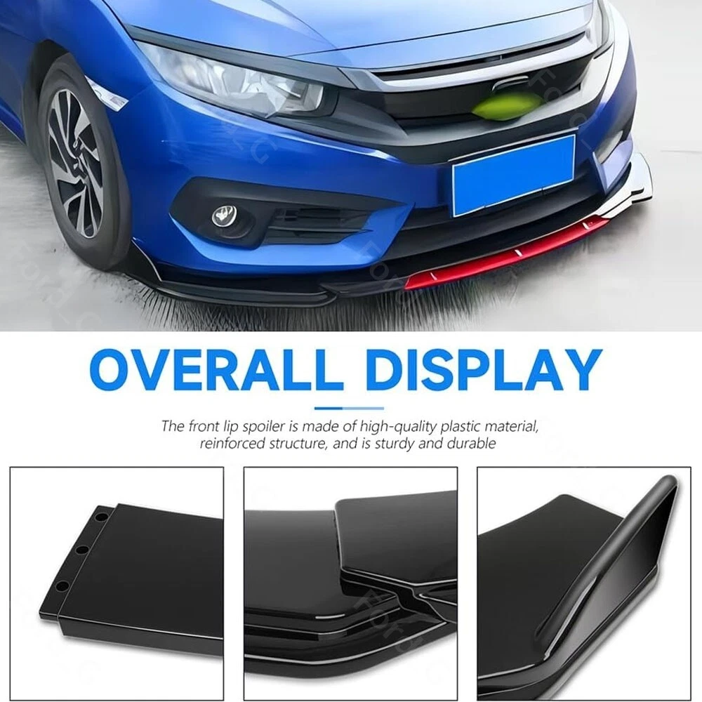 Description: Front bumper lip body kit spoiler: Material: ABS Color: Glossy Black+Red Placing on the vehicle: front Splitter Rods: Color: Glossy Black Material: stainless steel Length: 20cm Location: This delicate and compact joystick is mainly fixed to body components (front and rear walls, skirts, head, and tail lips), and can also be installed on the car center console or interior panel. Features: Made of updated and durable ABS plastic, with added reinforcing ribs, it will not deform after long-term use. Longer and wider than others. Provide an elegant and personalized appearance. Prevent the car from being scratched and improve the decoration level of the car. With screws, installation is more convenient and stable. Contains instructions, highly recommended for professional installation* Packaging included: 1 * Front bumper spoiler cover lip 2 * Splitter Rods