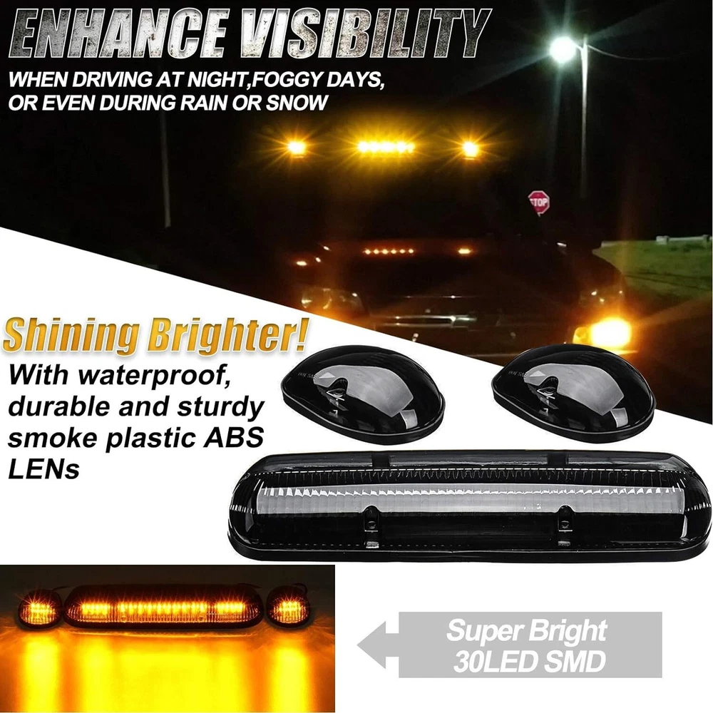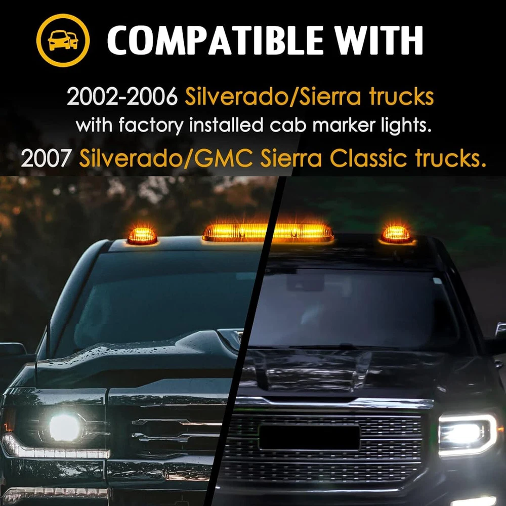 For 2002-2007 Chevrolet Silverado 2500HD 3500 LED Cab Roof Marker Lights Amber Fitment: Part number: RKL 755153SM Fit for 2002-2006 Chevy Silverado trucks with factory installed cab lights Fit for 2007 Chevy Silverado Classic trucks Fit for 2002-2006 GMC Sierra trucks with factory installed cab lights Fit for 2007 GMC Sierra Classic trucks Fit on 4x4 / Off-Road / SUV / Crossover / Jeep / RV / Pickup truck vehicle Features: ✔ SUPER BRIGHT & STURDY: 3pcs Smoke cab lights with built-in 30 Amber LED Lamps (One Long Lamp For Middle plus Two Small Lamps For The Sides), Output Super Bright white light, more eye-catching without glares, easy warn the upcoming car to reduce accidental risks. Particularly fit the night, heavy snow, rain and fog weather. ✔FIT FOR: for 2002, 2003, 2004, 2005, 2006 Chevy Silverado & GMC Sierra 1500 1500HD 2500 2500HD 3500 trucks with factory installed cab marker lights. 2007 Chevy Silverado & GMC Sierra 1500 1500HD 2500 2500HD 3500 Classic trucks. ✔HIGH QUALITY & WATERPROOF : Each LED Cab Marker Light Features Super Strong ABS Plastic Smoked Lens, With the IP67 Waterproof cover and design, will prevent from any sand, water, dirt, snow or dust. ✔ MUTI-FUNCTION: This Cab Marker Light functioned as Roof Marker Light, Roof Top Running Light, Top Clearance Light, Cab Running Light etc. ✔EASY TO INSTALL: Just remove your factory cab lights and bolt these in their place.Convenient for modifying & rewiring. Wiring: Black is to Ground and Red is to Positive. Modification or drilling might be required for the non-installed vehicles. Please note: 1.For a fresh new add-on installation, drilling is required. 2.The bottom of the cab roof lamp is flat, if you are about to install this on a very curvy rooftop , they might not fit properly. 3.No instruction in the package, professional installation is high recommended. 4.Please feel free to contact us for whatever we can help via eBay message. Specifications: Type: LED Cab Roof Top Marker Light LED: 30PCS 5050 LED chips Working voltage: 12V Material: ABS + PC Light Cover Shell color: Smoked Light color: Amber yellow Waterproof rating: IP67 Service life: more than 50000h Package Included: 3 x LED cab roof lights 1 x Wiring Pack (Wiring harness, on/off switch, gaskets and stainless steel screws) Payment We can accept payment of Paypal only. Payment should be made within 7 days after purchasing. (No payment orders eBay system will automatically open unpaid dispute, and this is not good to your account.) Shipping Item will be shipped out within 48 hours upon receipt of your cleared payment. We can not ship on Sundays and other public holidays. International Buyers Please Note: 1, Import duties, taxes and charges are not included in the item price or shipping charges. These charges are the buyer's responsibility. 2, Please check with your countrys customs office to determine what these additional costs will be prior to bidding/buying. Please make sure your address in paypal is correct. we will only follow your address listed in the Paypal payment for the shipment. Combine shipment is not allowed. If you want to combine all the items together, you should still pay for all of the shipping, insurance and handling fee! Returns We offer you 30 days return. The buyer is responsible for return shipping including a result of customer error or wrong item bought: 1) If you received an incorrect, damaged, defective, or item not as described, contact us for a partial/full refund or replacement on our cost. 2) If you want to return the item, please contact us within 60 days after package received. Return products must also be in its original condition: including box, packaging and all other accessories. Feedback 1.We are appreciated your business and to improve our customer service and our commitment to quality. 2.We will leave a positive feedback immediately after payment is received. We appreciate a positive feedback as much as you do. 3.If for some reason there is any issue with the purchase, please contact us prior to leaving feedback, and we will be glad to work with you to have it resolved. Contact Us We do appreciate your purchase from our store. If you are satisfied with the item as well as our service, please kindly leave us a Positive Feedback to help develop our business. Thank you in advance. Our office hours are MONDAY - FRIDAY 9:00PM - 18:00PM PST , we do not answer any E-mails or eBay messages on weekend. All E-mail or eBay message take us around 24 hours to respond. Thanks a lot. For 2002-2007 Chevrolet Silverado 2500HD 3500 LED Cab Roof Marker Lights Amber Fitment: Part number: RKL 755153SM Fit for 2002-2006 Chevy Silverado trucks with factory installed cab lights Fit for 2007 Chevy Silverado Classic trucks Fit for 2002-2006 GMC Sierra trucks with factory installed cab lights Fit for 2007 GMC Sierra Classic trucks Fit on 4x4 / Off-Road / SUV / Crossover / Jeep / RV / Pickup truck vehicle Features: ✔ SUPER BRIGHT & STURDY: 3pcs Smoke cab lights with built-in 30 Amber LED Lamps (One Long Lamp For Middle plus Two Small Lamps For The Sides), Output Super Bright white light, more eye-catching without glares, easy warn the upcoming car to reduce accidental risks. Particularly fit the night, heavy snow, rain and fog weather. ✔FIT FOR: for 2002, 2003, 2004, 2005, 2006 Chevy Silverado & GMC Sierra 1500 1500HD 2500 2500HD 3500 trucks with factory installed cab marker lights. 2007 Chevy Silverado & GMC Sierra 1500 1500HD 2500 2500HD 3500 Classic trucks. ✔HIGH QUALITY & WATERPROOF : Each LED Cab Marker Light Features Super Strong ABS Plastic Smoked Lens, With the IP67 Waterproof cover and design, will prevent from any sand, water, dirt, snow or dust. ✔ MUTI-FUNCTION: This Cab Marker Light functioned as Roof Marker Light, Roof Top Running Light, Top Clearance Light, Cab Running Light etc. ✔EASY TO INSTALL: Just remove your factory cab lights and bolt these in their place.Convenient for modifying & rewiring. Wiring: Black is to 