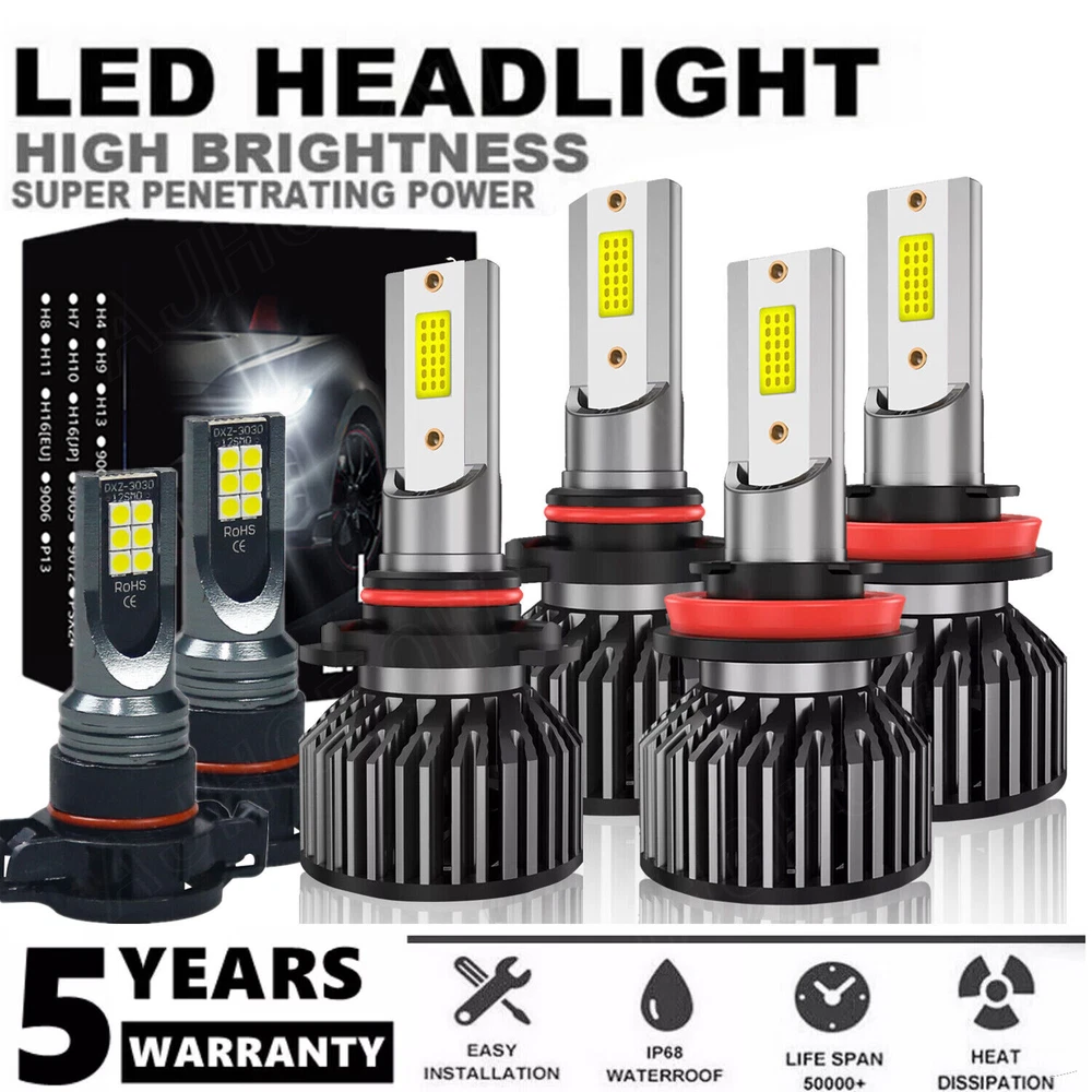 Specification Package: including (Total 6x) 9005&H11 LED headlights & H16 LED fog lights. Color Temperature: 6000K white. Lumens: 28000LM total in Headlight, 6000LM in Fog light. Waterproof: Yes, IP67. Power Input: DC 9-32V Current:2.8A Cooling Belt Material: Copper Working Tem: -20~85℃ Power: 400W/Set (60W/each bulb) Lumens: 28000LM/Set (6000LM/each bulb) Beam Angel: 360° Working efficiency: 98% Lifespan: > 30,000 Hours Material: Aluminum alloy 6000K white CANBUS ERROR FREE: No. For most vehicles, just directly plug and play. Yet for some vehicles with CAN-BUS system, it may require install decoder or load resistor to avoid hyper flash or fast blinking. Application: replacement for led headlight,fog light,or DRL(daytime running light),etc. Vltage: 12V~24V, built in IC driver,much stable current than normal led bulbs in the marker, longer life span. Perfect replacement for the halogen and incandescent headlamp, Easy installation about taking about 20 minutes according to the installation manual included. Please Note: Please check your car manual or original bulb to confirm the bulb size, length is correct or not before purchasing to save your time. Package Included: 4x LED Headlight Bulb 2x LED Fog Light Bulb Suitable for all kinds of weather How Do I Know These LED Bulbs are Right for My Vehicle? Plese check the size on Ebay fitment guide system ( Ebay filter system may not be up to date. ) Plese check your vehicle user manual or original halogen bulb, the part number is marked above. Plese search "automotive bulb look-up" online, and enter your vehicle info to find out the correct size. Or in 'Customer questions & answers', write down your vehicle year, make, and model, we will help you check. Q&A Returns Shipping Policy Payment Contact US Q&A Q1: Will this bulb fit my vehicle? A1: We can match almost any vehicle to one of our bulb sizes. eBay only lets us include some vehicle fitments per listing, but if your vehicle does not show up on the compatibility table at the top of our listings, welcome you to contact us for free consulation before purchasing a product. Q2: Which bulbs are used in my vehicle? A2: Check automotive lamp replacemnt guide, you can select the year, make, and model of your vehicle, then select the application you want to replace or upgrade from stock. Q3: My bulbs won't fit, help! A3: Special bulb holder may be required. See if you can take the holder from the stock bulb. If not, let us know. The bulb size may be wrong, double check the item you received with the item you ordered. Do you have an aftermarket lighting housing? These may not be perfectly fitted for aftermarket bulbs and will require some manual modifications. Q4:Why after installing the bulb, there have the flicker/error message/radio interference? A4: Check the light fuses, and then check the ballast plugs to insure correct installation. If this doesn't work, there may be a voltage problem with the vehicle. You probably just need a relay or capacitor. Even though some bulbs are builtin resistors, they may still need a decoder. Returns 1. Customer satisfaction is our top goal. We believe our items are so outstanding. All products are quality checked. They are new and in good condition when shipped to our customers. We are convinced you will be happy with your Purchase. 2. We offer free return & money back guarantee. If you are not satisfied with your purchase for any reasons, you can return the item for refund or replacement/exchange. All returns must include the original packaging. 3. Please contact us first if you have any problems/questions/concerns. We will be happy to resolve any issues you may have in a cordial and friendly manner. Any items damaged because of incorrect installation will not be refunded. Please contact us for return or troubleshooting help prior to returning any products. 4. We appreciate your Postive Feedback, and will do the same in return. DO NOT leave negative feedback without first communication with us. Please allow max 2 business days for us to response. Shipping Policy All items will be checked before packing. All items are new and of high quality. 1. Can you tell me when my order will be shipped? Actually we will ship the item within 1 business day after receiving orders, excluding weekends and public holidays. But USPS need to take longer time to update tracking info and arrange delivery during the challenging time for now. If your order was not shipped more than 3 business days, please contact us with your order number to get quick support. 2. My item has not arrived, what's taking so long? Sometimes items take longer than expected, especially if it's going far or to rural area. Check with your post office to see if your item has been held up. Sometimes USPS will not update a tracking number until it has arrived at its destination. If your item still has not arrived after a few days, let us know so we can double check for you and help solve it asap. Payment 1. Instant PayPal payment is the preferred method of payment. We also accept payment via PayPal, DebitCard, Visa, MasterCard, Discover. 2. Items will be shipped to your eBay address. Please make sure it is correct. 3. If you want to ship to other address, please change your PayPal shipping address before you make payment. 4. Payment must be received 4 days after auction ended. Contact US 1. When you satisfied with our product and services please leave us positive feedback. 2. If you have ANY questions with shipping, product or service, please Contact Us first before leaving feedback/write a review or filing a return case. We will solve the problem! If you have ANY questions with shipping, product or service, please Contact Us first before leaving feedback/write a review or filing a return case. We will solve the problem! We always put our customers first and your satisfaction is guaranteed.