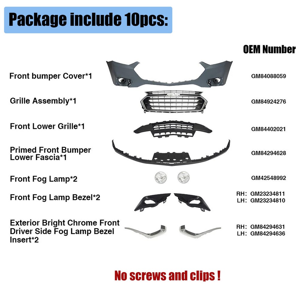 Front Bumper Cover Assembly Grille Kit For 2018-2021 Chevy Traverse w/ Fog Light Package Content 10 Pcs as 1 Set Complete Front Bumper Grille Cover (As picture shows) Front Bumper Cover*1 OEM CODE:GM84088059 Grille Assembly*1 OEM CODE:GM84924276 Front Lower Grille*1 OEM CODE:GM84402021 Primed Front Bumper Lower Fascia*1 OEM CODE:GM84294628 Front Fog Lamp*2 OEM CODE:GM42548992 Front Fog Lamp Bezel*2 OEM CODE: LH:GM23234810 RH:GM23234811 Exterior Bright Chrome Front Driver Side Fog Lamp Bezel Insert*2 OEM CODE: LH:GM84294636 RH:GM84294631 Buyer can paint the bumper cover different color to match the car. Feature High Durability Made of ABS material with high durability to extend its long service life and a better shopping experience for you. Attractive DecorationThe desig n of the f ront bumper cover grille assembly complete is in harmony with your vehicle's exterior and enhances its overall aesthetics. Perfect Fit Manufactured according to originals for a perfect match with your car. Simple Installation Easy installation with direct replacement, other modifications are not required. Stable Performance The f ront bumper cover grille assembly complete with stable performance provides you a better shopping experience. Note If you have any questions or concerns, please contact us via eBay messages before leaving negative feedback♥ On Feb 11, 2026 at 23:43:52 PST, seller added the following information: