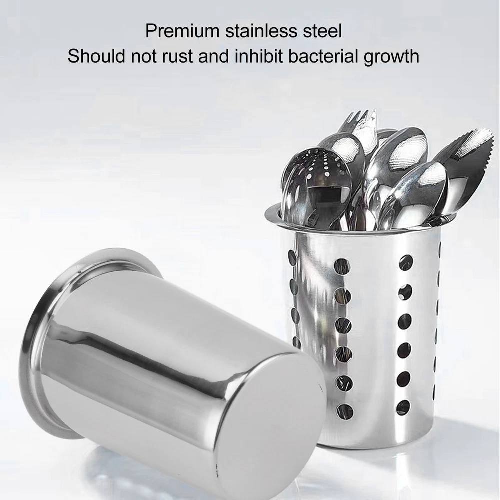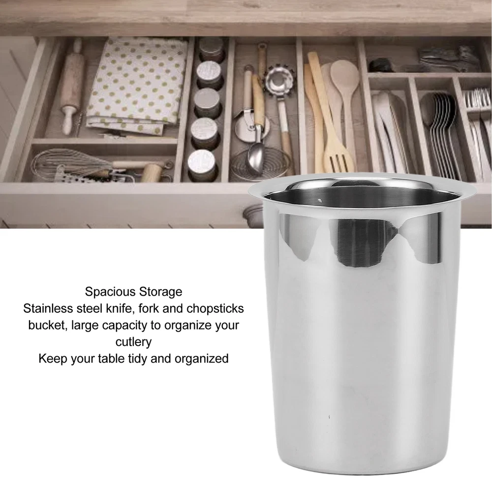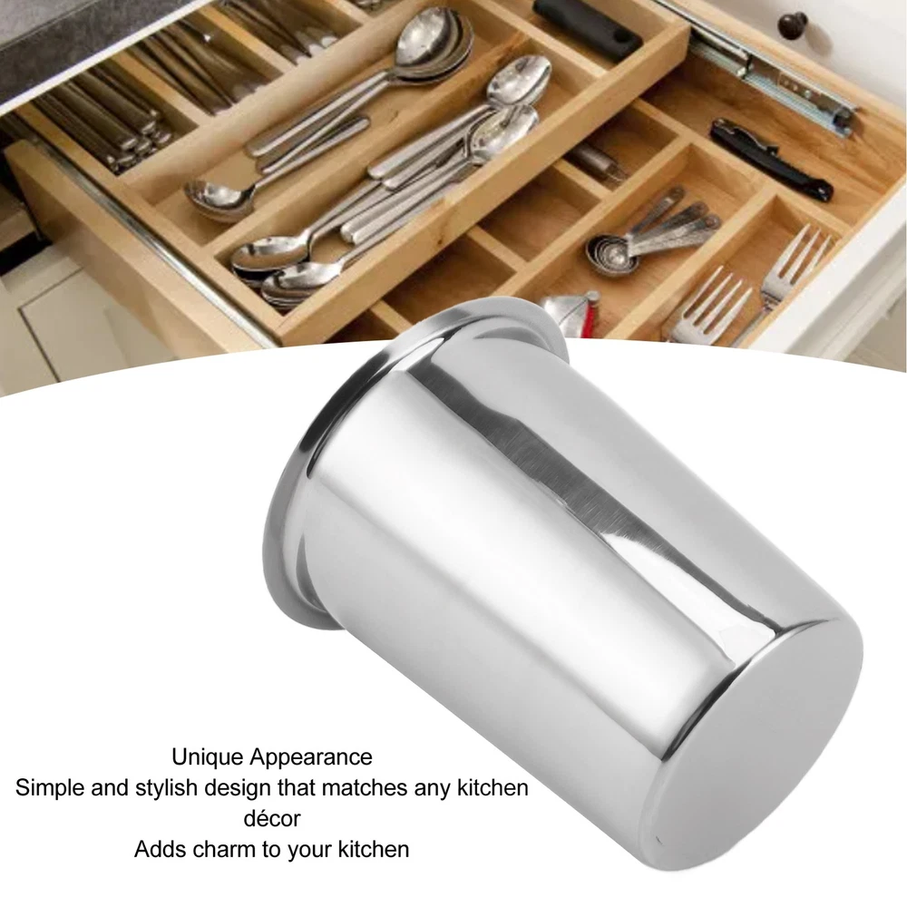 Features 1、LARGE CAPACITY STORAGE: Stainless steel knife, fork and chopsticks bucket, large capacity storage for your cutlery, keep your desktop neat and organized. 2、STAINLESS STEEL MATERIAL: The kitchen utensil holder is made of premium stainless steel, durable and easy to clean, ensuring the product lasts for a long time. 3、MULTIFUNCTIONAL DESIGN: In addition to knives, forks and chopsticks, the kitchen utensils organizer can also organize other kitchen utensils and tools, making your kitchen more neat and tidy. 4、UNIQUE APPEARANCE: The kitchen utensil holder features a simple and stylish design that matches with various kitchen décor styles, adding charm to your kitchen. 5、CONVENIENT AND PRACTICAL: The kitchen utensils organizer is easy to carry and move, and can be placed on the kitchen table, dining table or storage cabinet for easy storage and access. Specification Item Type: Kitchen Utensil Holder Material: 304 Stainless Steel Size: Bottom Length: Approx. 8.6cm/3.4in Top Outer Diameter: Approx. 11.5cm/4.5in Top Inside Diameter: Approx. 9.5cm/3.7in Height: Approx. 13.8cm/5.4in Use: Tableware Storage Package List 1 x Kitchen Utensil Holder