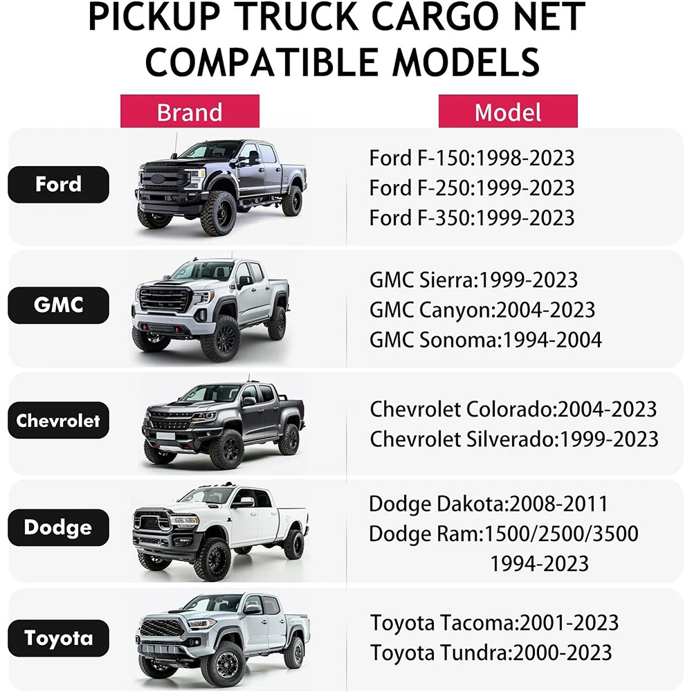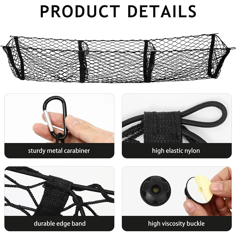 For Dodge Dakota 1997-2012 Trunk Bed Cargo Net 3 Pocket Envelope Mesh Storage Specification Color: Black Suitable for type: direct replacement Material: Elastic, Nylon Placement on the vehicle: trunk, trunk area, trunk space Type: trunk cargo net pockets Number of cargo net pockets: 3 Feature 【Durable Material】 Truck bed cargo net is made of strong and durable heavy-duty nylon and rubber, with highly elastic and stretchable ropes, which has very good recovery properties. Unlike ordinary nets, it can put more things in it. High quality aluminum hooks are strong and durable. 【Enough Space】 Pickup truck net pocket size is 59*11.8*11.8in and can be stretched to fit the width of your pickup truck bed. It fits most car models, but definitely not all. It is suitable for car owners to use when traveling, self-driving, etc., allowing you to easily organize your car. Note: Please confirm the size of truck bed before purchasing. 【Neat and Organized Storage】 The truck net features three pockets to help organize or store sports gear, balls, groceries, emergency kits, tools, vehicle storage accessories and more. Three pocket cargo nets provide easy access to everything you stow in the trunk. And keep your storage area organized and tidy. 【Easy to Install】 2 installation methods. If your car comes with its own embedded hooks, you only need to connect the car's own hook, the metal hook and the rope on the cargo net. If your vehicle does not have embedded hooks, you can use four retrofit hooks included in the package. Complete installation instructions are in the pictures. 【Package Included】 You will receive 1 cargo net, 4 metal hooks, 4 plastic retrofit hooks, and 4 screws. For any reason you are not satisfied with the quality of your car trunk net, please feel free to contact us. We are trying our best to provide you with the best service. Package Included 1x Cargo Net 4x Metal Hooks 4x Plastic Retrofit Hooks 4x Screws •We accepted PayPal payment ONLY •We will ship your order within 24 hours after receiving your verified payment (Excluding Weekends and Public Holidays) •The estimated delivery time is within 3-7 working days(not including the weekend). •United States:3-5 working days(not including the weekend) •If you fail to receive over 7 days, please contact us and we will try our best to help •Return items must not be used or have any sign of abuse or intentional damage. •Buyer is responsible for all return shipping charges. •We reserve the right not to refund S&H when the item has been posted. We are a company run business with more than 10 years experience in whole sale of quality Motorcycle And Car Parts & Accessories Specification Color: Black Suitable for type: direct replacement Material: Elastic, Nylon Placement on the vehicle: trunk, trunk area, trunk space Type: trunk cargo net pockets Number of cargo net pockets: 3 Feature 【Durable Material】 Truck bed cargo net is made of strong and durable heavy-duty nylon and rubber, with highly elastic and stretchable ropes, which has very good recovery properties. Unlike ordinary nets, it can put more things in it. High quality aluminum hooks are strong and durable. 【Enough Space】 Pickup truck net pocket size is 59*11.8*11.8in and can be stretched to fit the width of your pickup truck bed. It fits most car models, but definitely not all. It is suitable for car owners to use when traveling, self-driving, etc., allowing you to easily organize your car. Note: Please confirm the size of truck bed before purchasing. 【Neat and Organized Storage】 The truck net features three pockets to help organize or store sports gear, balls, groceries, emergency kits, tools, vehicle storage accessories and more. Three pocket cargo nets provide easy access to everything you stow in the trunk. And keep your storage area organized and tidy. 【Easy to Install】 2 installation methods. If your car comes with its own embedded hooks, you only need to connect the car's own hook, the metal hook and the rope on the cargo net. If your vehicle does not have embedded hooks, you can use four retrofit hooks included in the package. Complete installation instructions are in the pictures. 【Package Included】 You will receive 1 cargo net, 4 metal hooks, 4 plastic retrofit hooks, and 4 screws. For any reason you are not satisfied with the quality of your car trunk net, please feel free to contact us. We are trying our best to provide you with the best service. Package Included 1x Cargo Net 4x Metal Hooks 4x Plastic Retrofit Hooks 4x Screws PAYMENT •We accepted PayPal payment ONLY SHIPPING •We will ship your order within 24 hours after receiving your verified payment (Excluding Weekends and Public Holidays) •The estimated delivery time is within 3-7 working days(not including the weekend). •United States:3-5 working days(not including the weekend) •If you fail to receive over 7 days, please contact us and we will try our best to help Terms of Sale •Return items must not be used or have any sign of abuse or intentional damage. •Buyer is responsible for all return shipping charges. •We reserve the right not to refund S&H when the item has been posted. ABOUT US We are a company run business with more than 10 years experience in whole sale of quality Motorcycle And Car Parts & Accessories On Feb 19, 2025 at 22:43:24 PST, seller added the following information: