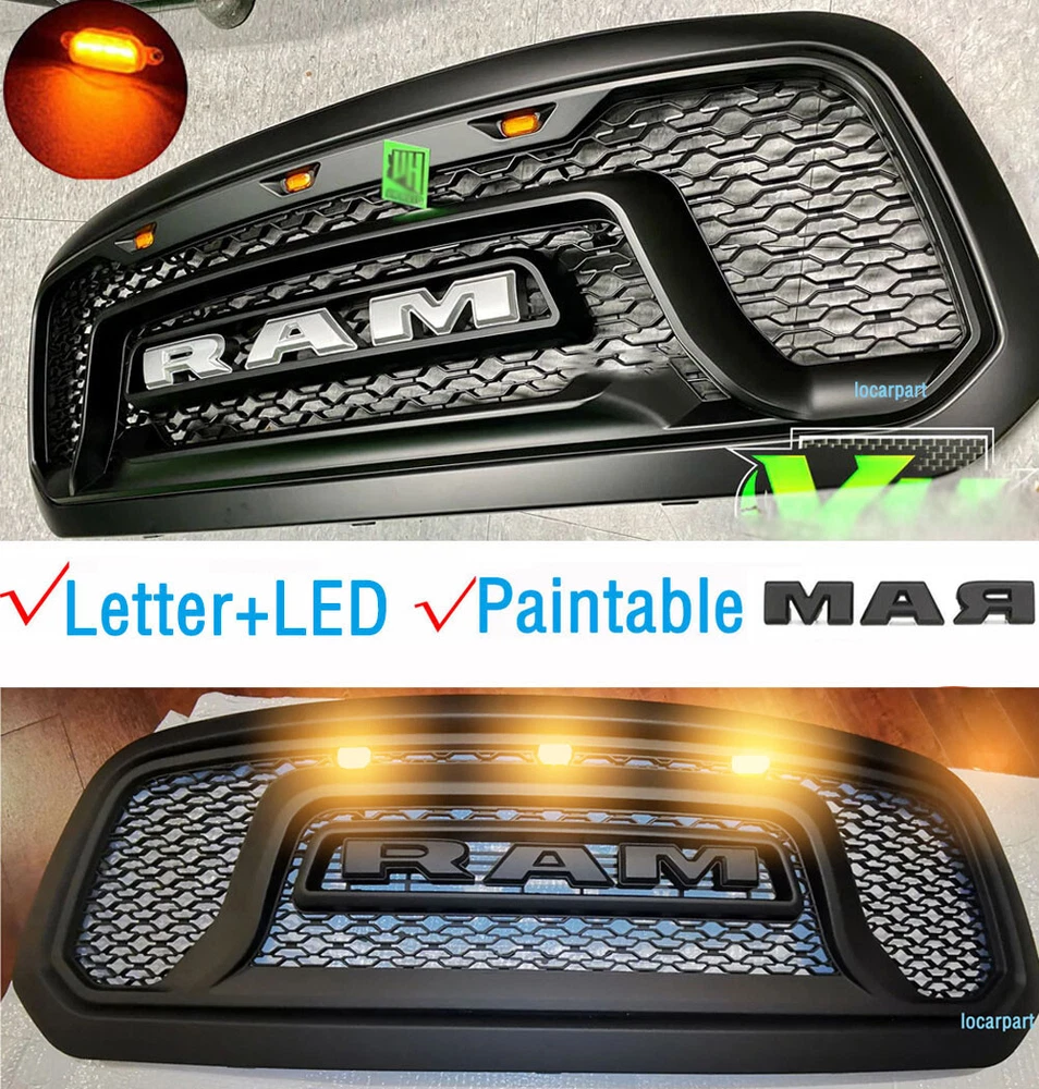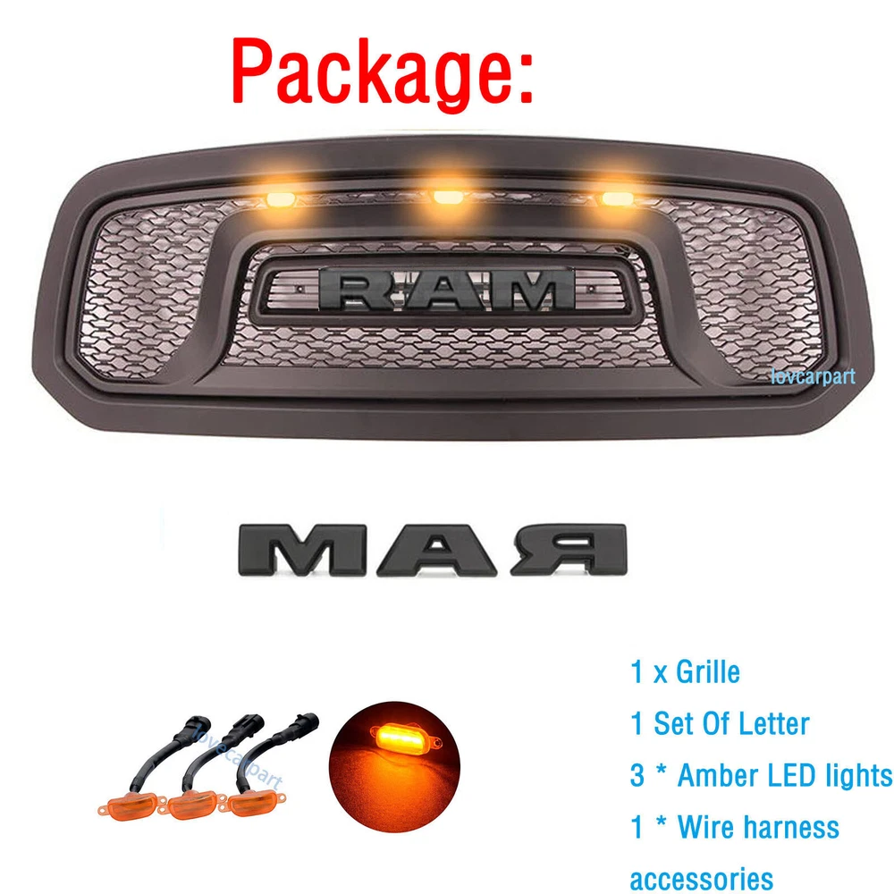 Product Description Specification: Color: Matte black Material: ABS Plastic Type:Front Grille Grill with 3Needed letter. No drilling and cutting required. Feature: 1. High quality replacement ABS material, superior craftsmanship and durability. Each grille ensures good looks with a clean surface, you can enhance the style or function of the grille. 2. Prevent foreign material from entering the air intake and damaging the engine. 3. Provides better airflow to the radiator to help the cooling process better. 4. EASY INSTALLATION: Just unscrew your old grill and screw this one in with existing bolts. Tips: install ation video can be found b y searching “RAM1500 grill 2013install” on YouTube. Package Include: 1x Front Grille 1x Wire Harn ess 3x Amber LED WITH 3Needed Letter(R*A*M) About Us Payment Terms Returns Contact Us Figocarpart is one of US’s fastest growing online retailersWith our best effort, we are now trusted by more than 100,000 customers nationwide. We are dedicated to offering you an unrivalled choice of products with unbeatable low price and best quality. We ONLY accept Paypal. We ship to your eBay or Paypal address. Please make sure your eBay ID、contact and Paypal address is correct before you pay. Thank you! 1.If item is defective and not working on arrival, please contact us within 7 days of receiving the defective for repair or refund. Item may be returned within 30 days of purchase upon your receipt.All items returned must contain all original packaging materials. 2.This item have 1Year warranty. We offer free repairing service within 6 months from the date of purchased. If damaged is caused by undue wear and tear, dirt, misused, improper installation/operation, accident or repaired by unauthorized person, the warranty becomes void. 3.All returns must have prior authorization. Please message us firstly if you have any problem. Please contact us before you return the item. 4.Buyer is responsible for the return postage. If you ask for a refund during valid period, we will offer you a refund without postage charges. Shipping and handling charges, insurance are not refundable in any case. We are only responsible for once re-sending expense for replacement due to defects. Please contact us firstly if you have any problem. * We give you a 30 days money-back guarantee to return any items purchased, no questions asked, hassle-free. * You can return for refund or exchange same product or different product (difference of price will be charged) within 30 days after you receive the item. * Any returning or exchanging items must be in the original package and new condition. We reserve rights to refuse refit or damaged items (caused by buyer) for return and exchange. * No returns will be accepted if you contacted us after 30 days of receiving the item. * Return fee: Buyers are responsible to pay the return shipping fee. 15% restocking fee on total price will be charged and be deducted from the refund total. * Exchange fee: No restocking fee will be charged, however Buyers are responsible to pay the return shipping fee and exchange reshipping fee, depending on the weight of merchandise. * Email our Customer Service Department first before return the item back. Please specify your item number, your eBay ID, and the reason for the return. Click here to contact us directly. Any questions, pls contact us via ebay message or email us.We will reply your message within 48 hours. If you do not receive our reply within 48 hours, pls post a message again because sometimes our message system may block some emails. About Us Figocarpart is one of US’s fastest growing online retailersWith our best effort, we are now trusted by more than 100,000 customers nationwide. We are dedicated to offering you an unrivalled choice of products with unbeatable low price and best quality. Payment We ONLY accept Paypal. We ship to your eBay or Paypal address. Please make sure your eBay ID、contact and Paypal address is correct before you pay. Thank you! Terms 1.If item is defective and not working on arrival, please contact us within 7 days of receiving the defective for repair or refund. Item may be returned within 30 days of purchase upon your receipt.All items returned must contain all original packaging materials. 2.This item have 1Year warranty. We offer free repairing service within 6 months from the date of purchased. If damaged is caused by undue wear and tear, dirt, misused, improper installation/operation, accident or repaired by unauthorized person, the warranty becomes void. 3.All returns must have prior authorization. Please message us firstly if you have any problem. Please contact us before you return the item. 4.Buyer is responsible for the return postage. If you ask for a refund during valid period, we will offer you a refund without postage charges. Shipping and handling charges, insurance are not refundable in any case. We are only responsible for once re-sending expense for replacement due to defects. Returns Please contact us firstly if you have any problem. * We give you a 30 days money-back guarantee to return any items purchased, no questions asked, hassle-free. * You can return for refund or exchange same product or different product (difference of price will be charged) within 30 days after you receive the item. * Any returning or exchanging items must be in the original package and new condition. We reserve rights to refuse refit or damaged items (caused by buyer) for return and exchange. * No returns will be accepted if you contacted us after 30 days of receiving the item. * Return fee: Buyers are responsible to pay the return shipping fee. 15% restocking fee on total price will be charged and be deducted from the refund total. * Exchange fee: No restocking fee will be charged, however Buyers are responsible to pay the return shipping fee and exchange reshipping fee, depending on the weight of merchandise. * Email our Customer Service Department first before return the item bac