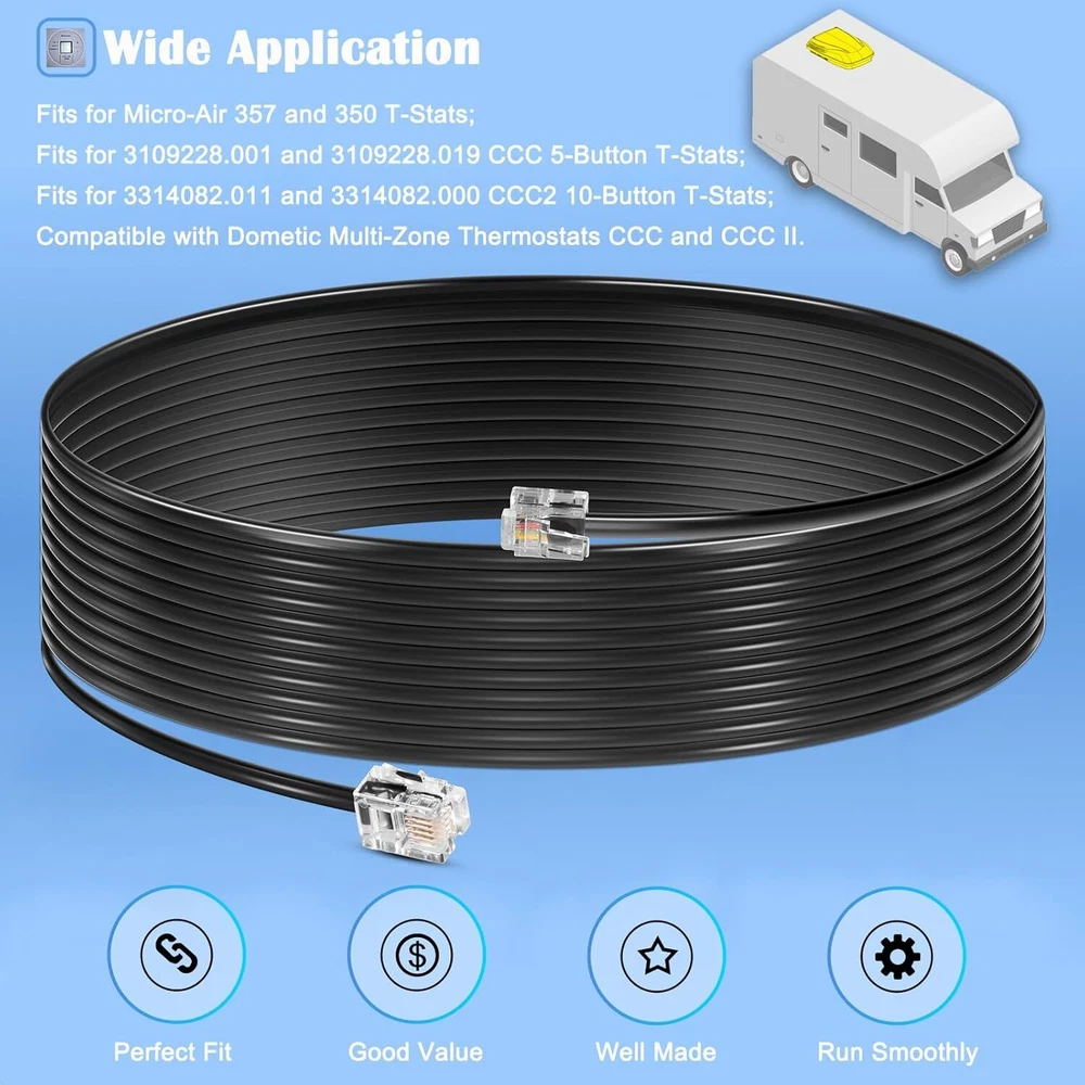 For Dometic RV Heat Pumps AC Control Boards Air Conditioner Communication Cable About this item 【Wide Application】 Compatible with select Dometic RV air conditioners with heat pumps systems. Fits for 3109228.001 and 3109228.019 CCC 5-Button T-Stats; Fits for 3314082.011 and 3314082.000 CCC2 10-Button T-Stats; Fits for Micro-Air 357 and 350 T-Stats. 【High Performance】 Used to easily & properly set up a new air conditioning system or replace the old/worn-out cable to restore the communication from the motorhome thermostat to the AC control boards, ensures the seamless connection between the air conditioner and wall-mounted control center for efficient operation and temperature regulation. 【Simple Installation】 Plug-and-play design for easy installation and setup. Features with two RJ-11-6CAP communication connectors, you can easily connect and disconnect the cable as needed. A must-have for maintaining a comfortable temperature inside your recreational vehicle. 【Proprietary Cable】 The cable is made from four conductors to transmit data at high-speeds as well as constructed with shielding to reduce interference and signal loss. Designed for use with Dometic air conditioning systems, facilitate the optimal communication and performance between components. 【100% Satisfaction Guarantee】 If you're not satisfied with this 3106614.013 Communication Data Cable for Dometic RV Thermostats and AC Control Boards, simply return it for getting refund in 30 days. While you have any questions about our products, please feel free to contact us Product Description A standard 6 pin telephone cable will not work in place of this 6 pin data cable. A 6 pin data cable is designed for transmitting digital data between devices, while a 6 pin telephone cable is designed for transmitting analog signals in telephone and telecommunications systems. Using this Air Conditioner Communication Cable for Dometic, allows easily set up a new air conditioning system or replace worn-out cables, effectively restore the communication from the motorhome thermostat to the overhead A/C, ensures the seamless operation and temperature control. Fits for Micro-Air 357 and 350 T-Stats; Fits for 3109228.001 and 3109228.019 CCC 5-Button T-Stats; Fits for 3314082.011 and 3314082.000 CCC2 10-Button T-Stats; Compatible with Dometic Multi-Zone Thermostats CCC and CCC II. Easy Installation: Plug-and-play design for hassle-free setup. Breeze to install and great for fixing the communications error between the thermostat and AC. 1.All Payments must be Confirmed (Shipping and billing addresses must match) Payment is required within 7 days from the date of the auction ending. 2.We accept PayPal, MasterCard, Visa, American Express, Discover and etc payment. 1.Orders will be ship out within 1 business days via USPS, Or UPS . (Orders from Saturdays, Sundays or holidays will process on next business day and will be ship within 24 hours. ) 2.All of the items are shipped from our Warehouse in USA.It will take about 3 to 5 business days to you. 3.Any defective items received can be replaced or refunded. Please contact us with the item number, eBay ID and defect description. 1.100% Satisfaction Guarantee: If you're not 100% satisfied with our items, simply return it for a full refund in 60 days (Items must be in new condition and in original package). Kindly please feel free to contact us before return. 2.Return or Replacements: Support 12 months' Warranty. All product will be tested in 100% before delivery. If the item is was damaged in transit, kindly please contact us for a replacement or refund (Excluding contrived damage or misuse). Any question, please don’t hesitate to let us know. We try our best to reply to your emails as soon as possible, due to high volume of daily incoming emails, we may not be able to reply your emails immediately. Please allow 24 hours for us to response. your understanding and patience is much appreciated!