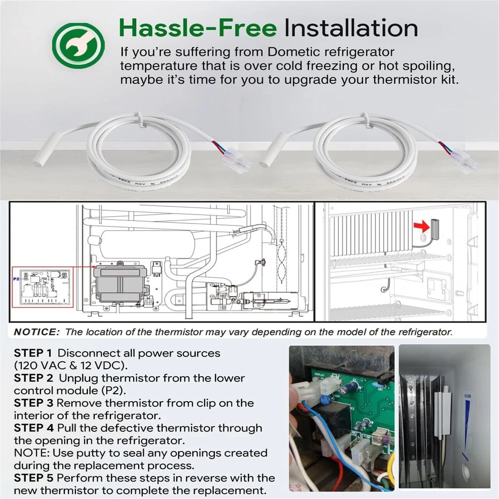 Replaces Part Numbers: Refrigerator thermostat for Dometic 3851210025 thermistor sensors. Replaces 2931863035, 2931863076, 3851059042. Applicable Model: Compatible with almost all Dometic RM,S,NDR & DM Series Models with two wire thermistor:RM1350 RM2351 RM2354 RM2410 RM2451 RM2454 RM2551 RM2554 RM2607 RM2611 RM2612 RM2620 RM2652 RM2663 RM2807 RM2811 RM2812 RM2820 RM2852 RM2862 RM3807 RM3862 RM3863 RM3962 etc.For S520 S530 S619 S620 S630 S819 S820 S830 S1521 S1621 S1631 S1821 S1831 etc. For NDR1062 NDR1292 NDR1492 etc. For DMC702 DMR702 DM2652 DM2672 Dm2682 DM2683 DM2852 DM2882 etc. Excellent Performance: Solve your refrigerator problems, the dometic 3851210025 refrigerator thermistor kit can sense temperature changes in the refrigerator and send a message to the control board Signals, which can easily solve your refrigerator temperature problems. You no longer have to worry about your fridge freezing all your food and not providing the right temperature. High Quality: This Thermistor is made from high-quality materials, with environmental protection epoxy resin coating and double-layer sealing, with better insulation sealing. Can be more accurately transmits a temperature change signal from -20°C to 105°C. Satisfaction Guarantee: We aims to provide the best service for our customer, if you're not 100% satisfied with our item, simply return it for a full refund in 60 days, no questions asked money back guarantee with 12 months’ warranty. Package Include: 2 x Thermistors