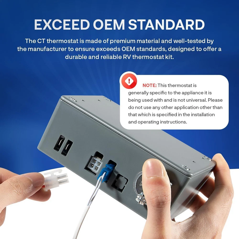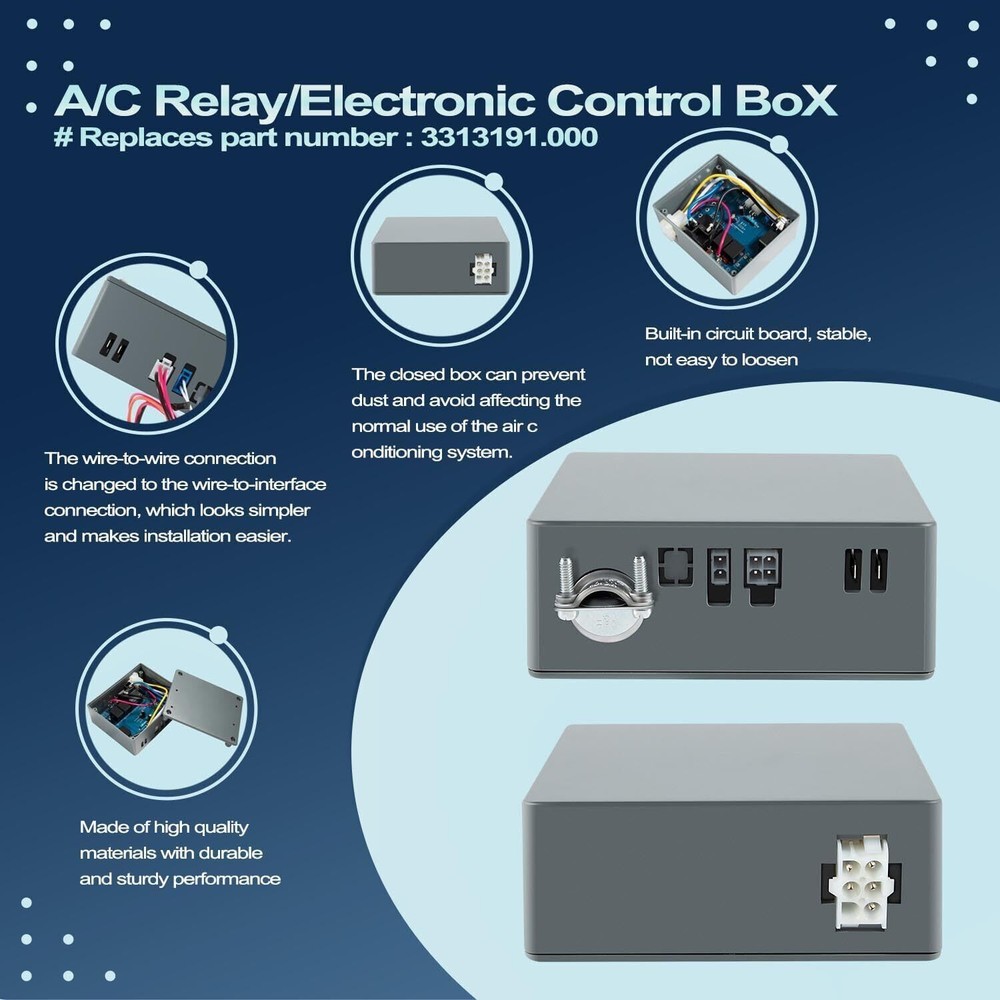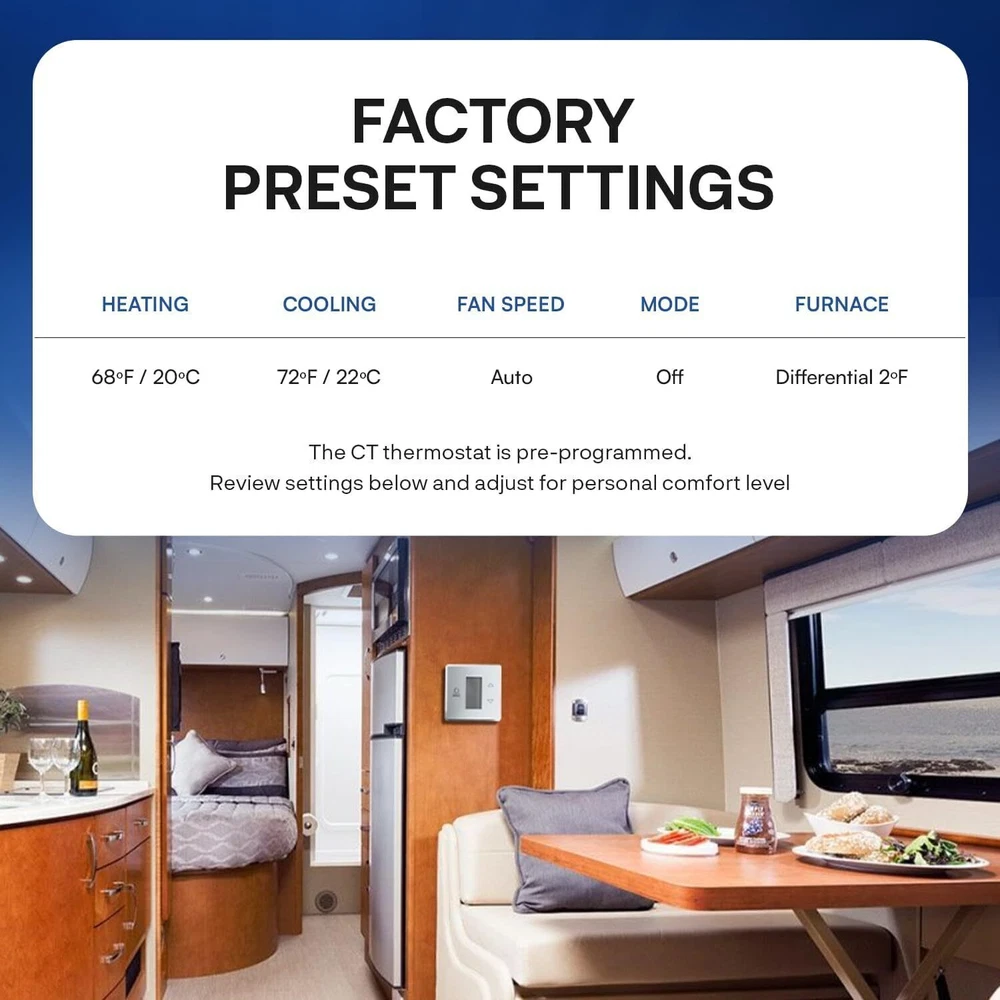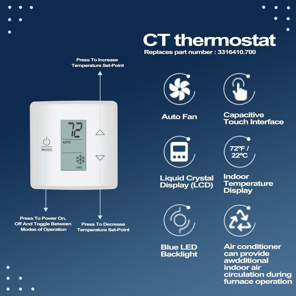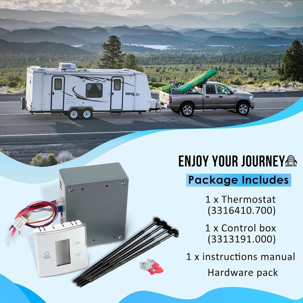 For Dometic CT Single Zone Thermostat 3316230.000 Thermostat Control Kit 12V DC Features: Application: This home thermostat kit is for use with air conditioner series: 540, 4579, 4595, 640. And fits for air conditioner models 457915, 459516, 459530, 540315,540316, 640310, 640310C, 640312, 640315, 640315C, 640316, 640316C, B57915, B59516, B59530, B79516, H540315, H540316. Replaces part number 3316230.000 and 3313189.000 Package Include: Includes thermostat (3316410.700) and control box (3313191.000), and hardware pack. Excellent Feature: This thermostat can be installed the wall of your RV or trailer, single zone controls cool/furnace. LCD digital display screen, easy to see your temperature, mode and set point. Polar white capacitive touch case with control board, you can gentle taps on three input areas of the control give you access to all the climate control features including low/ high/ auto fan speed control and auto/ on mode fan control. LCD Thermostat: This LCD thermostat for campers is constructed with high-quality materials, ensuring durability and reliable performance. The large custom LCD display provides easy readability, while the blue backlight enhances visibility in low-light conditions. The Single Zone LCD Thermostat allows centralized control of interior heating and cooling. Satisfaction Guarantee: If you have any inquiries regarding the RV Thermostat Kit (3316230.000), please do not hesitate to contact us. We offer a 30-day refund guarantee and a 12-month warranty for quality-related issues.