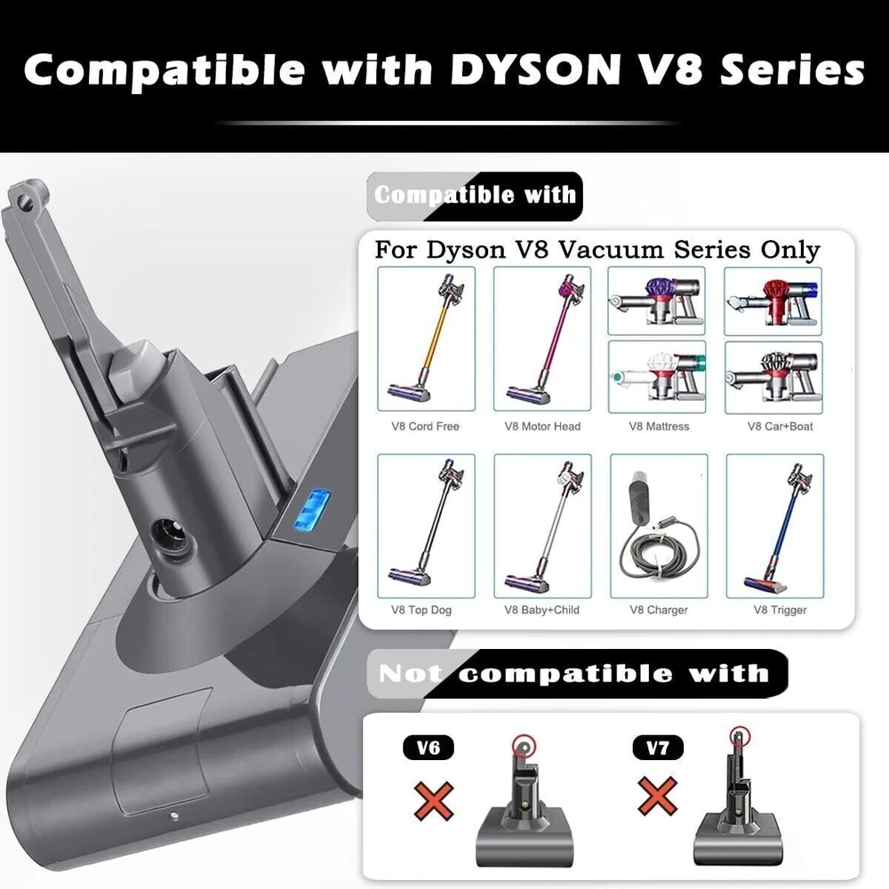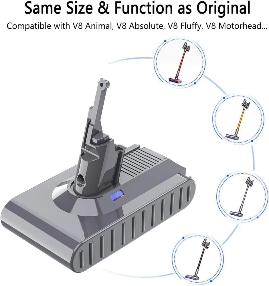 Product Description 21.6V 4000mAh Battery Replacement for V8 967834 Battery Compatible with Dyson V8 Battery V8 Absolute V8 Animal V8 Motorhead V8 Fluffy V8 Carbon Fiber Vacuum V8 Handheld Vacuum Cleaner SV10 Battery Cell Composition Lithium Ion Recommended Uses For Product Indoor/Outdoor Product Details: V8 SV10 Replacement Battery Compatible with Dyson V8 SV10 battery series Battery Type: Lithium-ion Battery Voltage: 21.6V Battery Color: Grey Capacity: 4000mAh TBDSV8 Battery Replacement for Dyson V8 SV10 Battery Compatible with Dyson V8 Vacuum Cleaner Battery Part Numbers: Dyson v8 animal vacuum, Dyson v8 absolute vacuum 214730-01, Dyson v8 fluffy vacuum, Dyson v8 motorhead vacuum, Dyson v8 hand-held series vacuum cleaner, Dyson v8 SV10 967834-02 96783402 vacuum cleaner and Dyson v8 animal cordless stick vacuum cleaner. Compatible with Dyson V8 Handheld Vacuum Models: For Dyson V8 Fluffy Vacuum, V8 Animal Cordless HEPA Vacuum Cleaner, 214730-01 V8 Absolute Cord-Free Vacuum, V8 Animal Cordless Stick Vacuum, V8 Animal Cord Free Vacuum, V8 Absolute Stick Vacuum Pet Hair Vacuum Cleaner, V8 Absolute Cord-Free Vacuum, V8 Absolute Cordless Stick Vacuum Cleaner, V8 Motorhead, V8 Motorhead Origin Vacuum. Package: 2 x Lithium batteries Payment Policy Shipping Policy Returns Policy CONTACT US 1.We accept payment by ebay. 2.We only post the item to your eBay shipping address, Please make sure your shipping address is correct and updated before you pay. 3. We have no responsibility for shipping address provided. Due to the secure reasons. we are not allowed the address change through email. Non-Paying Bidders: Serious Buyer Only! Please place bid or "Buy it now" only if you agree the price and terms of the product and no argument after the auction end. And payment for purchases must be received within 7 business days of the auction close. We will report Non-paying buyer to eBay . 1.All items will will be sent out through USPS /UPS within 24 hours after payment is cleared on the working days. Your parcel tracking number will be added to your ebay within 24 hours 2. The item will be sent to your address listed in the eBay or PayPal. Please make sure your shipping address is correct. 3. Please provide the phone number (add to it on your eBay shipping details) and detailed address with us after you pay the payment via PayPal. The phone number and detailed address is very important for expediting the delivery. Items delivery may be delayed without providing a telephone number. 4. Item delivery time depends on customs, the carrier, Holidays and weather condition in your location. If you wait until estimate delivery, you haven’t received item,Please logo your local post office tracking system to check. if you haven’t view the updated shipment, Please do contact us. We are contacting to Logistics Company and look your item exact location. If we cannot find your item. We will resend or full refund money to you. We do not want to give you a bad buying experience. Please do not open case within Estimated delivery time, because it is vital important to us. 5. You will be notified once the shipment has been made. 6. A business day is a normal weekday. Saturdays, Sundays, and major holidays are not business days. 1. All items have checked carefully before shipping. 2. We stand behind our quality products. We offer a 30 day hassle-free money back guarantee, return shipping is responsibility of the buyer unless the return is a result of our mistake (i.e., your receive the wrong item or defective). If you receive your item and it is defective or not working due to manufacturers defect, we will replace the item for you or refund. You will need to inform us through eBay messages system after you receive your item, Please tell us the Detailed Problem and we will try our best to solve it for you. 3. If within your one year warranty period your item has any problems, you may return the item for a replacement. 4. If you have any questions,please feel free contact us. eBay messages system instead of our email mailbox lest we can't receive your message!!! We will respond you as soon as possible. Payment Policy 1.We accept payment by ebay. 2.We only post the item to your eBay shipping address, Please make sure your shipping address is correct and updated before you pay. 3. We have no responsibility for shipping address provided. Due to the secure reasons. we are not allowed the address change through email. Non-Paying Bidders: Serious Buyer Only! Please place bid or "Buy it now" only if you agree the price and terms of the product and no argument after the auction end. And payment for purchases must be received within 7 business days of the auction close. We will report Non-paying buyer to eBay . Shipping Policy 1.All items will will be sent out through USPS /UPS within 24 hours after payment is cleared on the working days. Your parcel tracking number will be added to your ebay within 24 hours 2. The item will be sent to your address listed in the eBay or PayPal. Please make sure your shipping address is correct. 3. Please provide the phone number (add to it on your eBay shipping details) and detailed address with us after you pay the payment via PayPal. The phone number and detailed address is very important for expediting the delivery. Items delivery may be delayed without providing a telephone number. 4. Item delivery time depends on customs, the carrier, Holidays and weather condition in your location. If you wait until estimate delivery, you haven’t received item,Please logo your local post office tracking system to check. if you haven’t view the updated shipment, Please do contact us. We are contacting to Logistics Company and look your item exact location. If we cannot find your item. We will resend or full refund money to you. We do not want to give you a bad buying experience. Please do not open case within Estimated delivery time, because it is vital important to us. 5. You will be notified once the shipme