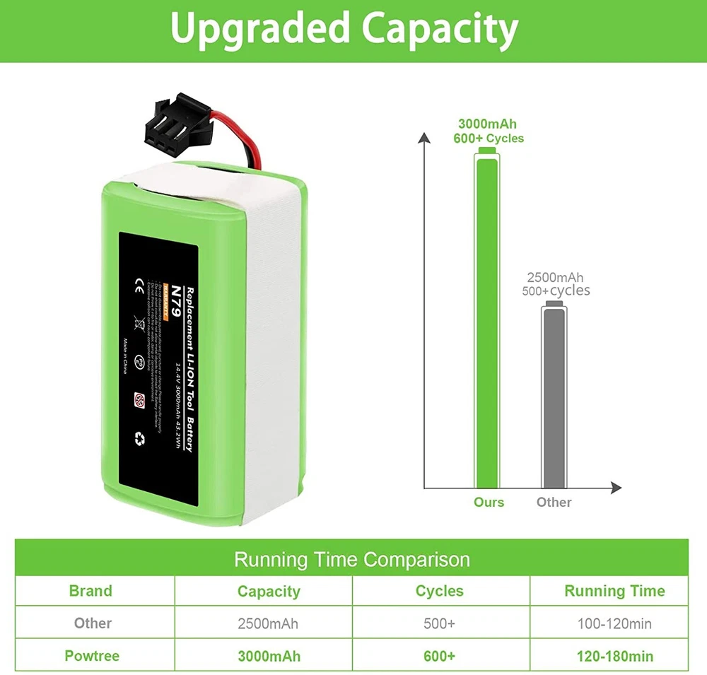 Product Description About this item Lithium-ion 🌳【Battery Type】Battery type: Li-ion battery,Voltage: 14.4V, Capacity: Upgraded 3000mAh(No Fake High Label Capacity). No memory effect, no pollution, and low self-discharge, can be charged or discharged as needed without loss of capacity. 100% compatible with original charger. 🌳【Compatibility】Compatible with Ecovacs Deebot N79S, Deebot N79, Deebot DN622, Eufy RoboVac 11, RoboVac 11S, RoboVac 11S MAX, RoboVac 12, RoboVac 15T, RoboVac 15C, RoboVac 15C MAX, RoboVac 30, RoboVac 30 MAX, RoboVac 30C, RoboVac 35C, G10 Hybrid, G30, G30 Edge, G30 Hybrid, G30 Verge. See more compatible model in description. 🌳【600+ Recharge Cycles】POWTREE 3.0Ah Ecovcas battery replacement can be recharged up to 600+ cycles of use. No memory effect, low self-discharge rate and long-lasting battery life 🌳【High Quality】Battery uses the highest quality cells, safe with rapid-charge technology while providing overcharge and over discharge multiple protection to increase the life of the battery. Reliable safeguard features with the protection for short-circuit, output over-voltage, over-heat and output over-current. Perfect Battery Management System, high-end protection IC. Power Battery to support max. 8A discharge. Compatible with Ecovacs N79S, 500, N79, N79SE, N79W, DN622, DN622.11 Robot Vacuum Cleaners. 14.4V 3000mAh Li-ion rechargeable replacement battery makes vacuum lasting around 100 minutes per charge. Easy to install, local sale support, 24/7 response to online messages, 12 months warranty. Futures : 3000mAh High Capacity Battery Li-ion Rechargeable battery, convenient to use. And it has no memory effect. Can be charged or discharged as needed without loss of capacity. Same size & function as original battery, don't worry damaging your robot. Quick charge and easy to install. ISO9001, RoHS, and CE certified NO FAKE HIGH "LABEL" CAPACITY High Performance Li-ion Battery with 600+ Recharge Cycles With 3000mAh capacity, the battery can last 120-180 minutes after being fully charged (Depending on use & setting), like the original. Built-in multiple protections against overload, overvoltage, overcurrent, short circuit and internal overheating, ensure effective and safe cleaning in your home. Imported high density lithium battery, higher cost, better performance, more durable(can be recharged 600+ cycles) Compatible With:(use"Ctrl+F" to find your own PN & Model) Compatible for Deebot Series: Ecovacs Deebot N79, Deebot N79S, Deebot 600, Deebot 601, Deebot DN622, Deebot 661 Compatible for RoboVac Series:Eufy RoboVac 11 (T2102), RoboVac 11S (T2108), 11S MAX (T2126), RoboVac 12, 15T, 15C (T2120), 15C MAX, 25C Max, 30, 30C, 30 MAX, 35C, G10 Hybrid, G30, G30 Edge, G30 Hybrid, G30 Verge Compatible for :for Conga 990, Tesvor x500 NOT Compatible with: NOT for Eufy RoboVac 11+, iLife A4/A4S/A4S pro/A6/A9/V7/V7S/V7S pro Compatible Models For Eufy RoboVac 11, RoboVac 11S, RoboVac 11S MAX For Eufy RoboVac 12, RoboVac 15C, RoboVac 15C MAX, RoboVac 15T For Eufy RoboVac 30, RoboVac 30C, RoboVac 30 MAX, RoboVac 35C For Ecovacs Deebot N79,Ecovacs Deebot N79S,Ecovacs Deebot DN622 Ecovacs Deebot N79, Deebot N79S, Deebot DN622, Deebot DN621, Eufy RoboVac 11, RoboVac 11S, RoboVac 11S MAX, RoboVac 15T, RoboVac 30, RoboVac 30C Max, RoboVac 15C, RoboVac 15C MAX, RoboVac 12, RoboVac 35C. For Eufy RoboVac 11, RoboVac 11S, RoboVac 11S MAX For Eufy RoboVac 12, RoboVac 15C, RoboVac 15C MAX, RoboVac 15T For Eufy RoboVac 30, RoboVac 30C, RoboVac 30 MAX, RoboVac 35C For Ecovacs Deebot N79,Ecovacs Deebot N79S,Ecovacs Deebot DN622 For Eufy RoboVac 11, RoboVac 11S, RoboVac 11S MAX For Eufy RoboVac 12, RoboVac 15C, RoboVac 15C MAX, RoboVac 15T For Eufy RoboVac 30, RoboVac 30C, RoboVac 30 MAX, RoboVac 35C For Ecovacs Deebot N79S, 500, N79, N79SE, N79W, DN622, DN622 About Us Welcome to our store! We are a professional worldwide wholesale company. High product quality, reasonable prices, excellent customer service and a reliable credit standing is our tenet.If you like our products, please add my eBay shop to your "My Favorites" list. All the products we are selling include factory warranty , don’t cover items that have been abused, burned and damaged in any form. Payment We accpet payment via PayPal , E-wallet , some Credit Card , Direct Debit and Other specific payment methods. Import duties,taxes and charge are not included in the item's price or shipping cost.These charges are the buyer's responsibility. Please check with your country's customs office to determine what these additional costs will be prior to bidding or buying. Insurance is included in the Shipping & Handling costs paid. Shipping Items are generally shipped out in 1-3 business day after your payment has been cleared (Sat. & Sun. excluded.) Orders from the United States Warehouse will be shipped out via USPS or UPS. The shipment usually takes 3-7 business days(Saturday and Sunday excluded), if you need the item urgently, please contact us for detail before purchasing. Local pick up is not available. Orders from China will be shipped via Belgian Post or Post NL.The shipment will take 15-35 working days,please contact us if you didn't get the parcel for a long time. We do not ship to APO, FPO, Alaska, Hawaii and Puerto Rico addresses, and we are unable to ship to PO BOX for this item. Please provide your psychical address. Returns You have 60 days to return it from the date it was received. All returned items must be in the original package and you must provide us with the shipping tracking number,specific reason for the return and your ebay ID. We will refund your full winning bid amount , upon receipt of the item in its original condition and package with all components and accessories included. Contact Us Dear buyers,we appreciate your business, if you are satisfied with our service , please leave us a Positive feedback and rate the details of the transaction (Detailed Seller Ratings) with a " Pefect Stars ". We