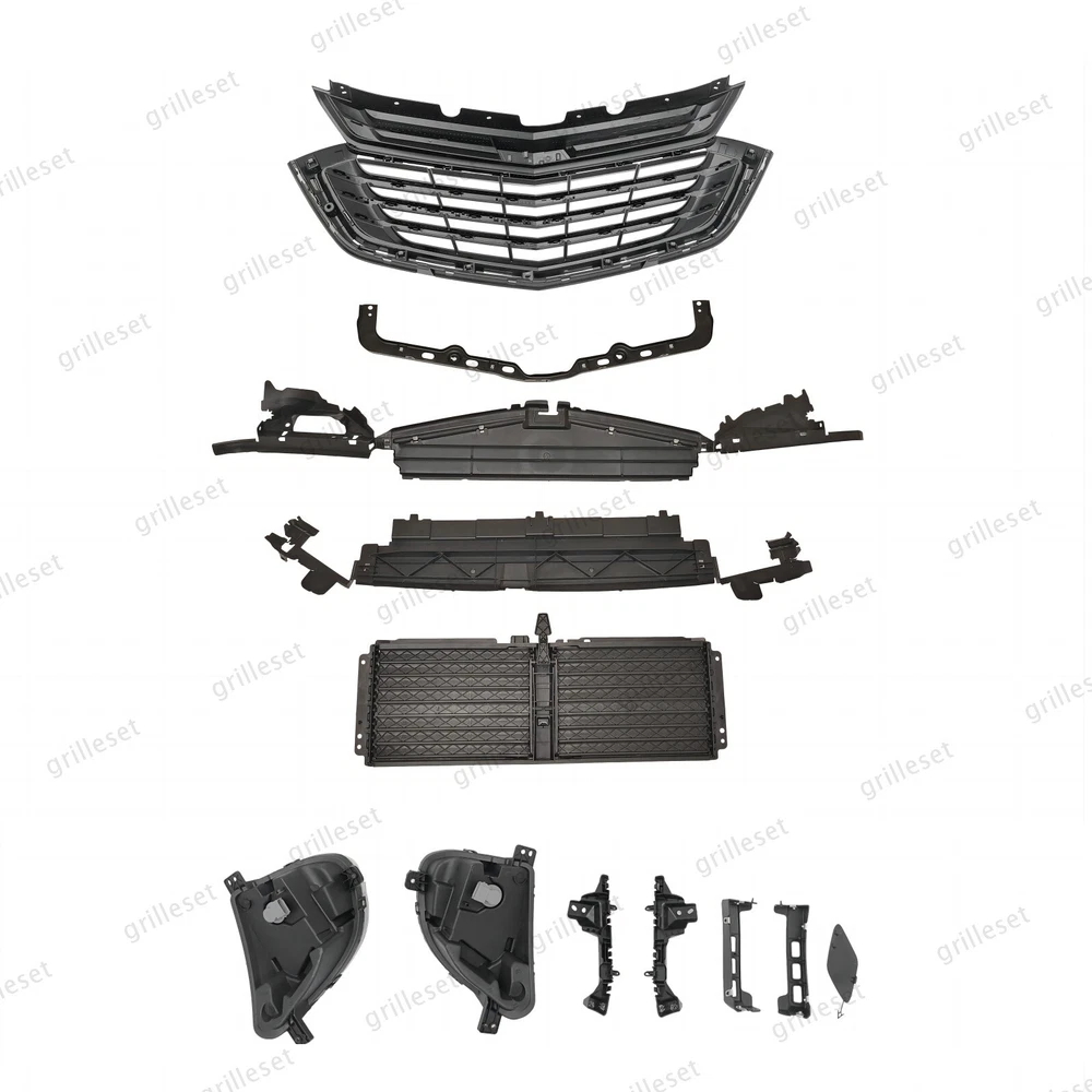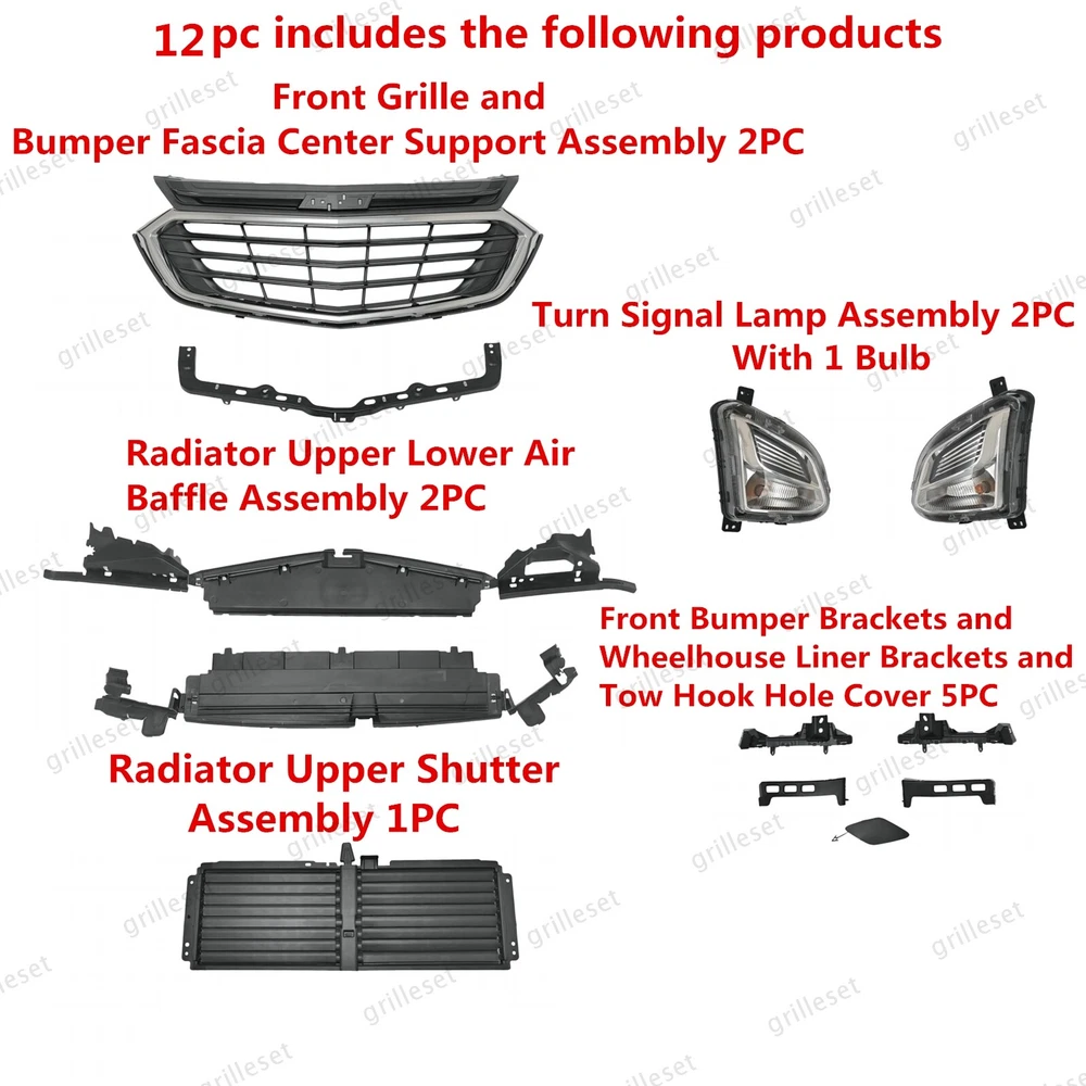 Fit for : Chevrolet Equinox 2018-2021 L, LS,LT 1 Set (12 PCS) Includes:(See more pictures for details) 1 Pc front upper black grille with chrome trim 1 Pc front b umper fascia center support assembly 1 Pc front radiator upper air baffle assembly 1 Pc front radiator lower air baffle assembly 1 Pc front radiator upper shutter assembly 2 Pcs f ront turn signal lamp assembly with 1 bulb 2 Pcs front bumper brackets 2 Pcs front wheelhouse liner brackets 1 Pc tow hook hole cover Item OE number : 84150736;84129794;84618992;84273390;84460245;84226245;84226246;84293393;84293394;23227561;23227562;84431746 Installation : Perfect fit direct replacement, no modifications required. Installation manual not provided; we recommend professional installation. Item's-Features : Superior quality kit 100% brand new Made from high-quality materials Excellent replacement part, no modifications needed Other parts fit for