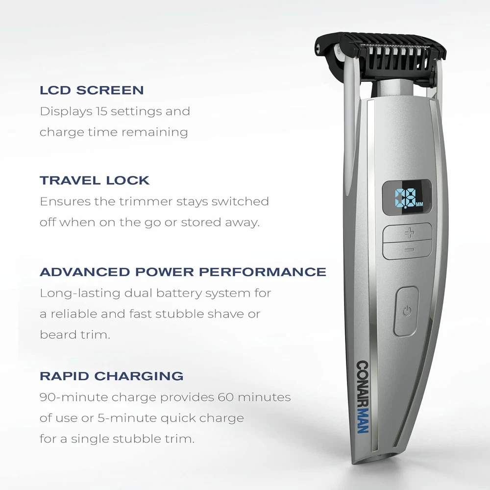 Product Description ConairMAN Beard Trimmer for Men, for Face and Mustache, Wet/Dry Beard and Stubble Trimmer, Flex Contouring Head with 15 Precise Settings and Premium Unqiue Flex Contouring Head: with 15 precise settings, the ConairMAN Beard and Stubble Trimmer tracks the curves of your face for exceptional accuracy and comfort for the perfect beard and stubble trim. Also safely and precisely trims body hair. Advanced Blade Technology: Skin-friendly, premium etched blades for extreme sharpness and durability. The ConairMAN Beard and Stubble Trimmer also has as a flip-back guide comb for edging and detailing. Beard Trimmer with Digital Length Control: the ConairMAN Beard and Stubble Trimmer offers 0.4 mm to 5.0 mm with precise automatic adjustments for ultimate length control. The LCD Screen displays selected length and charge time remaining. Use Cord or Cordless: The long-lasting dual battery system offers advanced power performance for a reliable beard and stubble trim. A 90-minute charge provides 60 minutes of cordless use or 5-minute quick charge for a single stubble trim. Respect The Ritual: Don't crack under the pressure to look good. ConairMAN has beard trimmers, home haircut kits, electric shavers & more for precision cuts & trims so you can get your look right. About Us We are a reputable seller with many years of experience selling on eBay. Our goal is to provide high-quality products and excellent customer service. Shipping Items will be shipped within 1-3 business days when we received payment. (Orders are not processed on weekends & holidays) Tracking information will be sent once item is shipped. Delivery time depends on destination and other factors Item is shipped to ebay address. Leaving correct address can minimize delay. For international shipping and shipping to Guam, Hawaii and Alaska, Please contact us before placing the order. International buyers please note: Import duties, taxes and charges are not included in the item price or shipping charges. These charges are buyer’s responsibility. We will try our best to reduce the risk of the custom duties. Local pick-up is unavailable at the moment. Contact Us We reply any email messages within 1 business / working days(off-duty at weekend). If you do not get a response from us, then please check your junk or spam mailbox. Our Business hours: Mon-Fri 9:00-18:00, UTC/GMT +8 hours. Please contact us either by clicking "contact seller" in the "purchase history" section or simply click "ask a question" at the bottom of this page. If you are unsatisfied with our item or service, please contact us before leaving any feedback. We are committed to resolve all issues in a friendly and satisfactory manner.