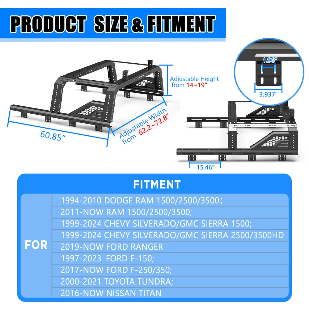 Head Lights Tail Lights Fog Lights Turn Signal Bumper Fender Flare Inner Fender Hubcaps Refrigerator Other Items for sale Head Lights Tail Lights Fog Lights Turn Signal Bumper Fender Flare Inner Fender Liners Portable Refrigerator For Ford Chevy Full-size Pickup Trucks Adjustable Front+Middle Bed Rack Roll bar Specification Material: Steel Mounting Hardware: Included Surface Finish: Black Powder Coated Finished Surface: Anti-corrosion Textured Powder Coating Adjustable Length:62.2~72.8 inches Adjustable Height:14~19 inches Features Full New: 100% brand new and premium quality. Fitment: Compatible with All Full Size Trucks Material: The heavy duty steel construction and black powder coat finish make your truck feel good. Perfect for use in extreme temperatures and weather. Unique Design: Cold-rolled steel plate with black powder coating, equipped with welding technology, safe and non-toxic, has excellent anti-corrosion performance and electrical insulation performance, greatly improves the service life of the product, and effectively prevents the generation of rust. Warranty: 1 year manufacturer's warranty, 60-day return policy, premium quality and after-sales service, you can buy with confidence! Professional After-sales: If you have any questions, you can contact us, we have a professional after-sales team to solve your doubts! Fitment For 1994-2010 Dodge Ram 1500/2500/3500 For 2011-2024 RAM 1500/2500/3500 For 1999-2024 Chevy silverado/GMC sierra 1500 For 1999-2024 Chevy silverado/GMC sierra 2500/3500 HD For 2019-now Ford Ranger For 1997-2024 Ford F-150 For 2017-now Ford F-250/350 For 2000-2021 Toyota Tundra For 2016-now Nissan Titan Package Include 1 x Truck Bed Roll Bar(Front+Middle) 1 x Set of Mounting Accessories (Lights are not included) Payment Shipping Return About us Contact us Payment Appreciated for the prompt payment, Contact us if bid by mistake, system open unpaid item automatically. Payment must be complete within 3 days from the date you purchase or after the end of auction. Items unpaid within 3 days of the auction end will be forfeited. We reserve the right of cancel the order and re-selling the items. Shipping All shipment will ship by UPS or USPS . All items will be ship within 1 working days , and we will ship out all orders as soon as possible after payment verified, please allow up to 1-4 business days for delivery. CANADA & International customers please note: your government might charge a duty tax (brokerage fees). We do not responsible for any custom duty or import tax. Why Choose the US Stock? 1. Us Local Shipping, No Extra Customs Cost to the US. 2. Fast Delivery: 1-4 Working days Delivery. 3. Best After-Sales Service!!! Return The buyer is responsible for all return shipping including a result of customer error or defective item. 1) If you received an incorrect, damaged, defective, or item not as described, contact us for full refund or replacement on our cost. 2) If you want to return the item, please contact us within 60 days after package received. Return products must also be in its original condition: including box, packaging and all other accessories. About us We are the best auto parts, we have been pursuing excellence, continuous exploration as the slogan, let customer satisfaction is our purpose! We adhere to the United States local delivery, one year warranty! Welcome! Contact us How Should You Contact us? Please Read The Item Description And See if The item Fits Your Vehicle Exactly. If You Found Any questions, Feel Free to email us by "Ask a question" Our Office Hours Are Monday - Friday 8:00am - 5:00pm PST / 11:00am - 8:000pm ET, We Do Not Answer Any E-Mails On Weekend, And We Will Reply All E-Mails In The Order It Was Receive. All E-Mail Take Us Around 24 Hours To Respond To Any E-Mail. We Are Close During The Weekends And We Do Not Answer Any E-Mails During That Time.