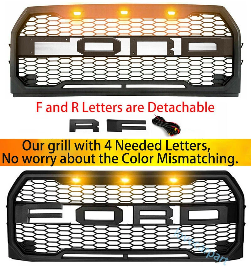 Product Description Specification: Color: Matte Black Material: Durbale ABS Plastic Part F&R Letters are detachable.You coud paint the grille in color you need. Feature: 1.Products: This grill fit for f150 2015-2017 Ford F150. 2.Fitment:Fits for 2009-2014 Ford F150 raptor grill comes with three LED lights and FORD logo letters. 3.Features: The grill is made of ABS plastic that is lightweight and durable, giving your vehicle full protection on-road and off-road. Provides better airflow to the radiator to help the cooling process better. 4.Color: Luxury matte black front grill add more aggressive and rugged style to your front end. 5.Easy to Install: This grill replacement is very easy to install, you just unscrew the old one, and replace it with the new grill. All needed wiring harness of LED Accents are provided, so simply splices into existing factory headlight harness. Installation can be completed with only essential hand tools. Package Include: 1x Front Grille 1x F&RLetters 3x Amber LED Lights 1x Wire Harness About Us Payment Terms Returns Contact Us Figocarpart is one of US’s fastest growing online retailersWith our best effort, we are now trusted by more than 100,000 customers nationwide. We are dedicated to offering you an unrivalled choice of products with unbeatable low price and best quality. We ONLY accept Paypal. We ship to your eBay or Paypal address. Please make sure your eBay ID、contact and Paypal address is correct before you pay. Thank you! 1.If item is defective and not working on arrival, please contact us within 7 days of receiving the defective for repair or refund. Item may be returned within 30 days of purchase upon your receipt.All items returned must contain all original packaging materials. 2.This item have 1Year warranty. We offer free repairing service within 6 months from the date of purchased. If damaged is caused by undue wear and tear, dirt, misused, improper installation/operation, accident or repaired by unauthorized person, the warranty becomes void. 3.All returns must have prior authorization. Please message us firstly if you have any problem. Please contact us before you return the item. 4.Buyer is responsible for the return postage. If you ask for a refund during valid period, we will offer you a refund without postage charges. Shipping and handling charges, insurance are not refundable in any case. We are only responsible for once re-sending expense for replacement due to defects. Please contact us firstly if you have any problem. * We give you a 30 days money-back guarantee to return any items purchased, no questions asked, hassle-free. * You can return for refund or exchange same product or different product (difference of price will be charged) within 30 days after you receive the item. * Any returning or exchanging items must be in the original package and new condition. We reserve rights to refuse refit or damaged items (caused by buyer) for return and exchange. * No returns will be accepted if you contacted us after 30 days of receiving the item. * Return fee: Buyers are responsible to pay the return shipping fee. 15% restocking fee on total price will be charged and be deducted from the refund total. * Exchange fee: No restocking fee will be charged, however Buyers are responsible to pay the return shipping fee and exchange reshipping fee, depending on the weight of merchandise. * Email our Customer Service Department first before return the item back. Please specify your item number, your eBay ID, and the reason for the return. Click here to contact us directly. Any questions, pls contact us via ebay message or email us.We will reply your message within 48 hours. If you do not receive our reply within 48 hours, pls post a message again because sometimes our message system may block some emails. About Us Figocarpart is one of US’s fastest growing online retailersWith our best effort, we are now trusted by more than 100,000 customers nationwide. We are dedicated to offering you an unrivalled choice of products with unbeatable low price and best quality. Payment We ONLY accept Paypal. We ship to your eBay or Paypal address. Please make sure your eBay ID、contact and Paypal address is correct before you pay. Thank you! Terms 1.If item is defective and not working on arrival, please contact us within 7 days of receiving the defective for repair or refund. Item may be returned within 30 days of purchase upon your receipt.All items returned must contain all original packaging materials. 2.This item have 1Year warranty. We offer free repairing service within 6 months from the date of purchased. If damaged is caused by undue wear and tear, dirt, misused, improper installation/operation, accident or repaired by unauthorized person, the warranty becomes void. 3.All returns must have prior authorization. Please message us firstly if you have any problem. Please contact us before you return the item. 4.Buyer is responsible for the return postage. If you ask for a refund during valid period, we will offer you a refund without postage charges. Shipping and handling charges, insurance are not refundable in any case. We are only responsible for once re-sending expense for replacement due to defects. Returns Please contact us firstly if you have any problem. * We give you a 30 days money-back guarantee to return any items purchased, no questions asked, hassle-free. * You can return for refund or exchange same product or different product (difference of price will be charged) within 30 days after you receive the item. * Any returning or exchanging items must be in the original package and new condition. We reserve rights to refuse refit or damaged items (caused by buyer) for return and exchange. * No returns will be accepted if you contacted us after 30 days of receiving the item. * Return fee: Buyers are responsible to pay the return shipping fee. 15% restocking fee on total price will be charged and be deducted from the refund total. * Exchange fee: N
