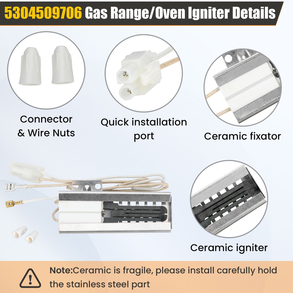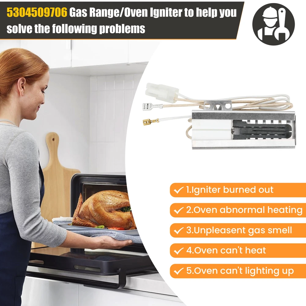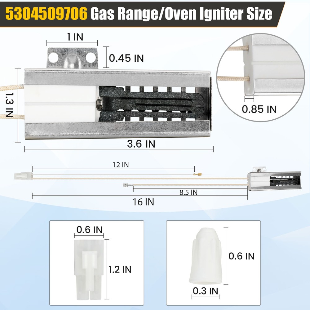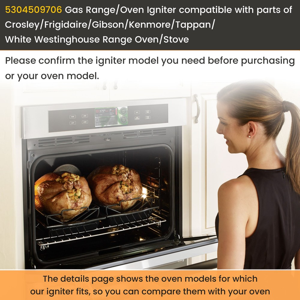 gtin13: Does not apply Suitable For: Gas Oven Range Igniter Power: Gas Material: Brass Color: White Brand: Kenvc Compatible Brand: Frigidaire, Kenmore, GE, Crosley, Tappan, Westinghouse, Gibson Item Height: 3 inches Type: Igniter Compatible Model: 5304509706 Power Source: Gas Manufacturer Color: White UPC: Does not apply Item Weight: 5.9 ounces Installation: Built-In/Integrated MPN: Does not apply Country of Origin: China Model Number: 5304509706 Item Width: 3 inches Item Length: 6 inches Manufacturer Warranty: 1 Year
