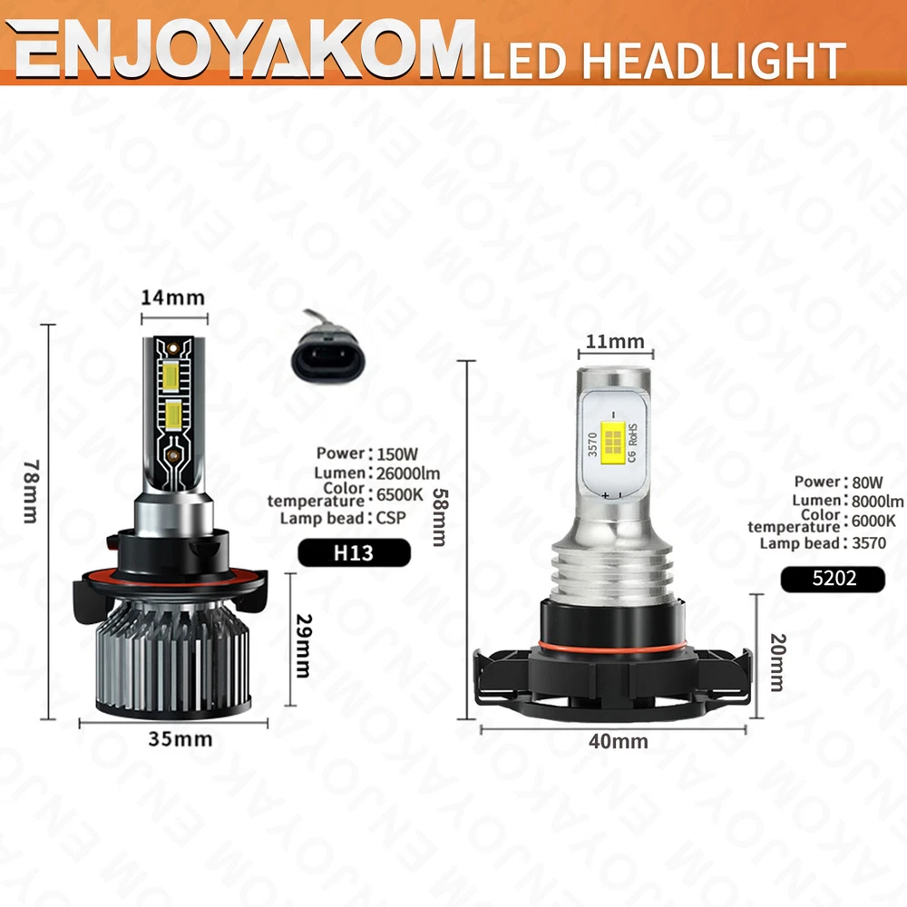 EAN: Does not apply Placement on Vehicle: Front, Left, Right Size: the same as the car original light Bulb Fitment Code: 9008/H13 + 5202/2504 Manufacturer Part Number: 9008+5202 Fitment Type: Direct Replacement Wattage: 150W Light Color: Cold White To Fit: Headlight OE/OEM Part Number: 6500K LED Headlights Number of Bulbs: 4 Voltage: 9V-36V Material: Aviation 6063 aluminum profile Superseded Part Number: Replacement Halogen Xenon Led Light Bulbs Interchange Part Number: 9008 High Low beam+ 5202 Fog light Vintage Part: Yes Lumens: 26000lm Brand: ENJOYAKOM Lighting Type: Specialty Head Light Bulb Type: Headlight Kit Manufacturer Warranty: 5 Year Other Part Number: H13 high low beam + 2504 Fog light Chips Type: CSP LED Chips, Super Bright Model: LED Headlight Conversion Kit UPC: 435230842739 Bulb Life Hours: Up to 50000 Hours Performance Part: Yes Lighting Technology: LED Color Temperature: 6500K Universal Fitment: No gtin13: 435230842739 Ballast Included: Yes Suitable For: High Beam, Headlight, Low Beam, Fog Light Features: CAN bus Compatible, road Legal, Rust-Resistant
