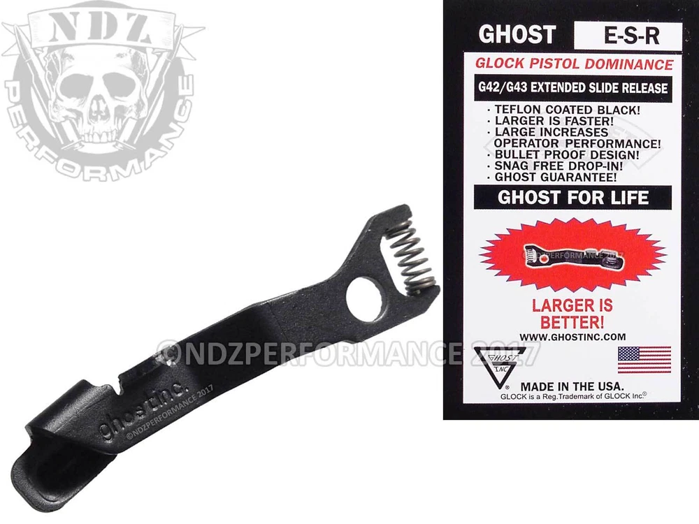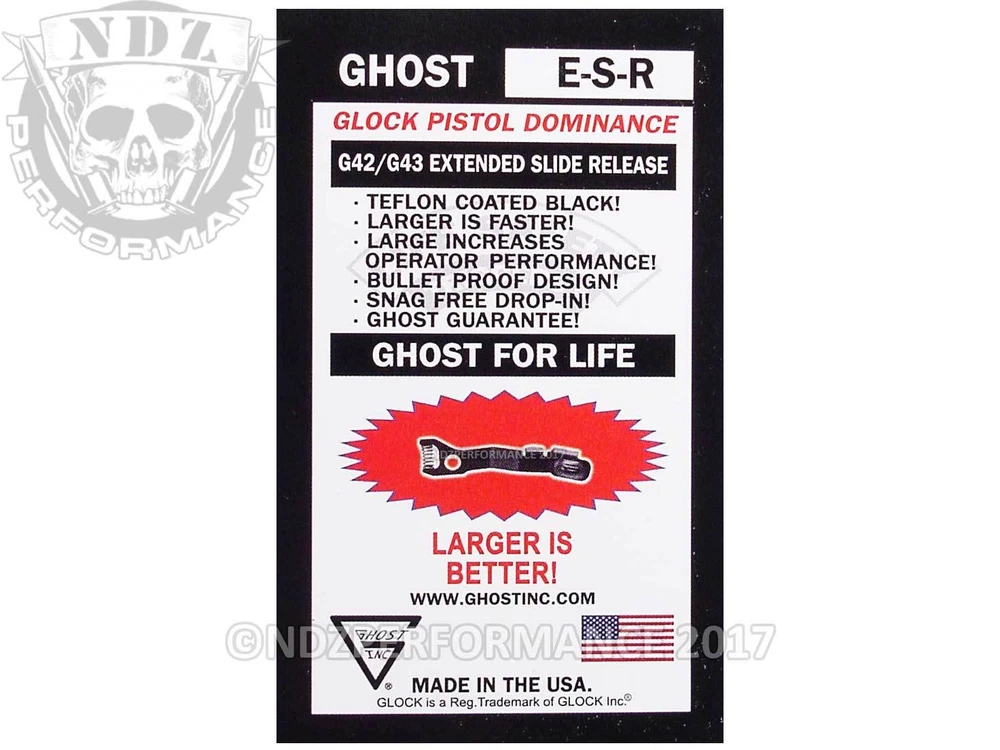 Ghost ESR Extended Slide Release - Teflon Black Coated - for Glock 43 43X 48 Disclaimer: "GLOCK" is a federally registered trademark of Glock, Inc. or Glock Ges.m.b.H. NDZ Performance has NO affiliation in any manner with, or otherwise endorsed by, Glock, Inc. or Glock Ges.m.b.H. The use of ''GLOCK'' on this page is merely to advertise the sale of parts or model these components work with. Ghost ESR Extended Slide Release Teflon Coated Black for Glock: 43, 43X, 48 This ESR - Extended Slide Release is designed for aggressive manipulations for positive slide releases and stopping under the most adverse conditions. Ghost designed the ESR because larger is better, faster and gives you a definite advantage. Large enough for fast controlled executions but streamlined to be unobtrusive. These features enable you to dominate your Glock. This part is made with the finest Stainless Steel with a Teflon Coated Black finish and requires no pistol modifications for use. Remove the slide and trigger pin, swap out the OEM Slide Stop Release, re-assembly and you re in business. All Ghost Inc products feature a Lifetime Warranty direct from Ghost Inc which covers product(s) against manufacturer defects, user installation and use of the product(s). NDZ Performance offers fast handling time; ships same to next business day with tracking provided!! Visit our store for more items here !! Click here; View Our Feedback !!! BUY WITH CONFIDENCE, READ OUR FEEDBACK - WE HAVE THOUSANDS! Thank You for choosing NDZ Performance! Shipping Almost all of our items ship domestic for FREE! See individual items for details. This includes the United States and territories, FPO's APO's and PO Boxes. We process and ship all orders within same to following business day; Monday - Friday. Although most of our items qualify for Free USPS First Class Mail we do offer additional services that can be selected at check out. Your order will ship with the carrier selected and per their shipping time frames estimates. While the seller controls Handling Times, eBay displays the On or Expected Delivery time frames which is based on their algorithm. We as the seller do no guarantee specific dates for delivery. You will receive an email and tracking information for all orders when your order is processed. Please allow up to 48 Hours for the tracking information to update per the carriers. All shipments are to our outbound location and picked up daily. All USPS First Class Mail shipments follow an estimated 5 to 7 business day (M-F) transit time frame with some deliveries seen as early as 3 and as late as 10 business days based on location and transit days. In the event there is a shipment inquiry after a posted delivery has been made we request contact is made to the carrier’s offices of the location. Business days are defined as Monday through Friday and exclude Weekends and All Major US Holidays. We offer very competitive USPS shipping rates on our international orders. Please Note: USPS First Class International shipping is a non-trackable service. Should you wish to track a package, please select a serviced such as USPS Priority or USPS Express. We take great Pride in packaging and processing every shipment leaving our facility. Returns Items must be in "new, unaltered and unused condition" with all included components and accessories (if applies). Definition of new, unaltered and unused condition is: Without showing signs of wear or damage in any way Returns as stated within the item description and or per ebay return guidelines. Must not be a special order or a custom order No Returns Accepted on items liquidated or Clearance (unless otherwise stated within listing) If an item is received damaged or is incorrectly shipped by us please contact our Customer Support immediately by the eBay Message Center. We ask to please allow 24 to 48 business hours to address messages received. We warranty all products manufactured in house. Products manufactured by other companies will follow their individual warranties. Refunds are contingent upon inspection of item(s) once we receive it. Note: a 10-50% restocking fee may apply for returned items, please see each item for details. Refunds will be for the product sales amount only Here at NDZ Performance, we operate a full manufacturing facility, our own graphics department and a sales team dedicated to making every experience a great one. We have the common sense, talent, experience to get the job done quickly and effectively. In the event we do not have the information requested for you we will always provide the best source to get you the most accurate answers. All NDZ manufactured products carry our warranty services against manufacture defects and we ask contact is made in the event there is ever a question. Rest assured that, every part we manufacture is made right here in the United States. Contact Us We also offer one of the quickest turn-around time for our products. We ship daily and do our best to ship your order the same day to following business day. NDZ Performance is committed to the ultimate shopping experience, providing the best quality product and one-stop-shop for all your informational needs, topped with excellent presentation and customer service. If you have any follow up questions, comments or concerns, feel free to send us a message through eBay. Please allow 24 to 48 business hours to address messages, and make sure to include as much information as possible to help ensure quality service. The more information provided at once allows us to address any concerns much more efficient therefore please provide ONE detailed message and allow us time to response.