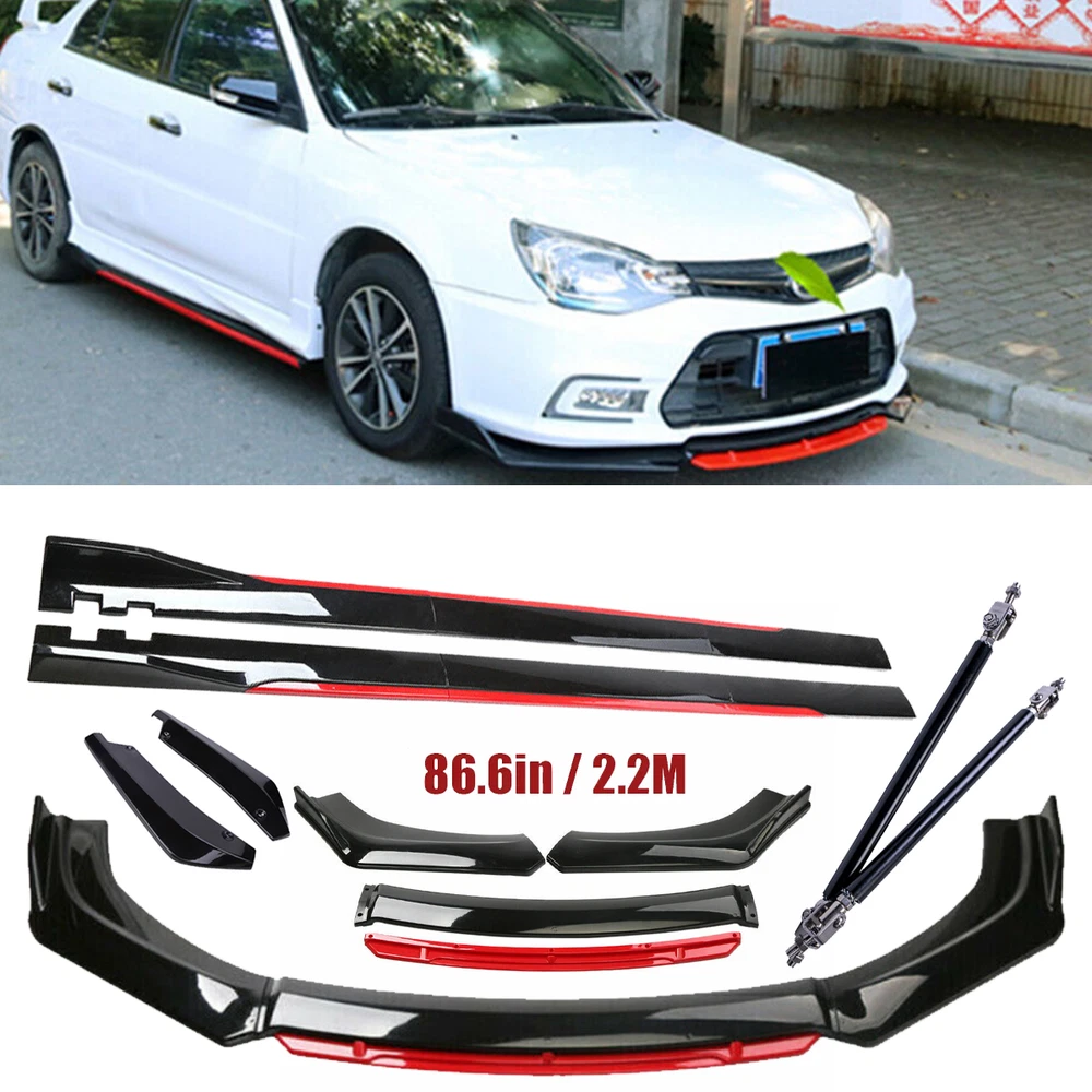 ackage 1. Front Bumper Lip Spoiler Splitter(5pcs) This front bumper lip splitter is fit for most models with front bumper size around 1750mm~1950mm. Feature: -Direct Fit. -Easy install and durable use. -Great quality and great Fitment. -Correct Connector No cutting or splicing. -Strict quality control standards to Build and test. -It'll give you a sporty look without making it too aggressive. -Light in weight and enduring, different optical line comes from different points of view. *Instruction Not Included, Professional Installation Is Highly Recommended.* Specification: -Type:Front Lip Chin Bumper Body Kit -Material:ABS -Color: Glossy Black +Red (as pictures show) -Placement on Vehicle:Front;;Lower -Fitment Type:Performance/Custom This front bumper lip body kit is suitable for most small cars and simple. And the flanks on both sides can be adjusted to make it more suitable for the width of the front of your car. Package 2. 2 x 86.6" Side Skirt Extension ( 6pcs ) Specification: Condition: 100% Brand New and High Quality Type: Car Body Side Skirts Material: Made of high quality PP plastic, Durable Color: Glossy Black +Red (as pictures show) Side Skirt Length: 86.6in / 2.2M Position: Side Skirt Extension Features: Universal modified side skirt for car sedan. While the side skirts don't affect the front ground clearance too much, it enhances the side extension of the in a very pure and exciting way. A Perfect Aftermarket Replacement. Professional Installation Is Highly Recommended. Package Included 3 Rear Lip Specification: Condition: 100% Brand New and High Quality Type: Car Body Rear Lip Material: Made of high quality PP plastic, Durable Color: Glossy Black (as pictures show) Surface Finish: Glossy Black Style Rear Lip Size:48cm/19“ Placement on Vehicle: Left, Right Package Included 4 2pcs Splitter Rods Material: premium quality aluminum alloy The length can be adjustable from 8" to 11" Fitment: Universal Note: Require drilling holes into the bumper lip diffuser to attach safely to the vehicle. Package Includes: 4 pcs /set Front Lip Chin Bumper Body Kits 2 x Side Skirts 2 x Rear Lip 2 X Splitter Strut Rods 1 x Screws kit Note: Installation instruction is not included, professional installation is recommended. Please allow 1-3CM differs due to manual measurement.