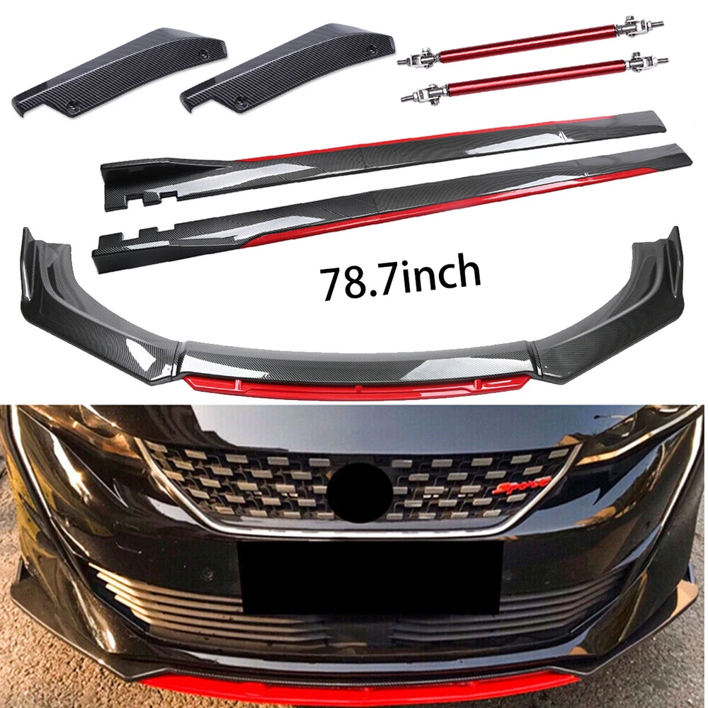 Home Payment Shipping About us Contact us Details Front Lip Chin Bumper Feature: Made of Updated durable and sturdy PP plastic, adding stiffeners, no deformation in long-term use. More longer and wider than others. Provide an elegant and personalized appearance. Prevent the car from being scraped and improve the level of the decoration of the car. Come with screws, More convenient installation and stable installation. This is a set(4 pieces) front bumper cover lip front spoiler Instruction Not Included, Professional Installation Is Highly Recommended. Specification: Type:Front Bumper Lip Body Kit Spoiler Material:ABS Color:Carbon Fiber Look & Red Weight: about 3.5 lbs Placement on Vehicle: Front;Lower Fitment: Fits for car universal: Honda, Toyota, Mazda, Subaru, vw, lexus, Audi, BMW, Benz, Ford, VOLVO,Jetta,Scion,Nissan,Infiniti,ect. (You can contact us if you have any concerns). Side Skirt Specification: Condition: 100% Brand New and High Quality Type: Car Body Side Skirts Material: Made of high quality PP plastic, Durable Color:Carbon Fiber Look +Red Surface Finish:Glossy Black Length Size: 2m/78.7 inch (Make Sure this 2m is the size you want!!!) Position: Side Skirt Extension Features: Universal modified side skirt for car sedan. While the side skirts don't affect the front ground clearance too much, it enhances the side extension of the in a very pure and exciting way. A Perfect Aftermarket Replacement. Professional Installation Is Highly Recommended. Package 3: Strut Rods (2PCS) Specification: Quantity: One pair (2 pieces) Material: Made with premium quality aluminum alloy finish Color: Glossy Black -These front support rods are used to reinforce your front splitter or rear diffuser. It is universal fit for cars trucks, if you need to extend the strut bar, you can extend its length from 8" to 13" . -These include fully articulated top and bottom joins which allow them to be installed at any angle. -It will support your vehicle bumper lip splitter stronger with and awesome eye-catching look. -Universal for all cars, trucks, and etc. -Require drilling holes into the bumper lip diffuser to attach safely to the vehicle, professional installation highly recommended. Package 4: 19" Rear Lip(2PCS) Specification: Condition: 100% Brand New and High Quality Type: Car Body Rear Lip Material: Made of high quality PP plastic, Durable Color: Carbon Fiber Look Surface Finish: Carbon Fiber Look Rear Lip Size:48cm/19" Placement on Vehicle: Left, Right Package Included: 1 x Set Of Front Bumper Cover Lip Front Spoiler(4 Pieces) Pair of 2m Side Skirt Extensions (L&R) 2xStrut Rods (2PCS) Rear Lip(2PCS) Shipping Policy Payment Method Returns Policy Shipping Policy All orders will be shipped within handling time ( Business Days ) after the payment is cleared. We use Standard / Expedited Shipping Service: all shipments will be with valid tracking number. If you didn't received your shipment within estimated shipping time , please contact us. We will check and offer a good solution to you . Our goal is customer satisfaction! Payment Method We accept multiple payment methods which ebay allowed . For faster service, please update your correct address before sending payment. We do not accept any transaction methods other than ebay. Returns Policy We offer 30 days exchange or return and money back policy If you feel unsatisfied with our product for any reason , please contact our professional customer team within 30 days ,you can choose exchange , return or refund , we will take care of your issue . If the product is defective or damage upon arrival, please contact us immediately don't open dispute , we will spare no effort to offer the best solution . As most of our products are aftermarket car parts, which DO NOT come with instructions.PROFESSIONAL INSTALLATION is highly recommended. Before install your item, please refer to internet or your local Auto parts store for some tips. Buyer assumes all risks for any improper installation and usage. NOTE : Any item that is approved for exchange or return, item will need to be in brand new condition, which means the item is never installed and needs to be kept in original packaging. Fees will be applied for missing parts or damages. We don't accept return if item got used , modification painting or damaged for improper installation. Whatever happens, please contact us. Our goal is 100% customer satisfaction. We will reply you within 24 hours on working days.