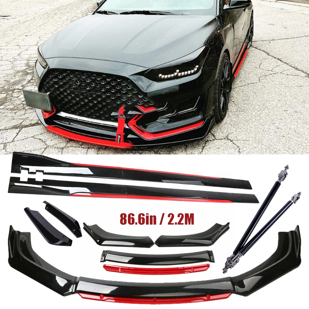 ackage 1. Front Bumper Lip Spoiler Splitter(5pcs) This front bumper lip splitter is fit for most models with front bumper size around 1750mm~1950mm. Feature: -Direct Fit. -Easy install and durable use. -Great quality and great Fitment. -Correct Connector No cutting or splicing. -Strict quality control standards to Build and test. -It'll give you a sporty look without making it too aggressive. -Light in weight and enduring, different optical line comes from different points of view. *Instruction Not Included, Professional Installation Is Highly Recommended.* Specification: -Type:Front Lip Chin Bumper Body Kit -Material:ABS -Color: Glossy Black +Red (as pictures show) -Placement on Vehicle:Front;;Lower -Fitment Type:Performance/Custom This front bumper lip body kit is suitable for most small cars and simple. And the flanks on both sides can be adjusted to make it more suitable for the width of the front of your car. Package 2. 2 x 86.6" Side Skirt Extension ( 6pcs ) Specification: Condition: 100% Brand New and High Quality Type: Car Body Side Skirts Material: Made of high quality PP plastic, Durable Color: Glossy Black +Red (as pictures show) Side Skirt Length: 86.6in / 2.2M Position: Side Skirt Extension Features: Universal modified side skirt for car sedan. While the side skirts don't affect the front ground clearance too much, it enhances the side extension of the in a very pure and exciting way. A Perfect Aftermarket Replacement. Professional Installation Is Highly Recommended. Package Included 3 Rear Lip Specification: Condition: 100% Brand New and High Quality Type: Car Body Rear Lip Material: Made of high quality PP plastic, Durable Color: Glossy Black (as pictures show) Surface Finish: Glossy Black Style Rear Lip Size:48cm/19“ Placement on Vehicle: Left, Right Package Included 4 2pcs Splitter Rods Material: premium quality aluminum alloy The length can be adjustable from 8" to 11" Fitment: Universal Note: Require drilling holes into the bumper lip diffuser to attach safely to the vehicle. Package Includes: 4 pcs /set Front Lip Chin Bumper Body Kits 2 x Side Skirts 2 x Rear Lip 2 X Splitter Strut Rods 1 x Screws kit Note: Installation instruction is not included, professional installation is recommended. Please allow 1-3CM differs due to manual measurement.