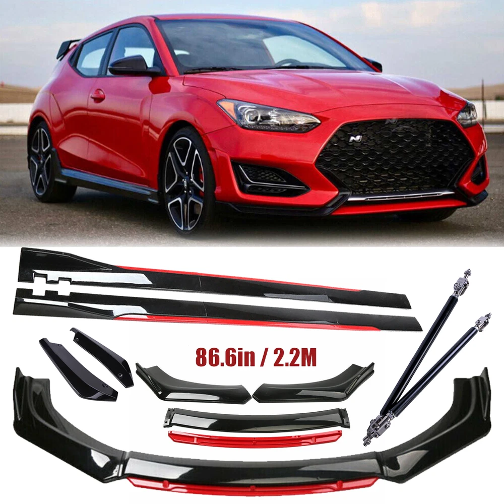 ackage 1. Front Bumper Lip Spoiler Splitter(5pcs) This front bumper lip splitter is fit for most models with front bumper size around 1750mm~1950mm. Feature: -Direct Fit. -Easy install and durable use. -Great quality and great Fitment. -Correct Connector No cutting or splicing. -Strict quality control standards to Build and test. -It'll give you a sporty look without making it too aggressive. -Light in weight and enduring, different optical line comes from different points of view. *Instruction Not Included, Professional Installation Is Highly Recommended.* Specification: -Type:Front Lip Chin Bumper Body Kit -Material:ABS -Color: Glossy Black +Red (as pictures show) -Placement on Vehicle:Front;;Lower -Fitment Type:Performance/Custom This front bumper lip body kit is suitable for most small cars and simple. And the flanks on both sides can be adjusted to make it more suitable for the width of the front of your car. Package 2. 2 x 86.6" Side Skirt Extension ( 6pcs ) Specification: Condition: 100% Brand New and High Quality Type: Car Body Side Skirts Material: Made of high quality PP plastic, Durable Color: Glossy Black +Red (as pictures show) Side Skirt Length: 86.6in / 2.2M Position: Side Skirt Extension Features: Universal modified side skirt for car sedan. While the side skirts don't affect the front ground clearance too much, it enhances the side extension of the in a very pure and exciting way. A Perfect Aftermarket Replacement. Professional Installation Is Highly Recommended. Package Included 3 Rear Lip Specification: Condition: 100% Brand New and High Quality Type: Car Body Rear Lip Material: Made of high quality PP plastic, Durable Color: Glossy Black (as pictures show) Surface Finish: Glossy Black Style Rear Lip Size:48cm/19“ Placement on Vehicle: Left, Right Package Included 4 2pcs Splitter Rods Material: premium quality aluminum alloy The length can be adjustable from 8" to 11" Fitment: Universal Note: Require drilling holes into the bumper lip diffuser to attach safely to the vehicle. Package Includes: 4 pcs /set Front Lip Chin Bumper Body Kits 2 x Side Skirts 2 x Rear Lip 2 X Splitter Strut Rods 1 x Screws kit Note: Installation instruction is not included, professional installation is recommended. Please allow 1-3CM differs due to manual measurement.