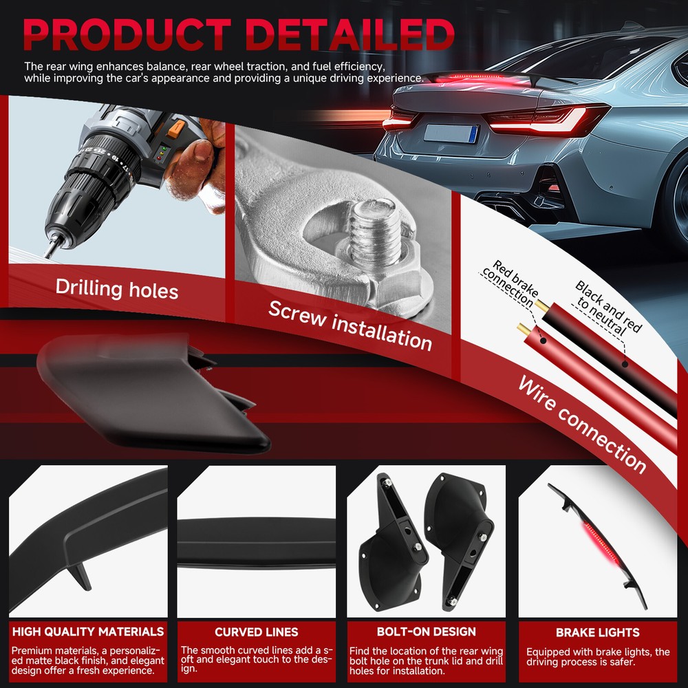 For Infiniti G35 G37 Q50 52" Matte Black Rear Trunk GT Spoiler Wing w/LED Light Specification Material: High Quality ABS Plastic Color: Black Fitment Type: Performance / Custom Placement on Vehicle: Rear Feature Wide Application: The adjustable universal spoiler wing has broad compatibility with various vehicle models. This spoiler can be installed on nearly any sedan with a flat trunk surface. Exquisite Design: This finely crafted wing spoiler significantly enhances handling and resilience. Leveraging aerodynamic principles, the tail spoiler imparts extra downforce while minimising drag, thereby optimising performance and enhancing vehicle stability, ensuring an improved driving experience. Easy Installation: Featuring a Bolt-On Design for straightforward assembly, all necessary components are included. Additional parts are unnecessary. However, supplementary drilling is required. Note that no installation guide is provided; professional installation is strongly advised. Buy With Confidence: The package includes a 3-piece Rear Trunk Spoiler Wing (complete with all hardware illustrated). Should you have any inquiries regarding our products or your purchase, please feel free to reach out to us. Parcel Included 1 x 52" Rear Boot Spoiler Wing Set of Screws •We accepted Online Payment ONLY •We will ship your order within 24 hours after receiving your verified payment (Excluding Weekends and Public Holidays) •The estimated delivery time is within 3-7 working days(not including the weekend). •United States:3-5 working days(not including the weekend) •If you fail to receive over 7 days, please contact us and we will try our best to help •Return items must not be used or have any sign of abuse or intentional damage. •Buyer is responsible for all return shipping charges. •We reserve the right not to refund S&H when the item has been posted. We are a company run business with more than 10 years experience in whole sale of quality Motorcycle And Car Parts & Accessories Specification Material: High Quality ABS Plastic Color: Black Fitment Type: Performance / Custom Placement on Vehicle: Rear Feature Wide Application: The adjustable universal spoiler wing has broad compatibility with various vehicle models. This spoiler can be installed on nearly any sedan with a flat trunk surface. Exquisite Design: This finely crafted wing spoiler significantly enhances handling and resilience. Leveraging aerodynamic principles, the tail spoiler imparts extra downforce while minimising drag, thereby optimising performance and enhancing vehicle stability, ensuring an improved driving experience. Easy Installation: Featuring a Bolt-On Design for straightforward assembly, all necessary components are included. Additional parts are unnecessary. However, supplementary drilling is required. Note that no installation guide is provided; professional installation is strongly advised. Buy With Confidence: The package includes a 3-piece Rear Trunk Spoiler Wing (complete with all hardware illustrated). Should you have any inquiries regarding our products or your purchase, please feel free to reach out to us. Parcel Included 1 x 52" Rear Boot Spoiler Wing Set of Screws PAYMENT •We accepted Online Payment ONLY SHIPPING •We will ship your order within 24 hours after receiving your verified payment (Excluding Weekends and Public Holidays) •The estimated delivery time is within 3-7 working days(not including the weekend). •United States:3-5 working days(not including the weekend) •If you fail to receive over 7 days, please contact us and we will try our best to help Terms of Sale •Return items must not be used or have any sign of abuse or intentional damage. •Buyer is responsible for all return shipping charges. •We reserve the right not to refund S&H when the item has been posted. ABOUT US We are a company run business with more than 10 years experience in whole sale of quality Motorcycle And Car Parts & Accessories On Sep 23, 2025 at 16:55:57 PDT, seller added the following information: