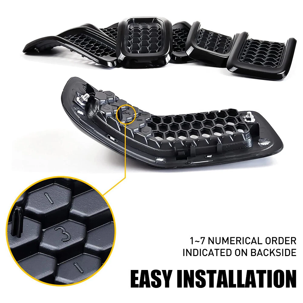 Manufacturer Part Number: Does Not Apply Brand: Unbranded Finish: Painted, Gloss Color: Gloss Black gtin13: Does not apply Fitment Type: Direct Replacement OE/OEM Part Number: 68303626AA, 68303626AB, 68303626AC Interchange Part Number: 68303626AA Performance Part: No Manufacturer Warranty: 2 Years Universal Fitment: No Vintage Part: No Items Included: Honeycomb Mesh Grill Inserts Type: Grille Fitment: For Jeep Cherokee 2014-2018 Year Fitment: 2014 2015 2016 2017 2018 Superseded Part Number: 68303626AB Material: ABS Plastic UPC: Does not apply Style: Honeycomb Placement on Vehicle: Front Features: Durable, Easy Installation, Lightweight Number of Pieces: 7